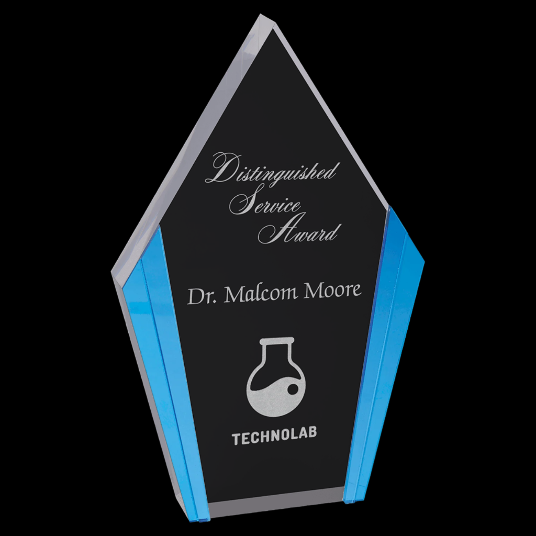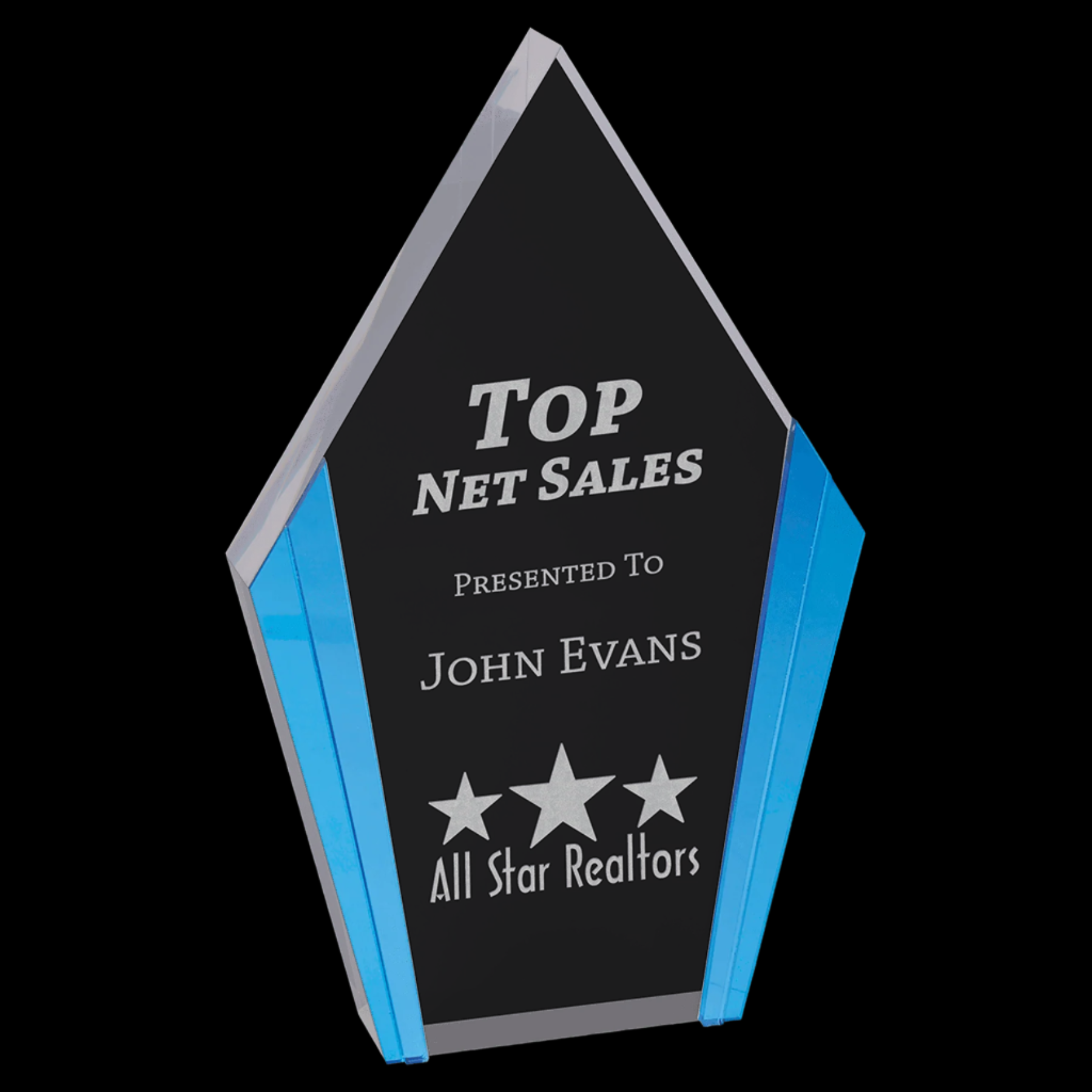 Color Edge Diamond Acrylics feature a sturdy 1" thickness and self-standing design, ensuring durability and ease of display. The clear personalization area provides a pristine surface for customization, while the vibrant blue edges add a distinctive pop of color, enhancing visual appeal and making your design stand out with professional clarity.