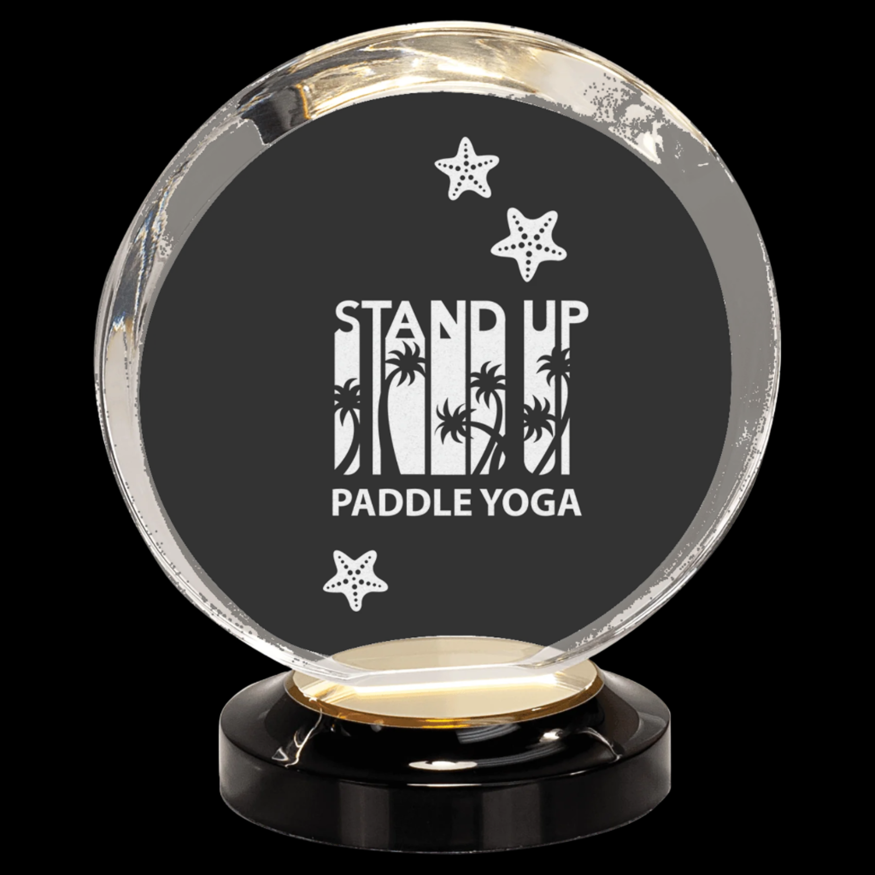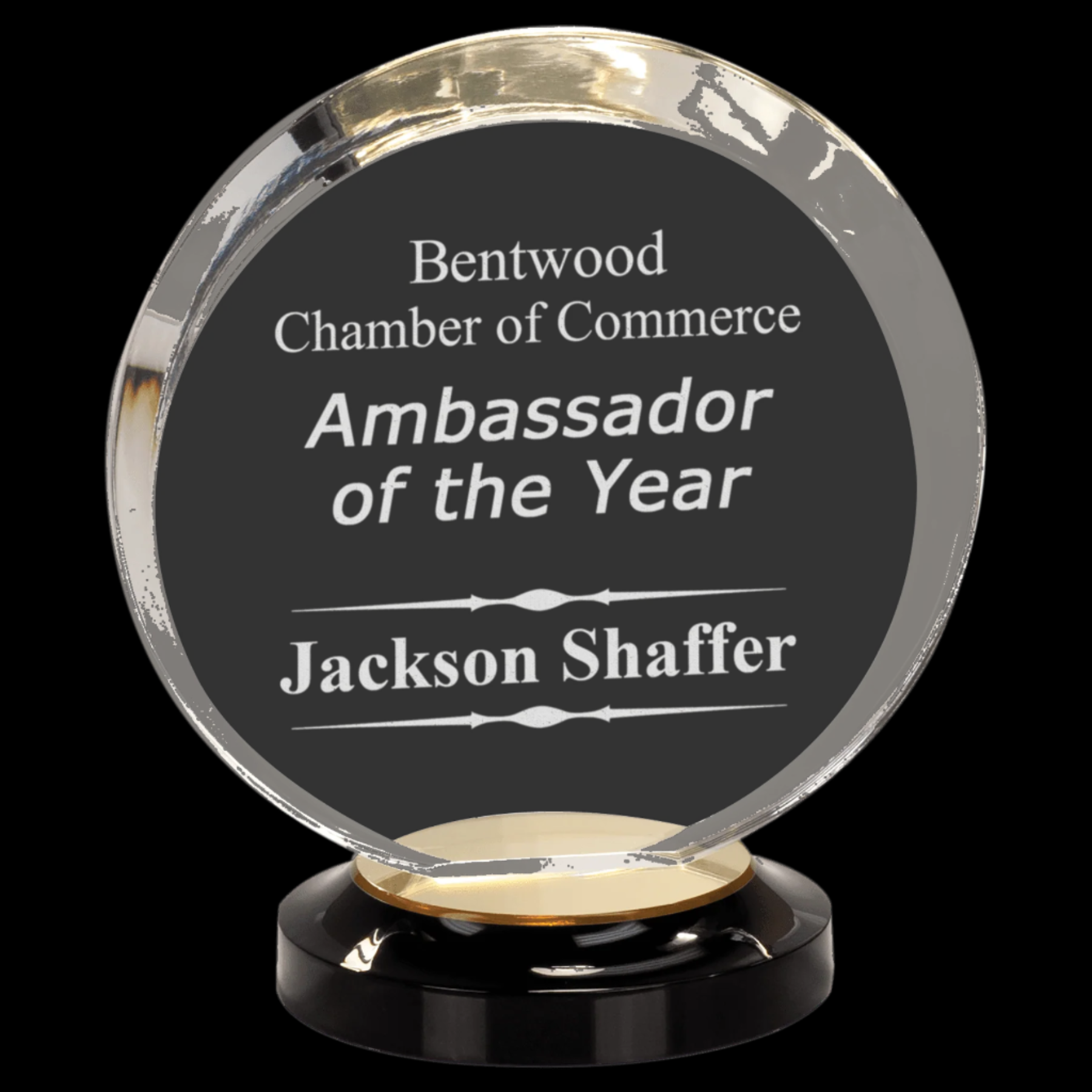 The Gold Halo Acrylic features a .75" clear acrylic circle with an elegant beveled edge, designed to create a distinctive halo effect. It includes a mirrored base that enhances its reflective qualities, making it an ideal choice for sophisticated displays or decorative accents. This combination of clarity and shine offers a refined aesthetic suitable for professional settings.