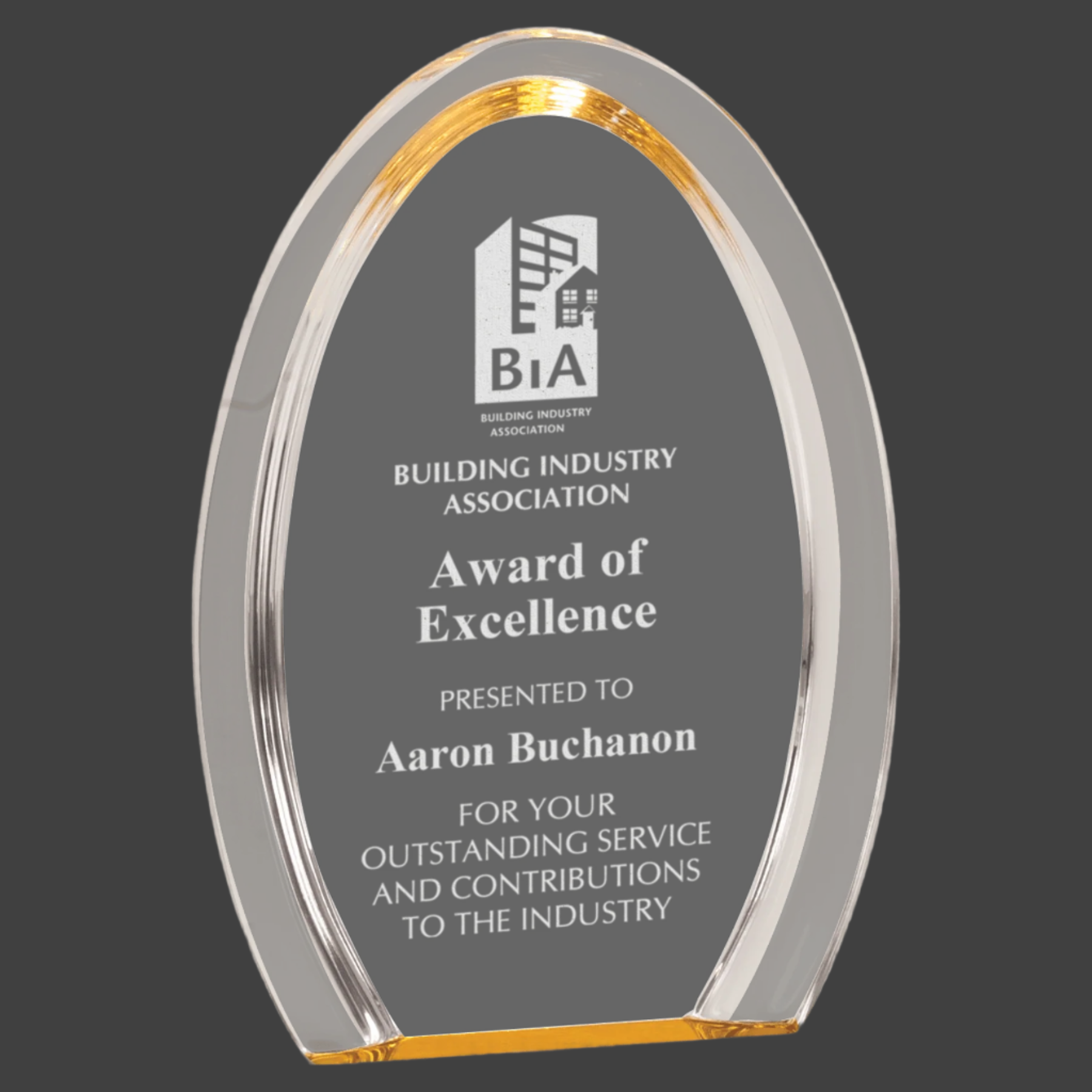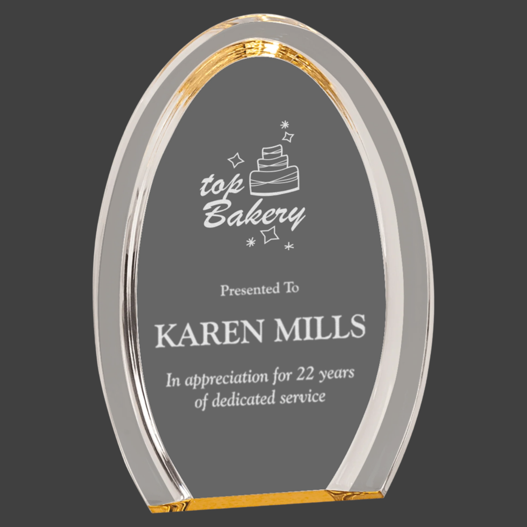 Crafted from 1" thick acrylic, the Gold Oval Halo Acrylic offers durability and a striking visual appeal. Available in multiple styles and colors, this self-standing piece provides versatile options for display or decorative use, combining sturdy construction with elegant design to enhance any setting.