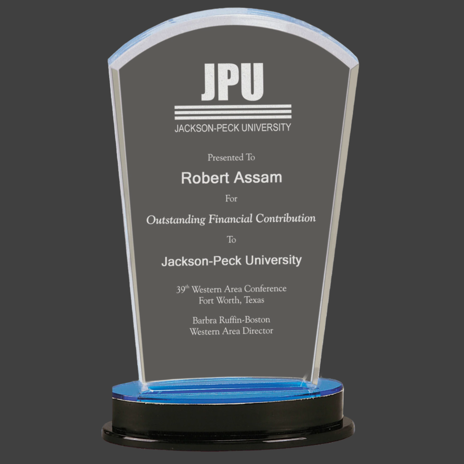 Arch Impress Acrylics Come with a Colored Mirror Base. They are .75" Thick. Height Measurement Includes Base. Available in Multiple Colors and Sizes.