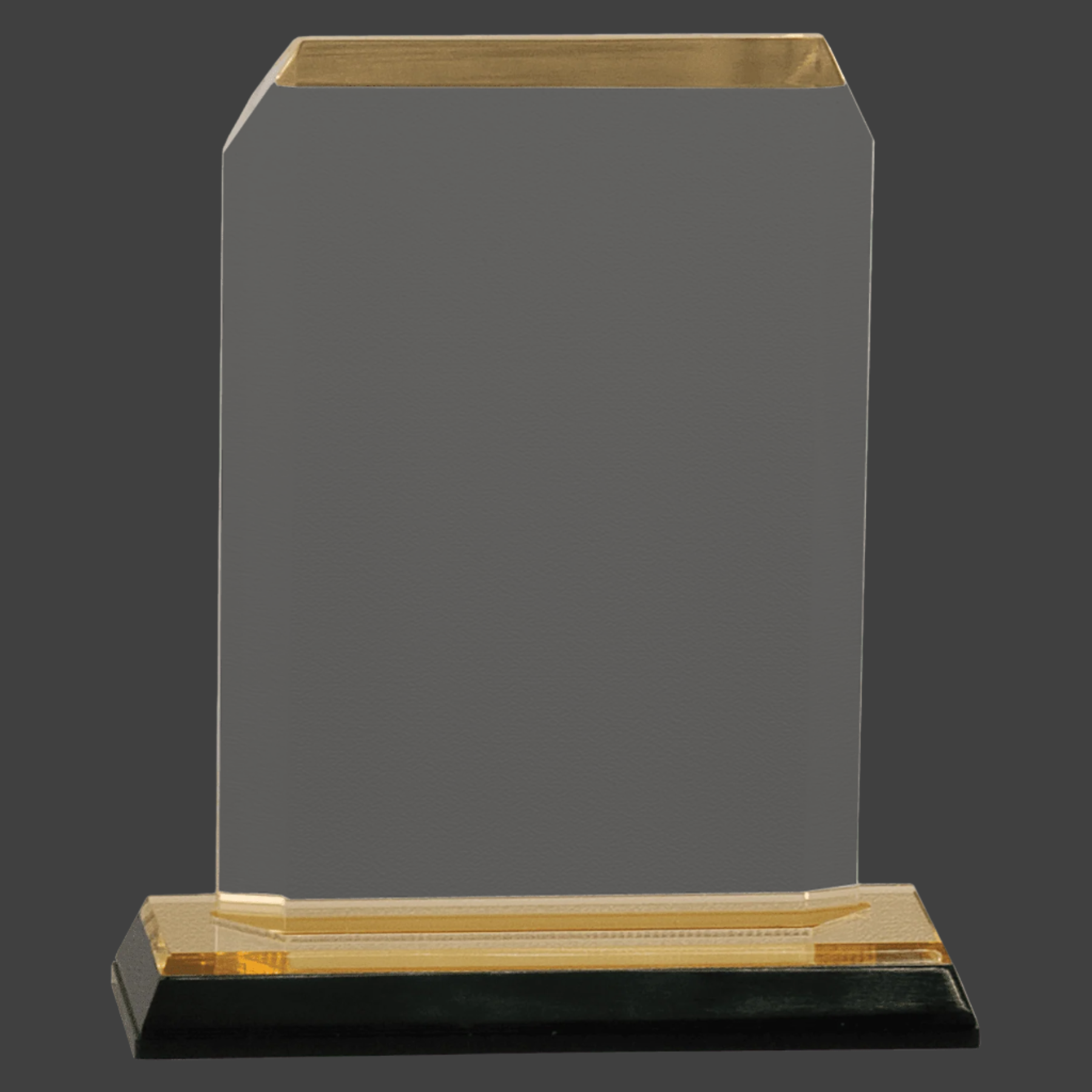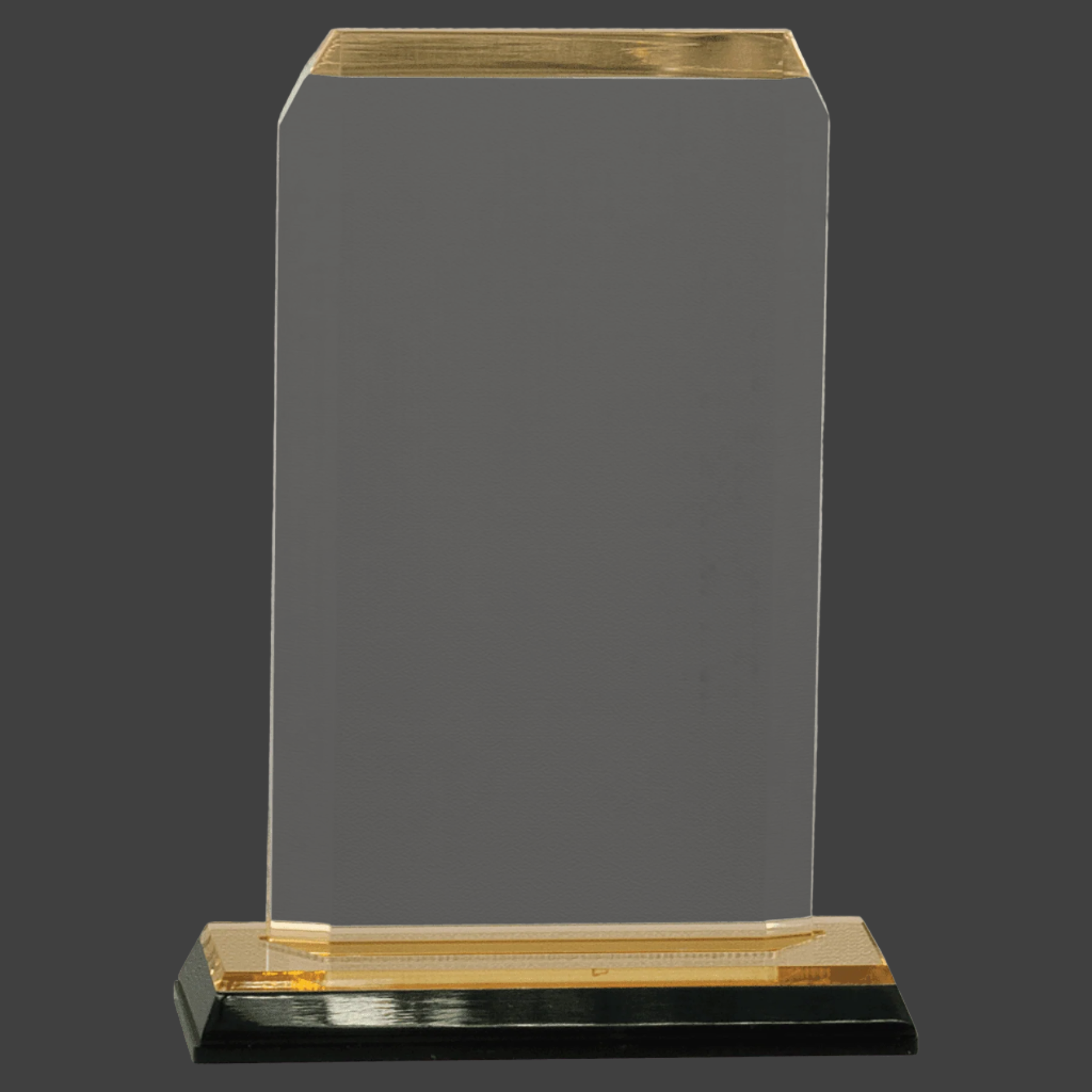 Gold Clipped Corner Impress Acrylics feature a durable 0.5" thickness and include a vibrant colored mirror base that enhances their visual impact. The total height measurement accounts for the base, ensuring accurate sizing. Available in various sizes and colors, these acrylics offer versatile options for professional displays and presentations.