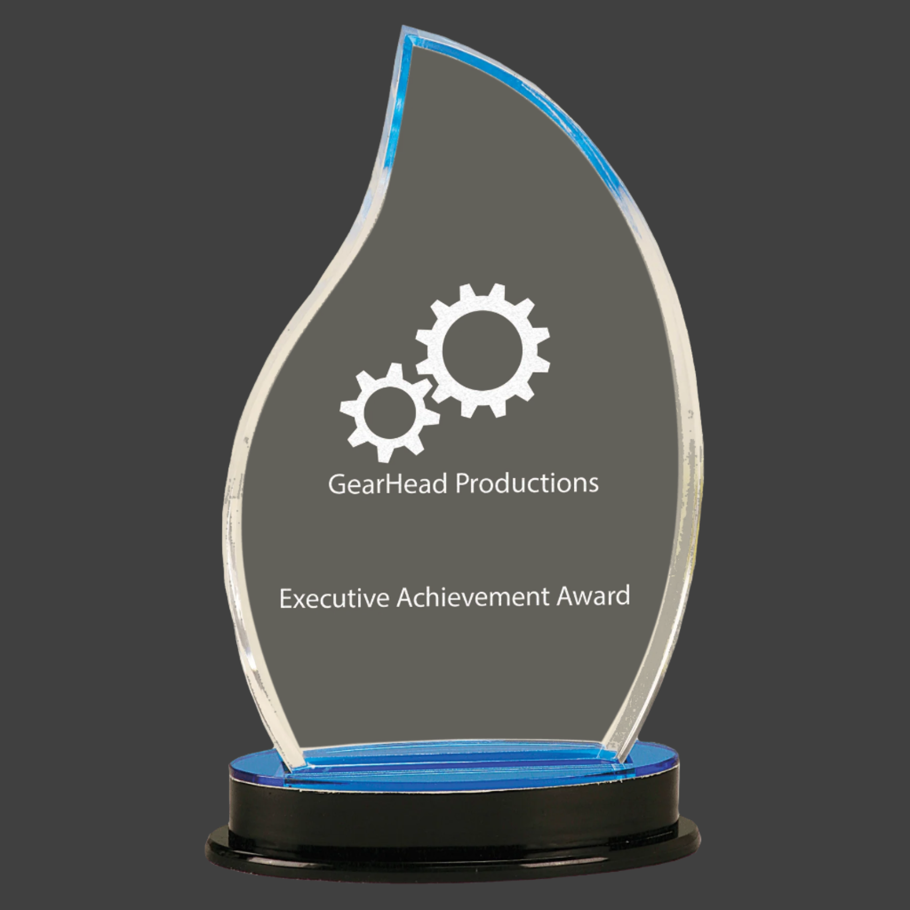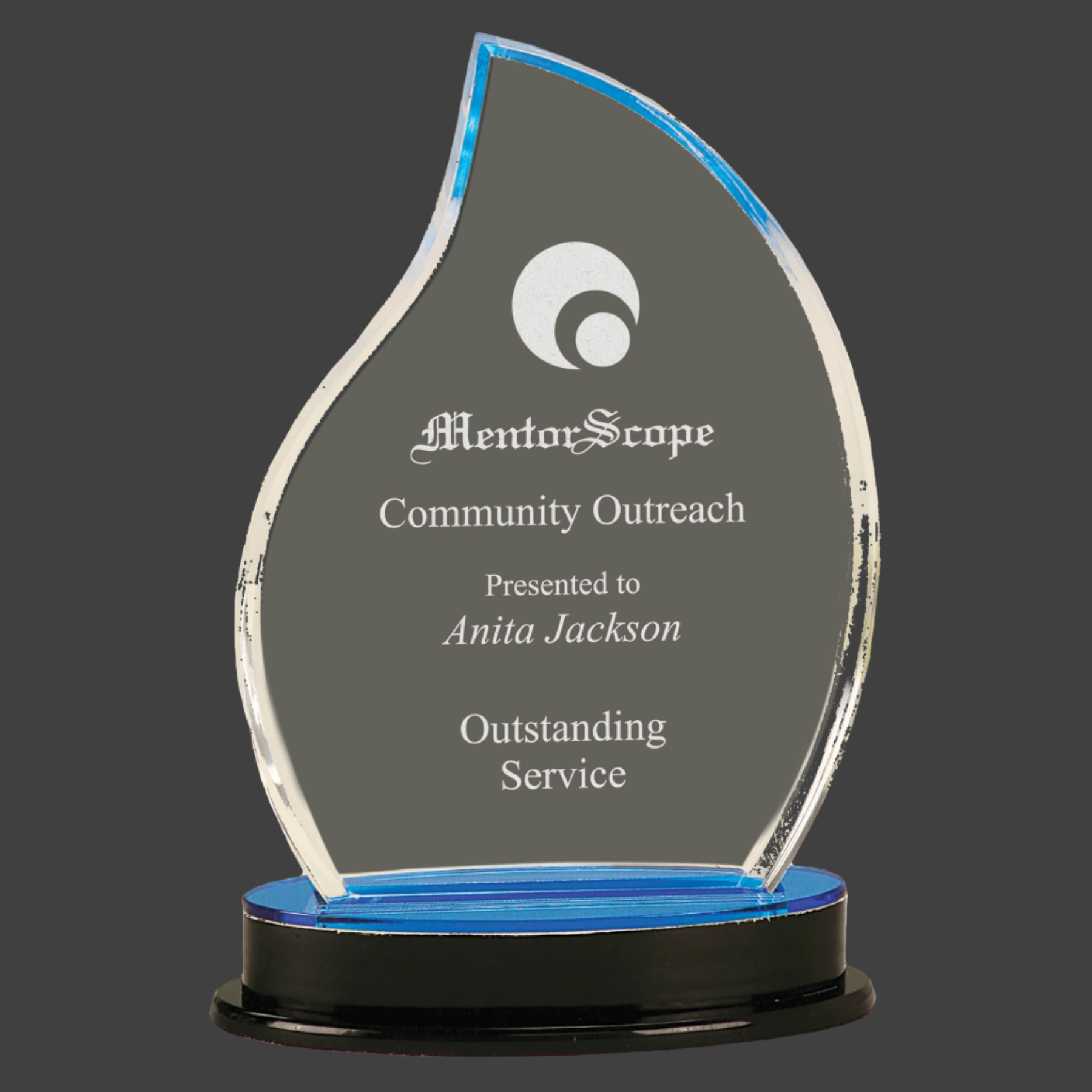 Flame Impress Acrylics Come with a Colored Mirror Base. They are .75" Thick and Size Includes the Base. Available in Multiple Different Sizes and Colors.