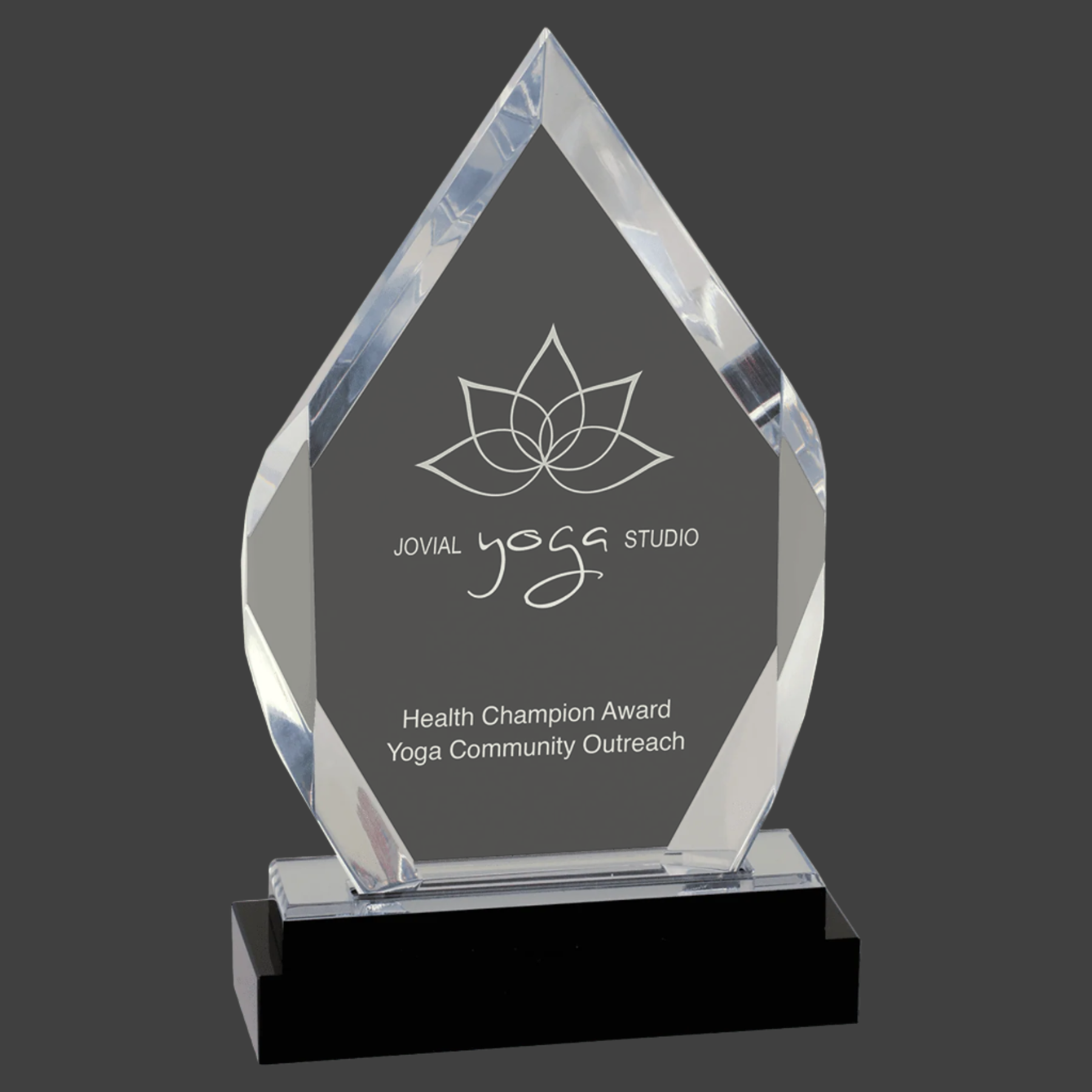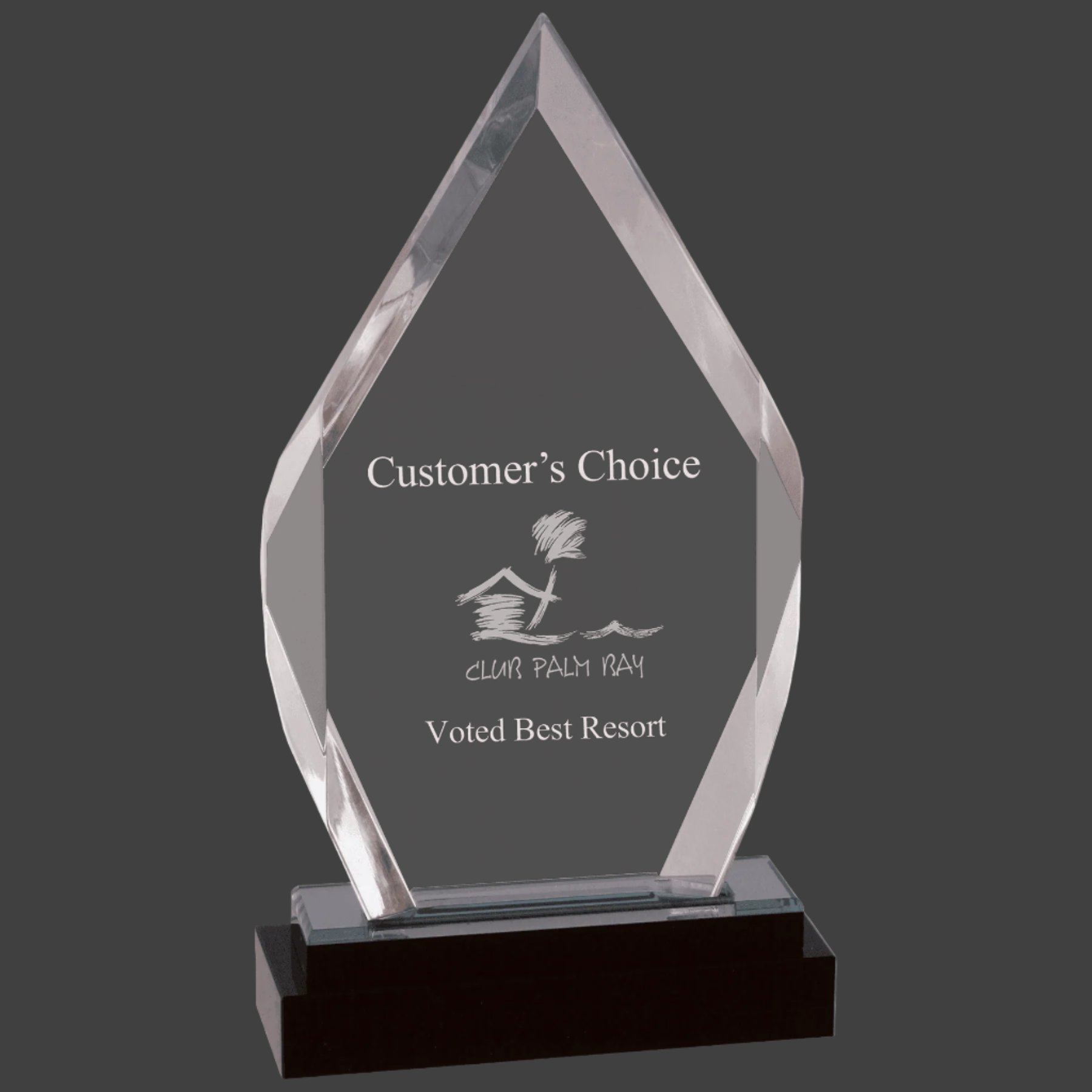 Silver Fusion Diamond Impress Acrylic features a durable 0.75" thick construction with height measurements that include the sleek black glass base. Available in multiple sizes, shapes, and colors, this award combines modern design with sturdy materials, making it an excellent choice for professional recognition displays.