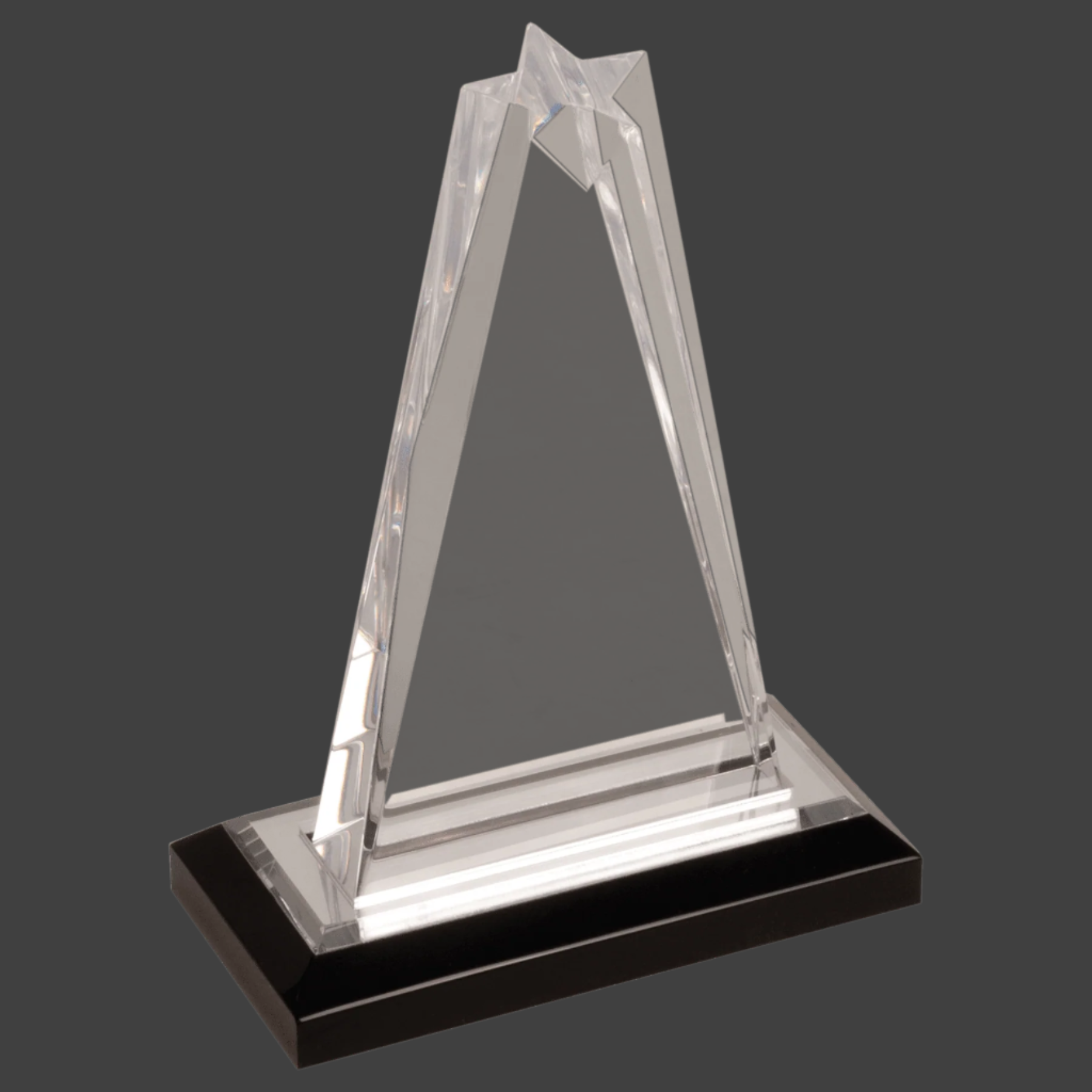 Star Impress Acrylics feature a distinctive colored mirror base and measure 1" thick, with the height including the base. Silver Star Impress Acrylic offers a sleek, reflective surface ideal for professional displays and presentations. Its sturdy construction ensures durability while enhancing visual appeal.