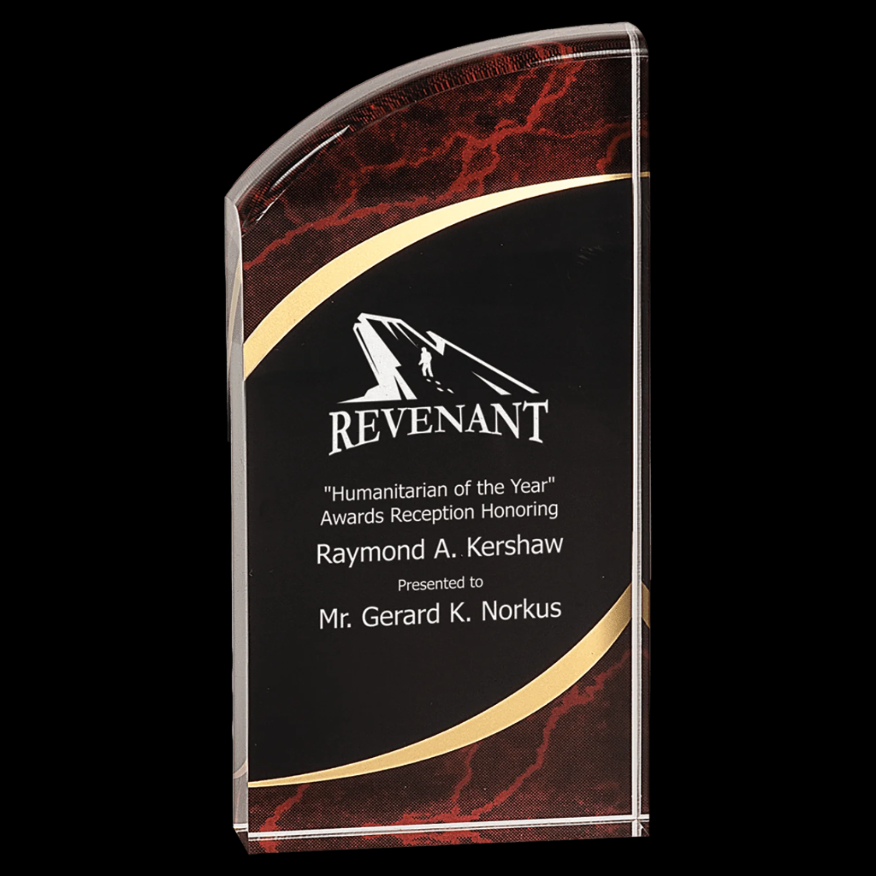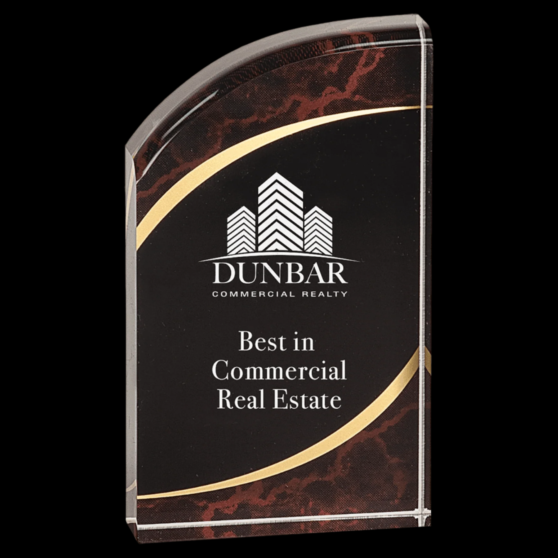 Crafted from 1" thick acrylic, the Red Marble Rounded Acrylic combines durability with an elegant marbleized finish. Its self-standing design ensures stability without additional support, making it ideal for versatile display applications. Available in multiple sizes and colors, this piece offers both aesthetic appeal and functional strength for professional environments.