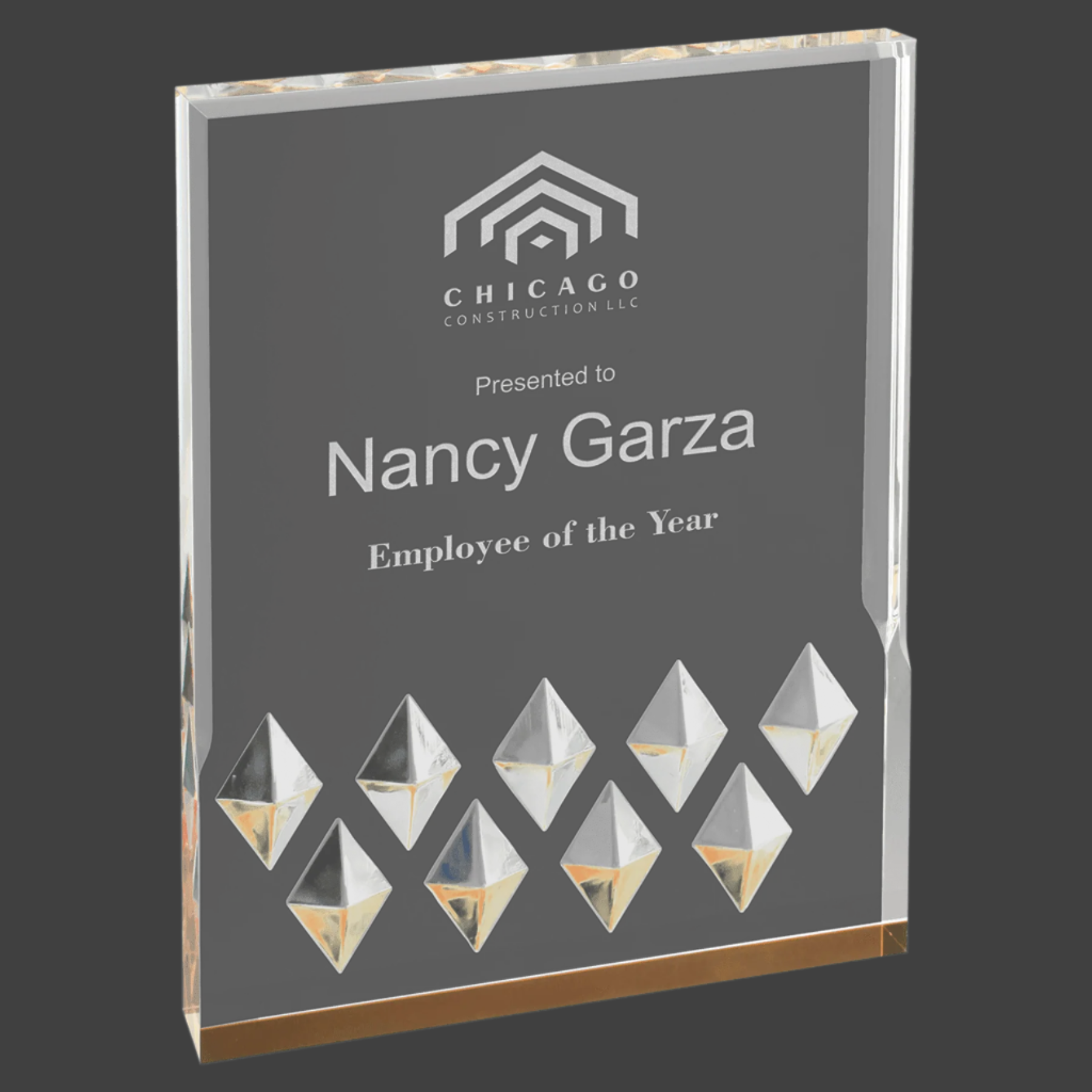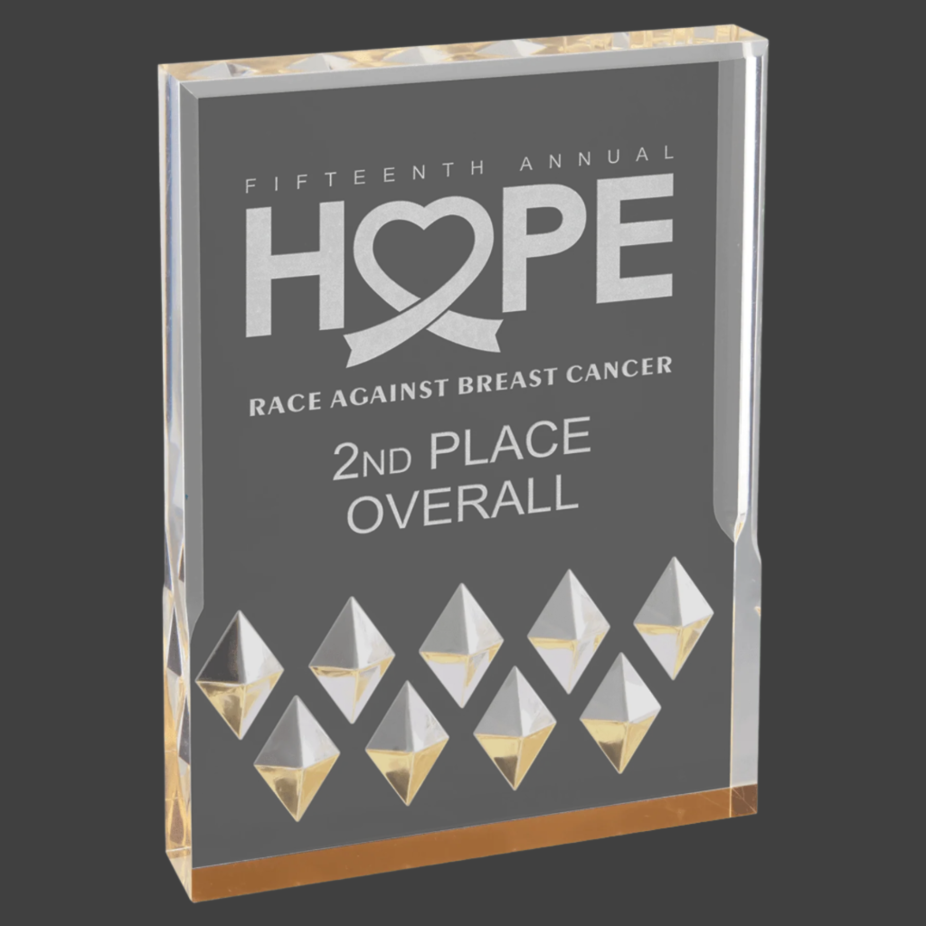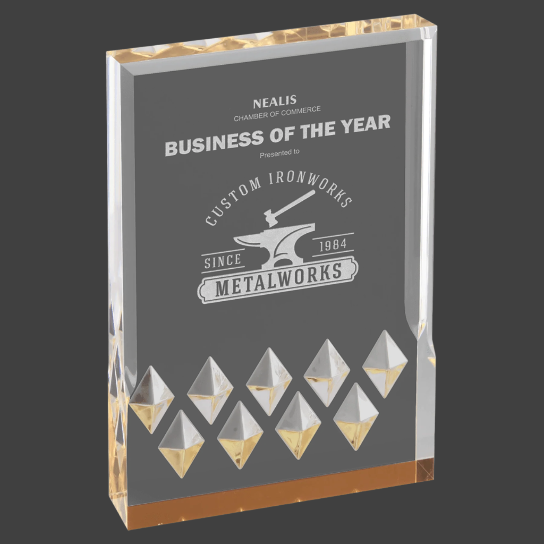 Diamond Mirage Acrylics feature a sturdy 1" thickness and a self-standing design, ensuring durability and ease of display. The gold diamond embellishment enhances their elegance, making them ideal for sophisticated settings. Available in various colors and sizes, these acrylics offer versatile options to suit different design needs.