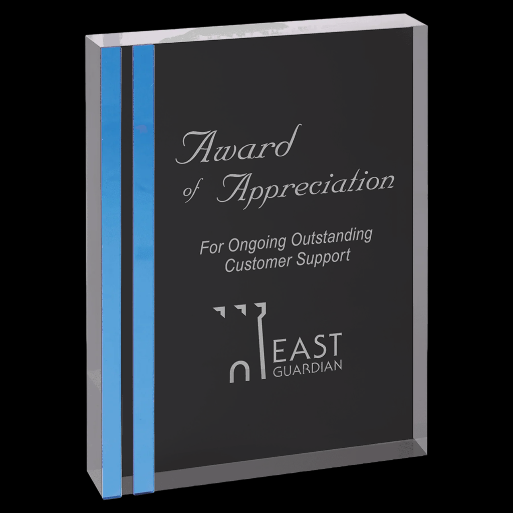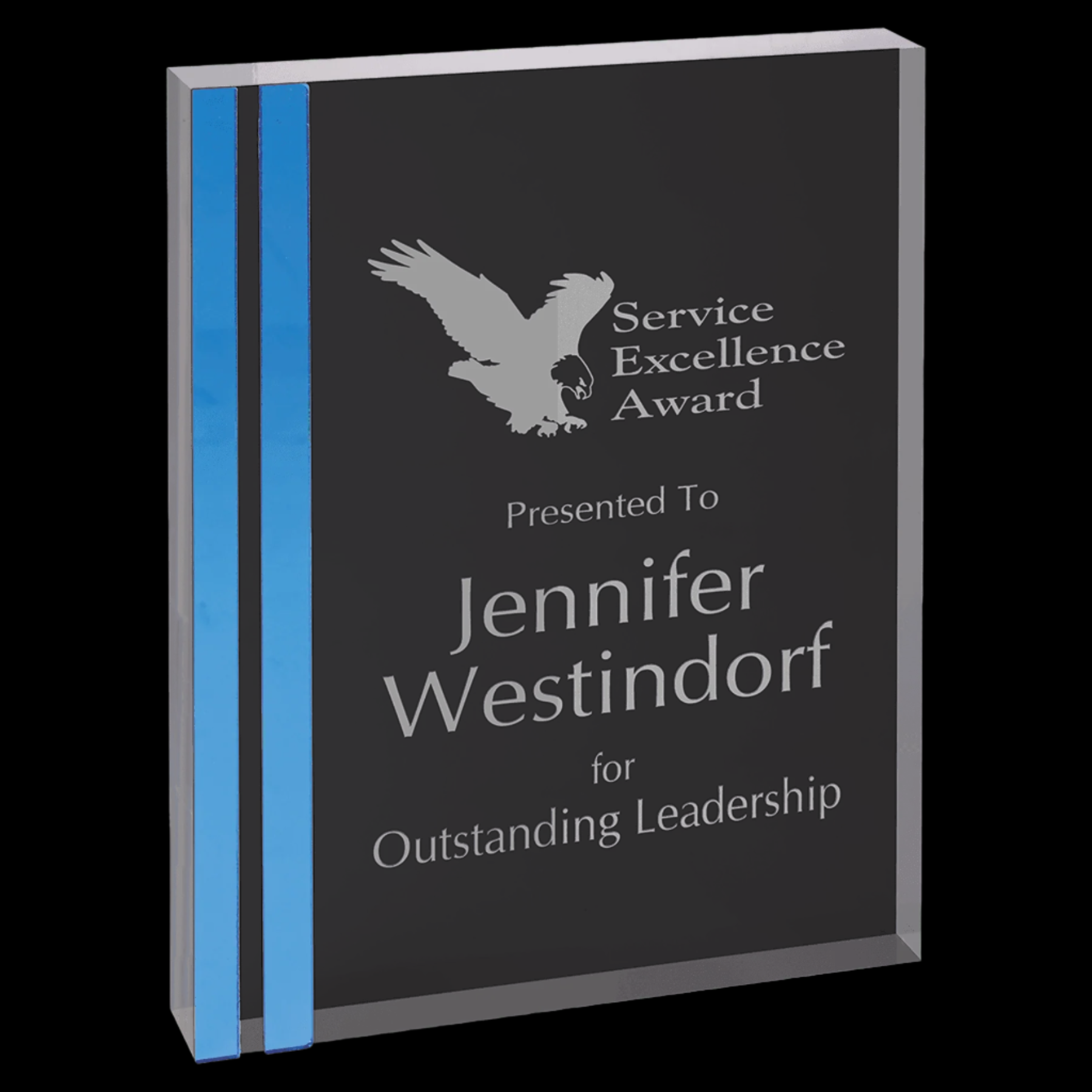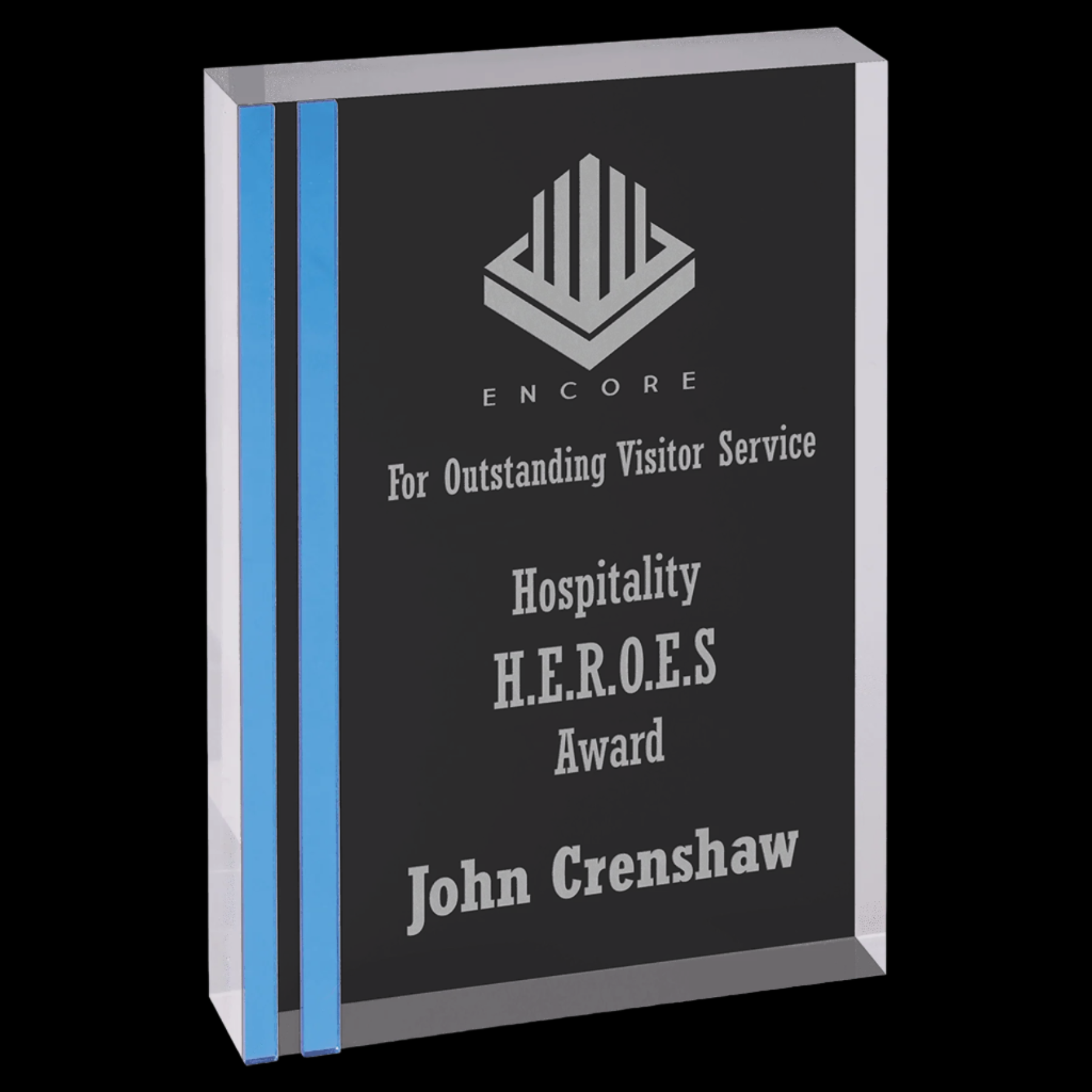 This Rectangle Acrylic features a vibrant blue edge and a clear central area ideal for personalization. At 1" thick, it is self-standing, providing sturdy support and a sleek, modern look. The colored edges add a distinctive pop of color, enhancing any display or signage with professional appeal.