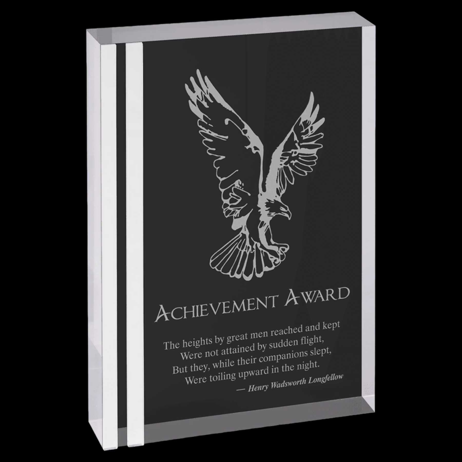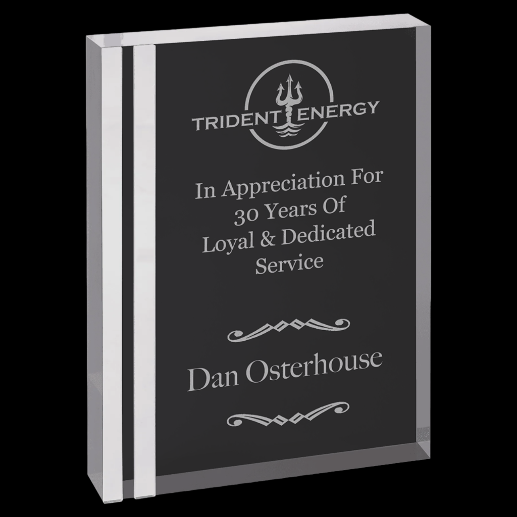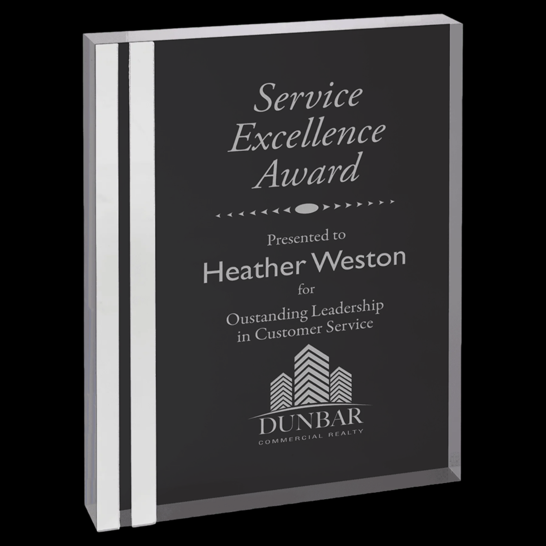 Rectangle Acrylic with Silver Edge features a clear personalization area framed by a sleek, 1-inch thick silver edge that adds a refined touch of color. Designed to stand independently, this durable acrylic piece combines functionality with modern aesthetics, making it ideal for professional displays or personalized signage.