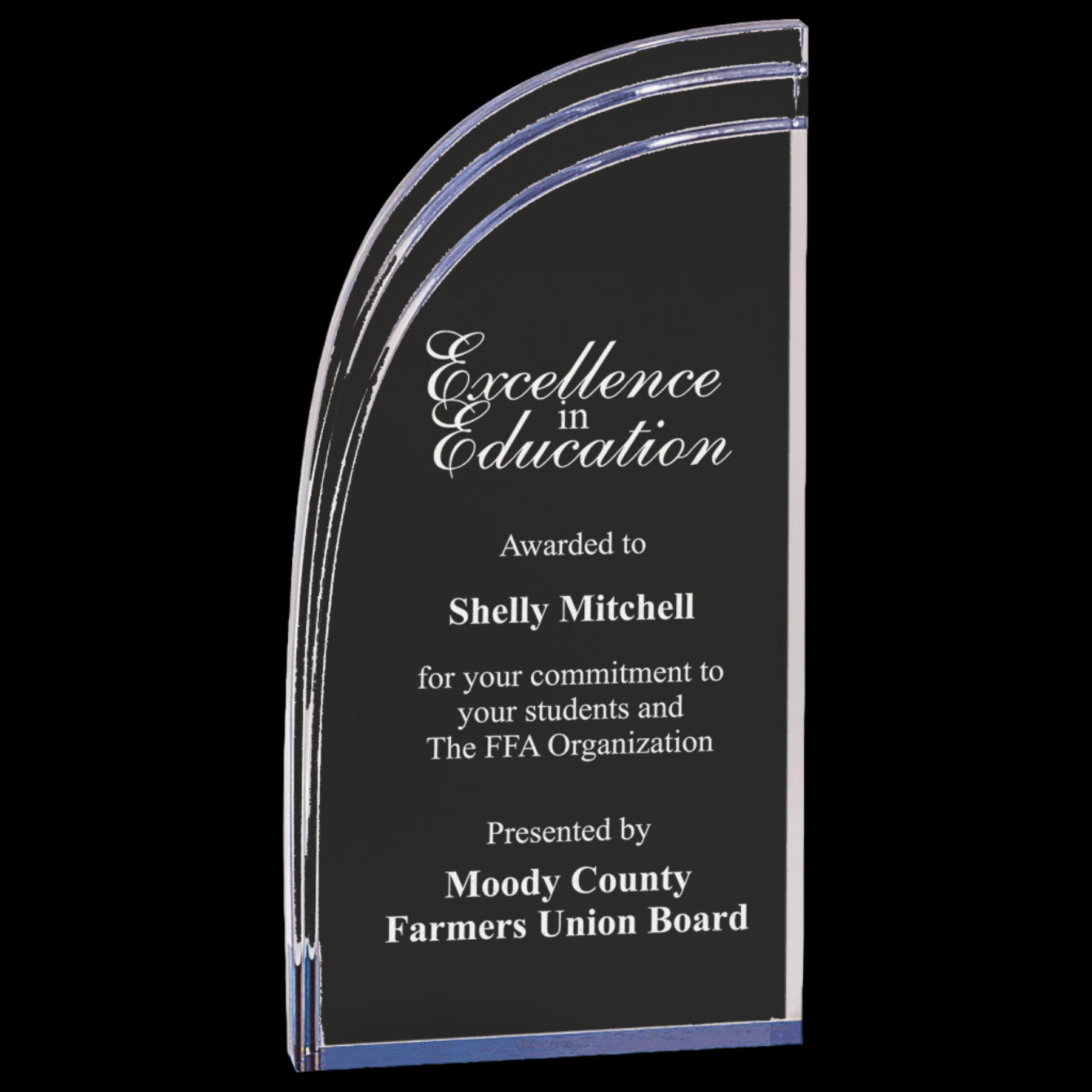 The Blue Wave Acrylic award features a sturdy 1-inch thick self-standing design, combining durability with a sleek, modern aesthetic. Its solid acrylic construction ensures long-lasting display, making it an excellent choice for recognizing achievements with a professional touch.