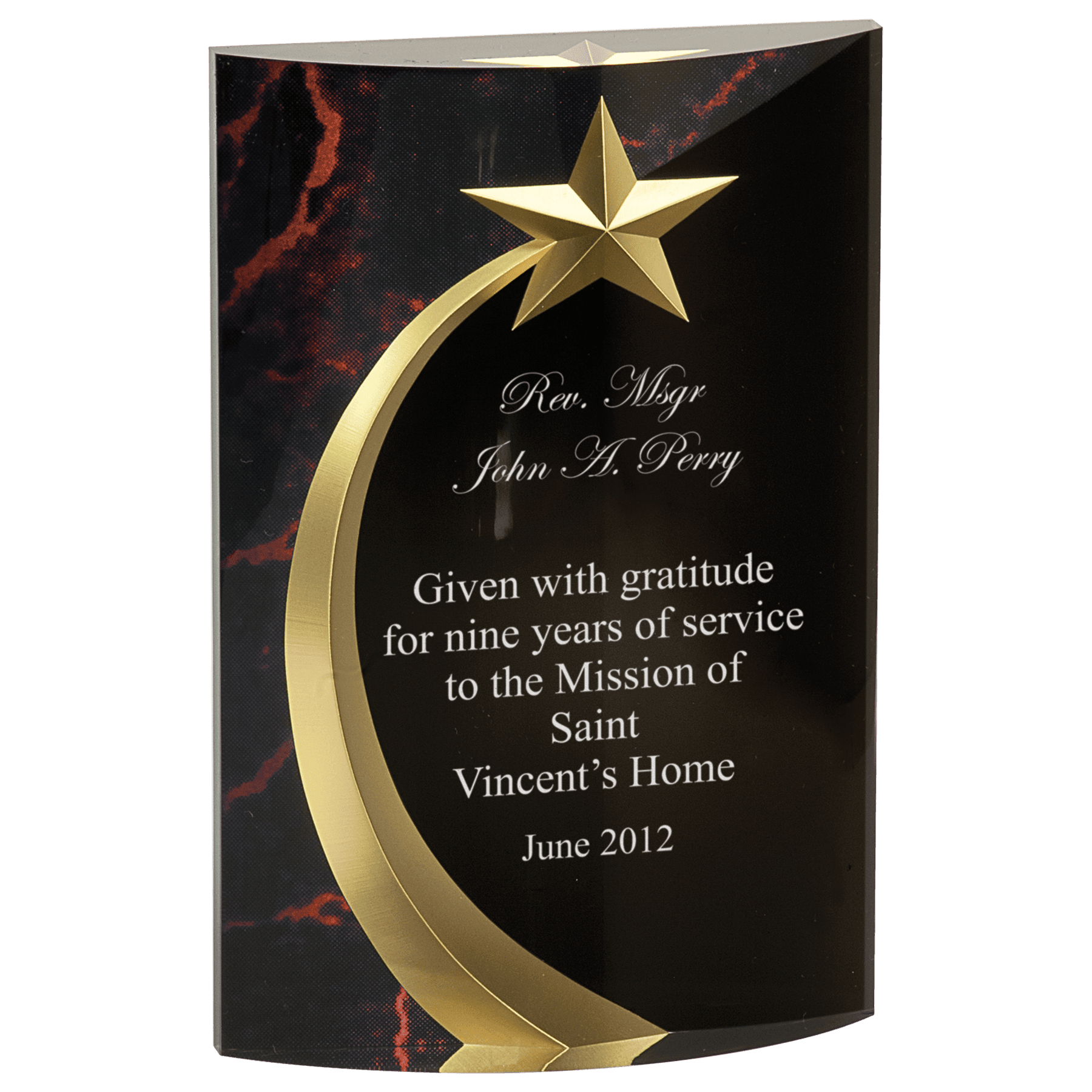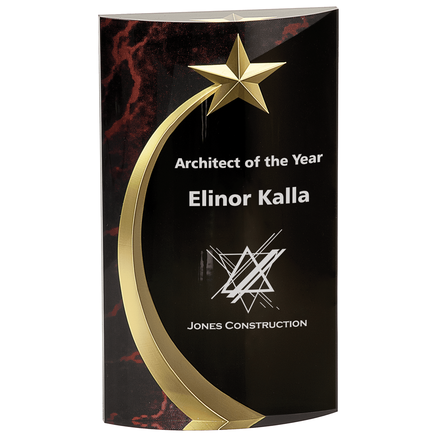 The Red Marble Rounded Shooting Star Acrylic award features a sturdy 1.25" thick design that ensures durability and a premium feel. Its self-standing construction allows for easy display without additional support, making it an ideal choice for recognizing outstanding achievements with elegance and stability.