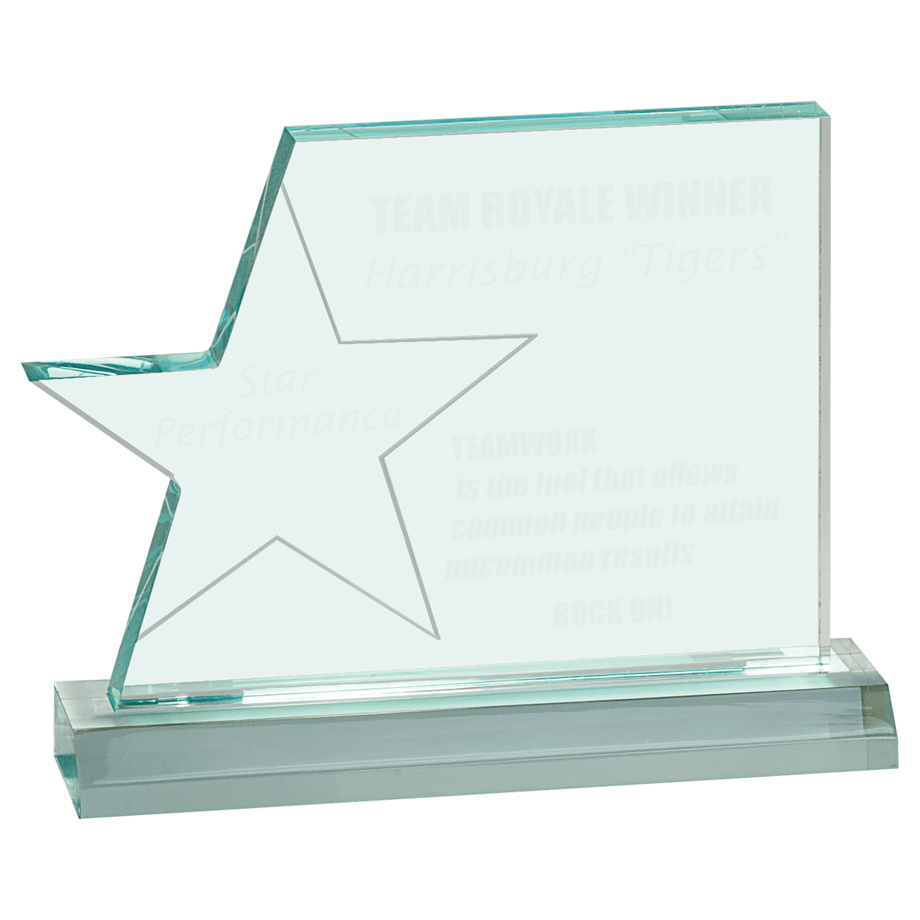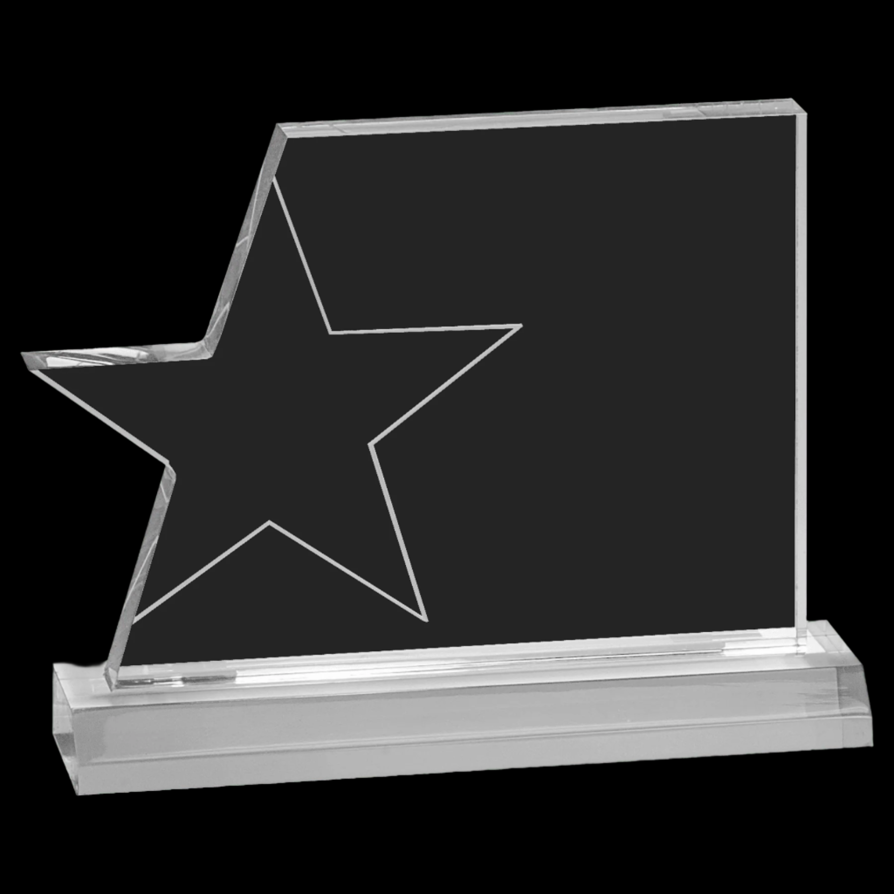 Star Page Acrylic awards are crafted with a durable 0.75" thickness and include a 7.5" base, measuring 7.25" by 5.25". This design ensures a stable and elegant display, making it an excellent choice for professional recognition and awards presentations.