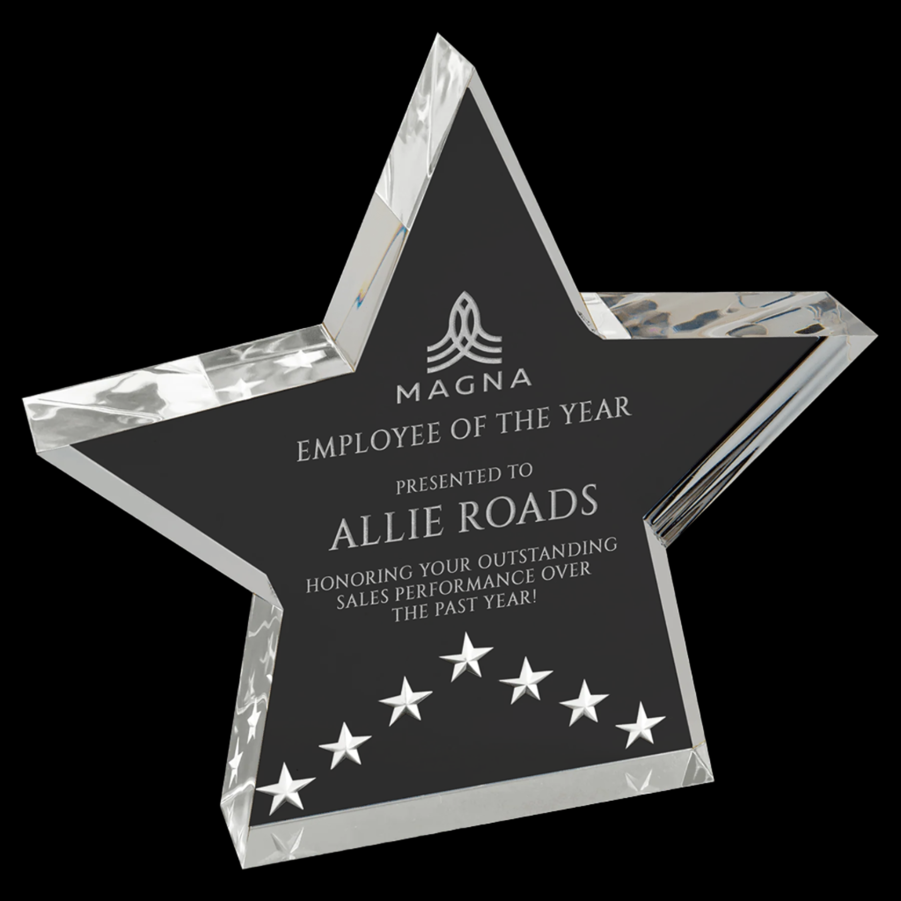 Star Performance Acrylics are expertly crafted, self-standing awards with a substantial 1" thickness, offering both durability and a striking presence. The Silver Star Performer Acrylic combines sleek design with robust construction, making it an ideal choice to recognize outstanding achievements with lasting impact.