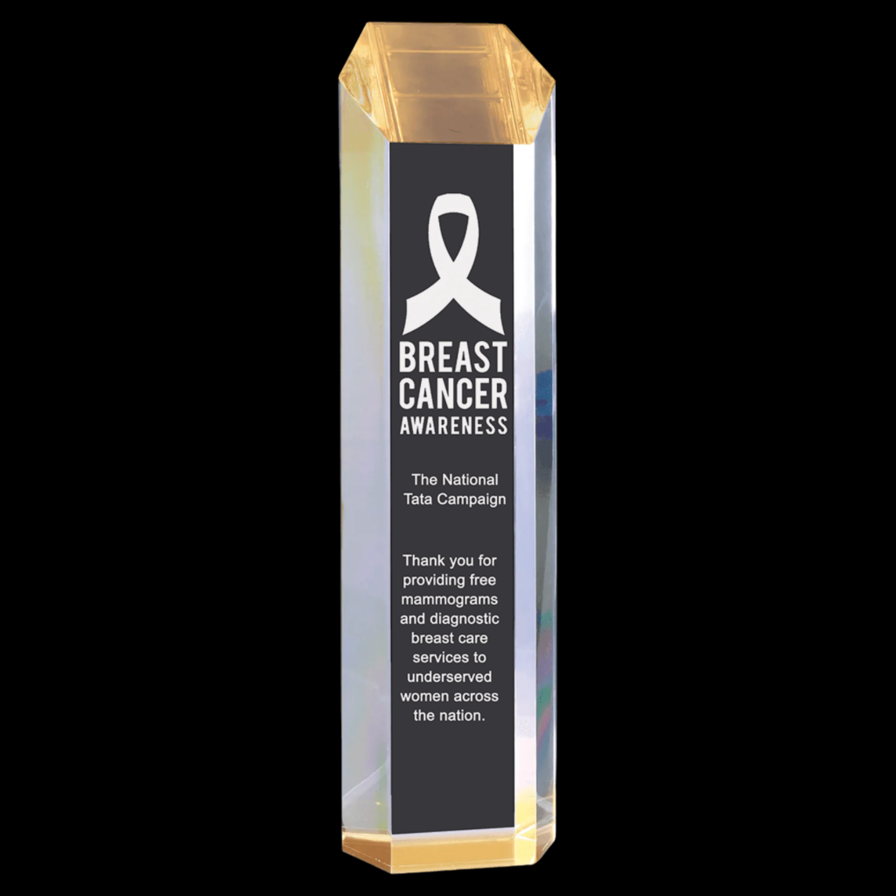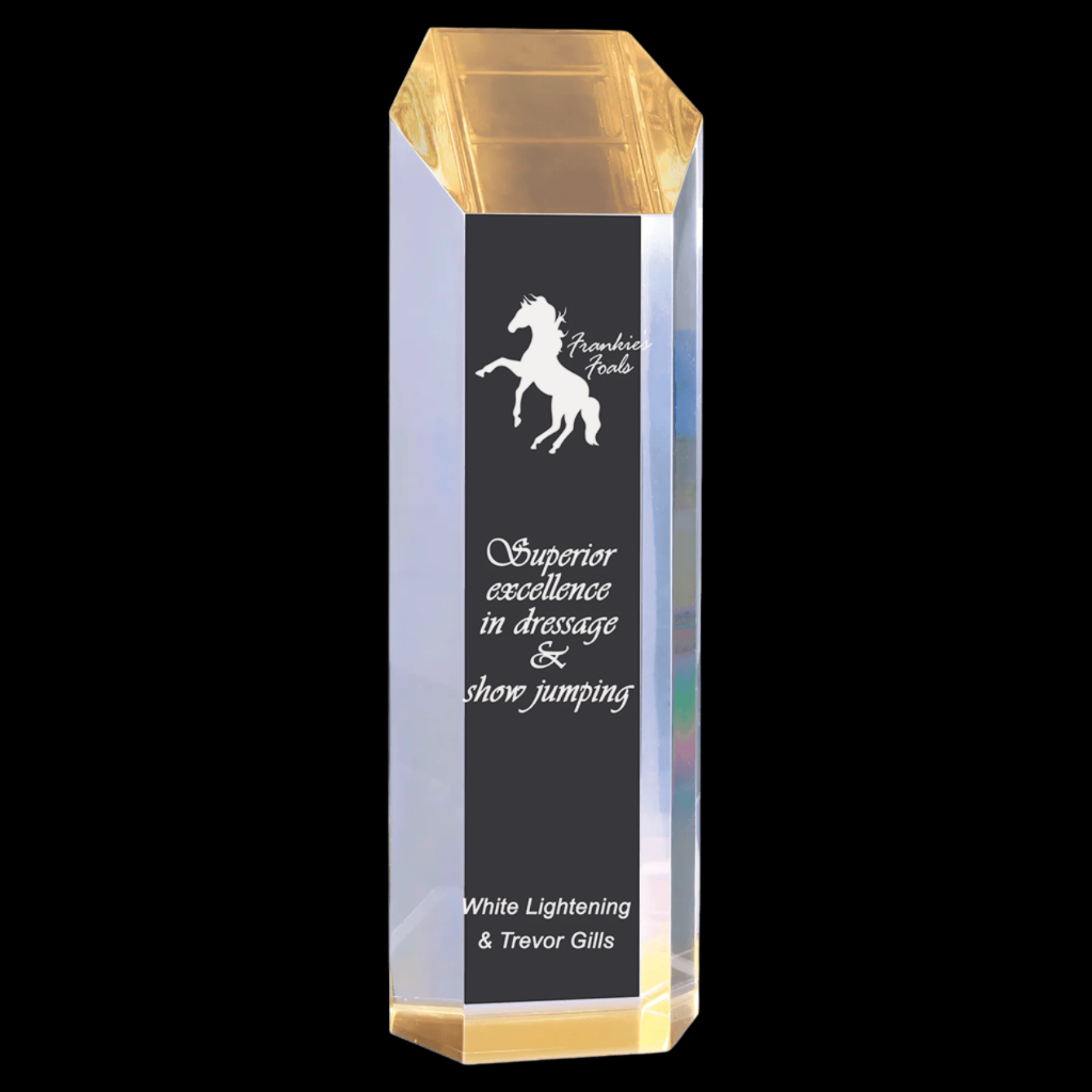 The Gold Tower Acrylic stands 2 inches tall and is designed to be self-supporting, offering a sleek and durable display solution. Its compact size and sturdy construction make it ideal for showcasing items with a professional and polished appearance. Perfect for environments requiring both style and stability.