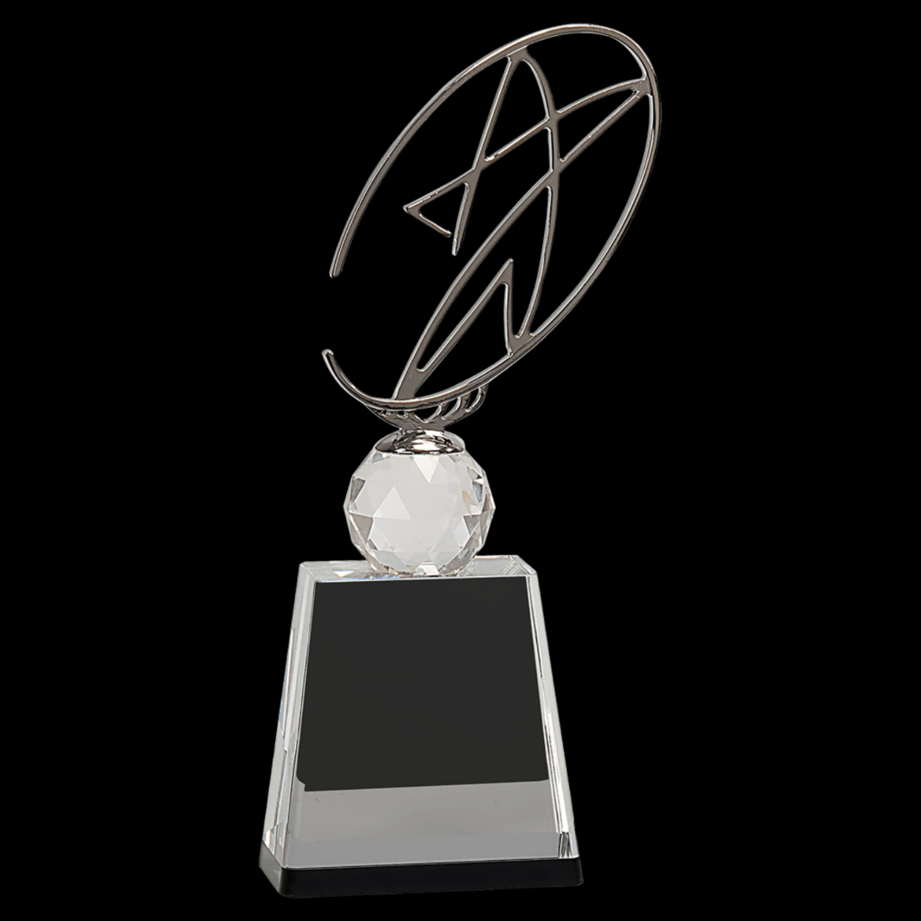 Our Clear/Black Crystal Award features a handcrafted silver metal star mounted within an elegant metal oval, connected to a crystal ball riser and a clear crystal base. The base includes a distinctive black strip that reflects light upward, enhancing the award’s brilliance. Each piece is unique due to its handmade nature and arrives in a lined gift box, making it an exceptional choice for recognizing outstanding achievement with sophistication.