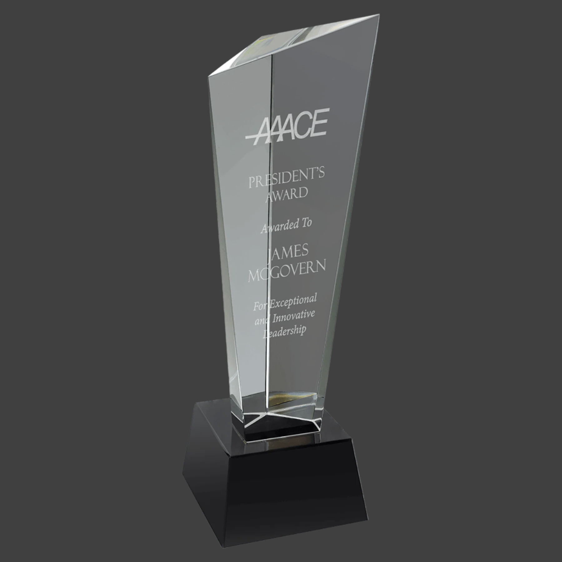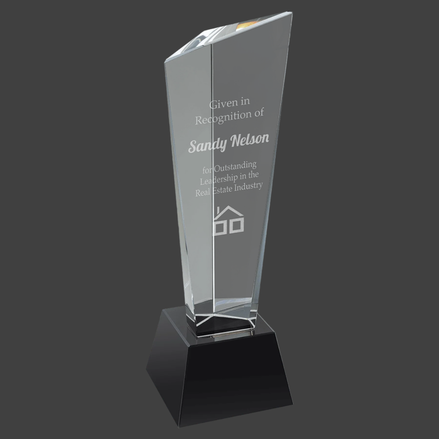 This Crystal 3D Rising Peak features a clear optic design with a flat front and a spacious area for personalization. Its distinctive triangular top rises to a peak, while the beveled edges between the front and back add depth and visual appeal. The black base also provides additional space for customization. Presented in a lined box, this elegant piece makes a distinguished award to honor significant achievements or milestones.