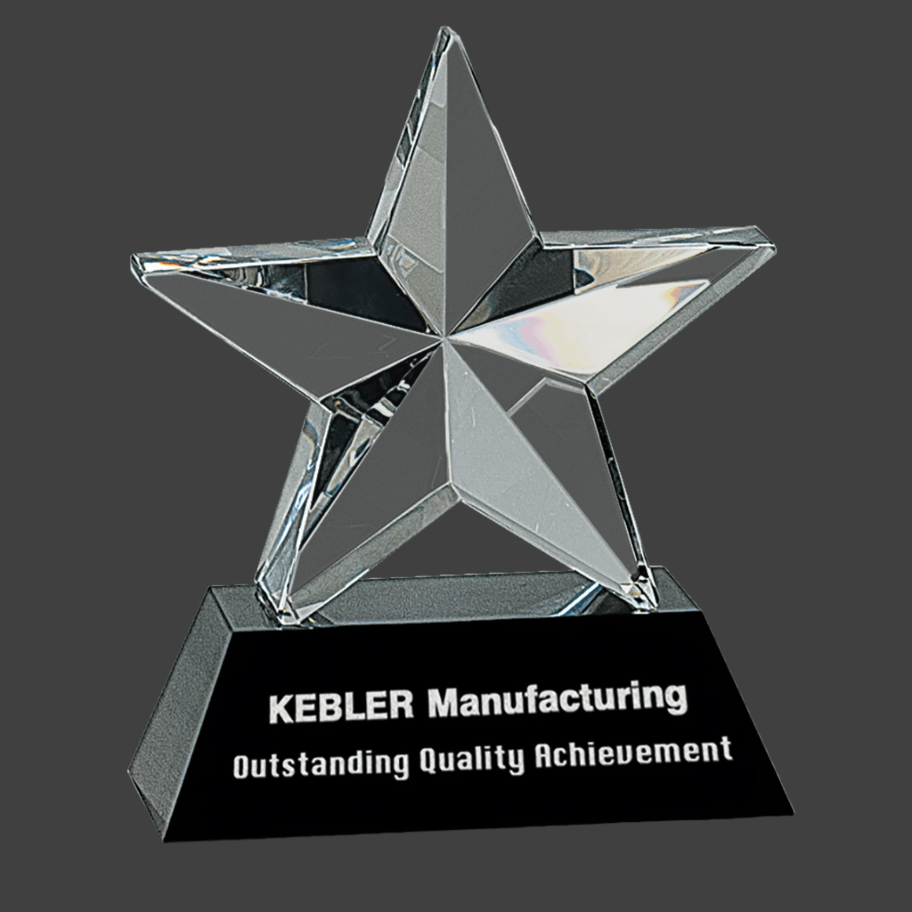 Our 6-inch Crystal 3D Star features a meticulously handcrafted optic crystal star, each piece unique in size and detail. Mounted on a sleek black crystal base, this elegant display captures light beautifully, making it a striking centerpiece. Presented in a lined gift box, it is perfect for distinguished gifting or sophisticated décor.