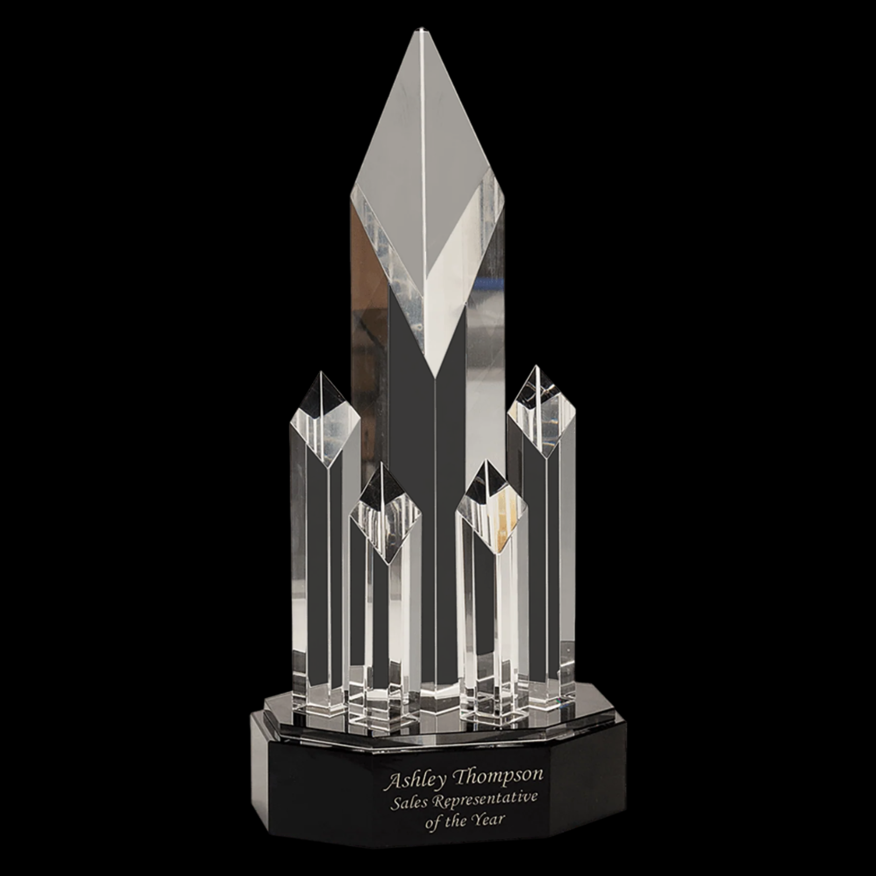 Our Crystal Awards are Handmade and May Vary Slightly in Size. This Optic Crystal Award Had 5 Rising Diamonds That are Free Standing and Mounted to a Black Crystal Base. Packaged in a Lined Gift Box.