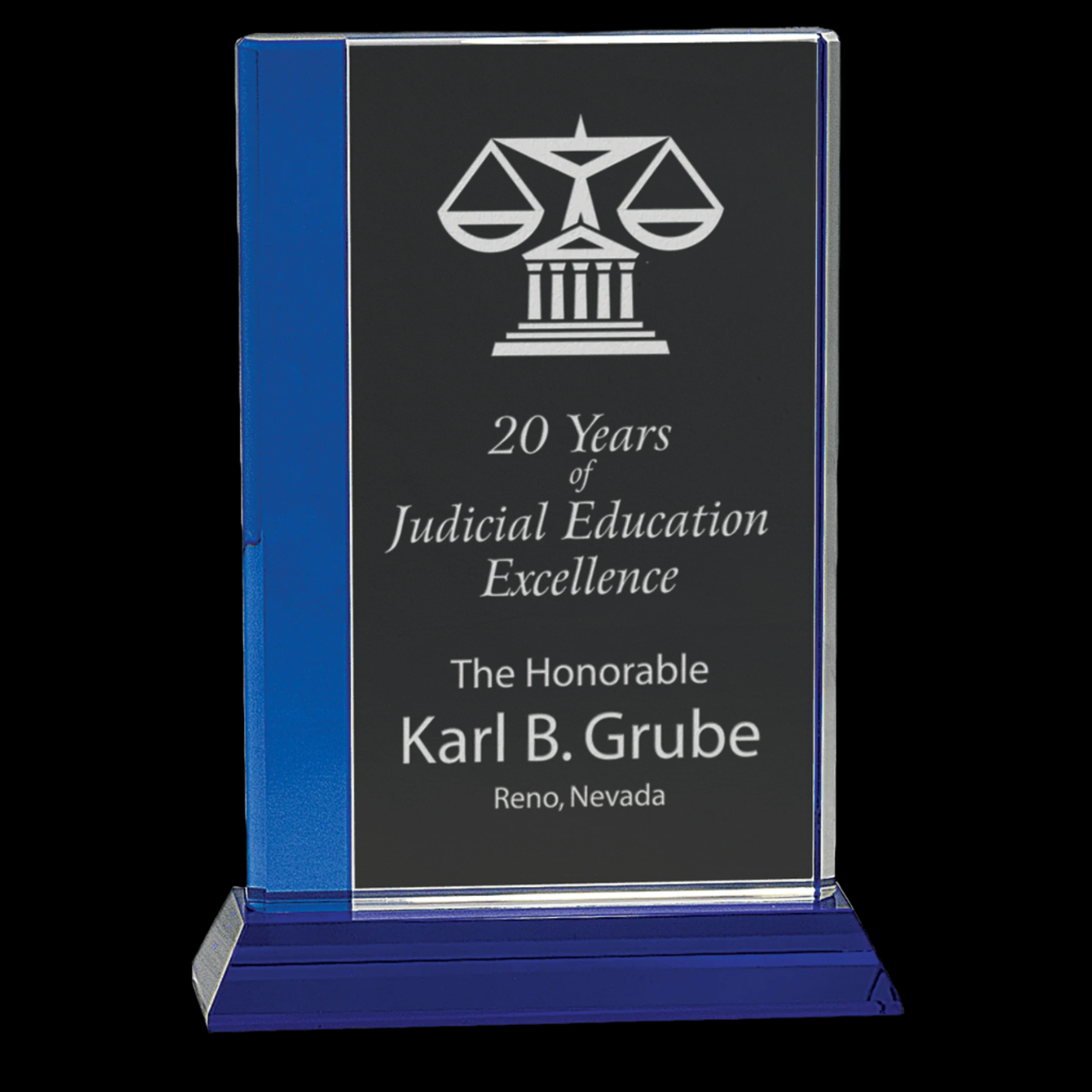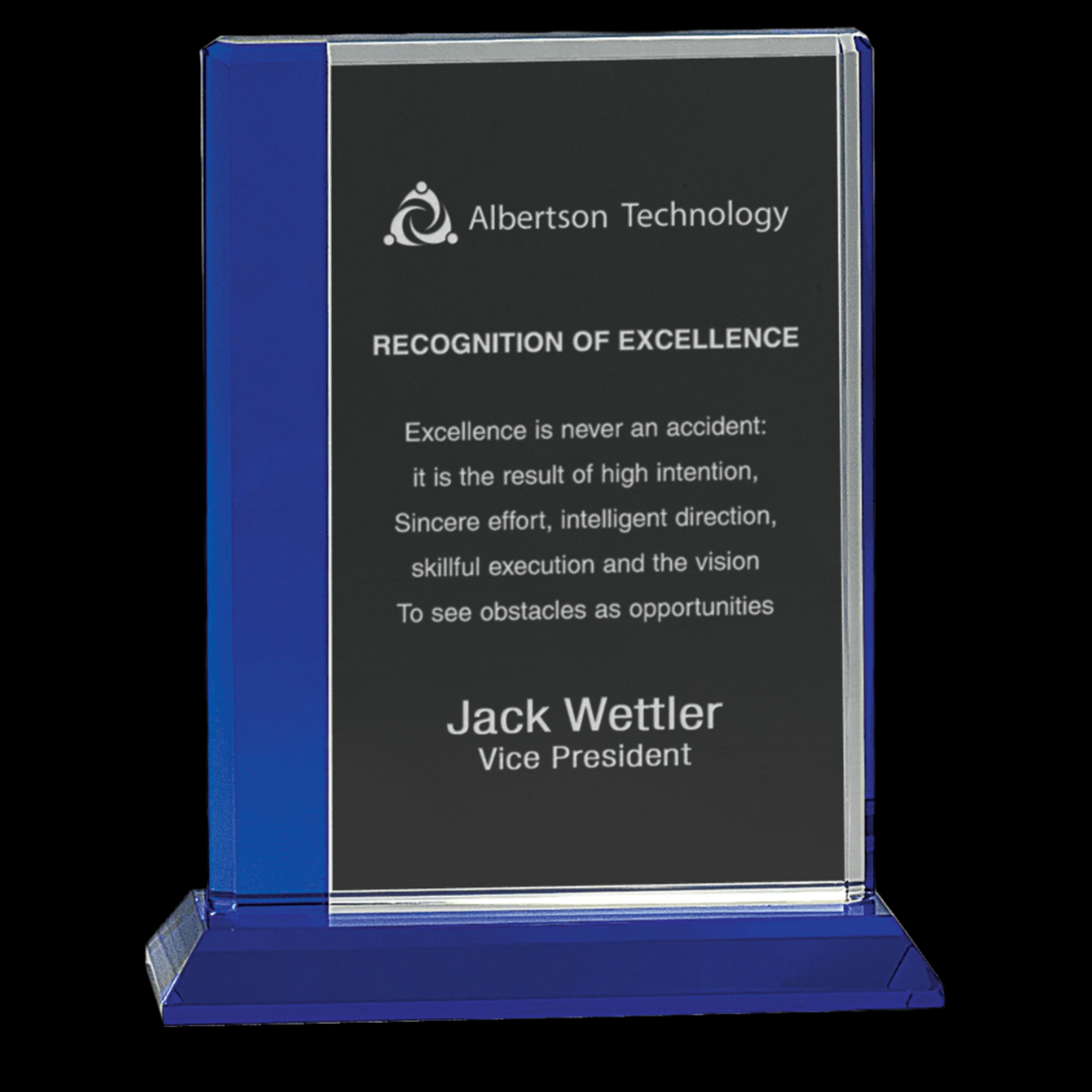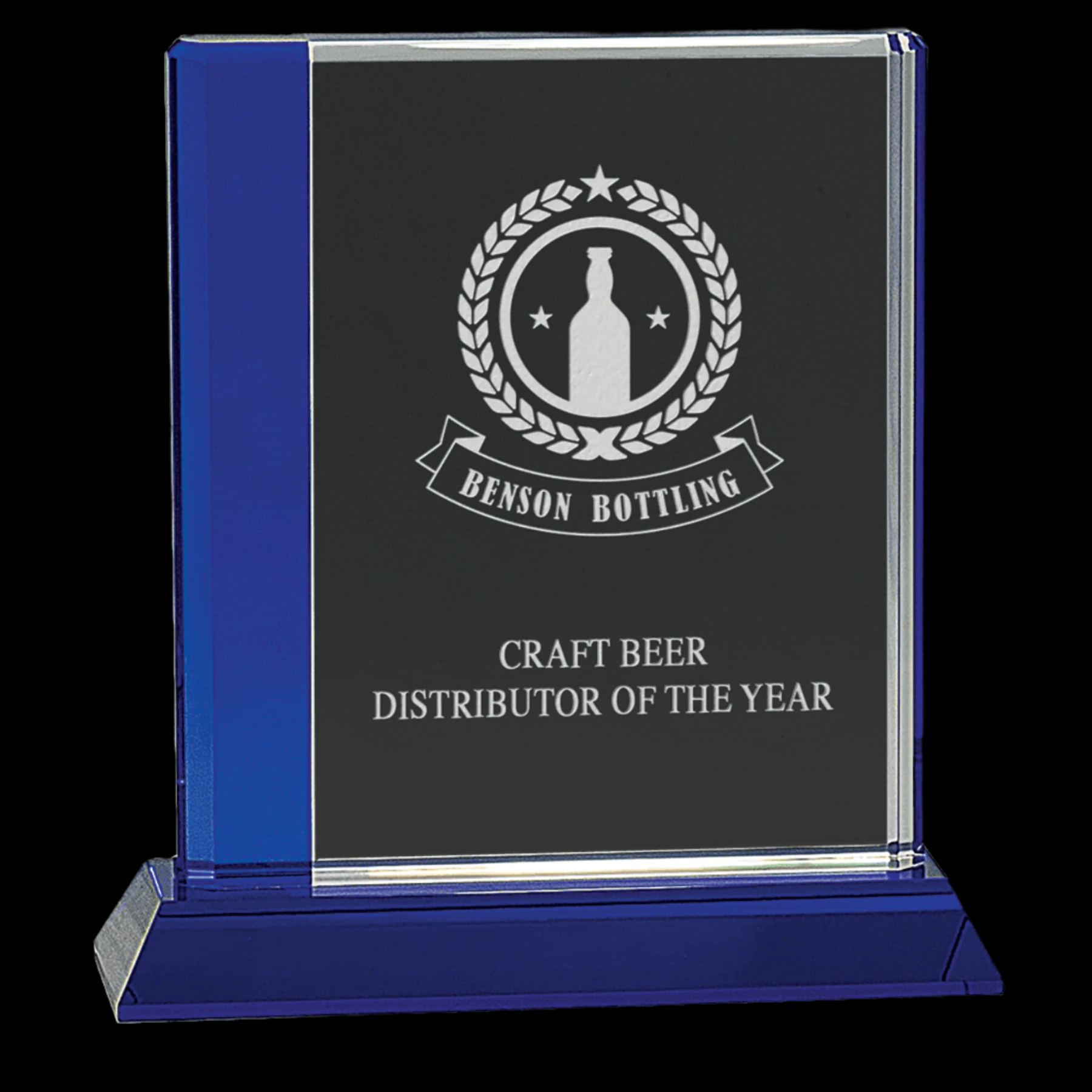 Our Crystal Awards are Handmade and May Vary Slightly in Size. Clear Optic Crystal Rectangle with Blue Decorative Edge is Attached to Blue Base. Packaged in a Lined Gift Box.