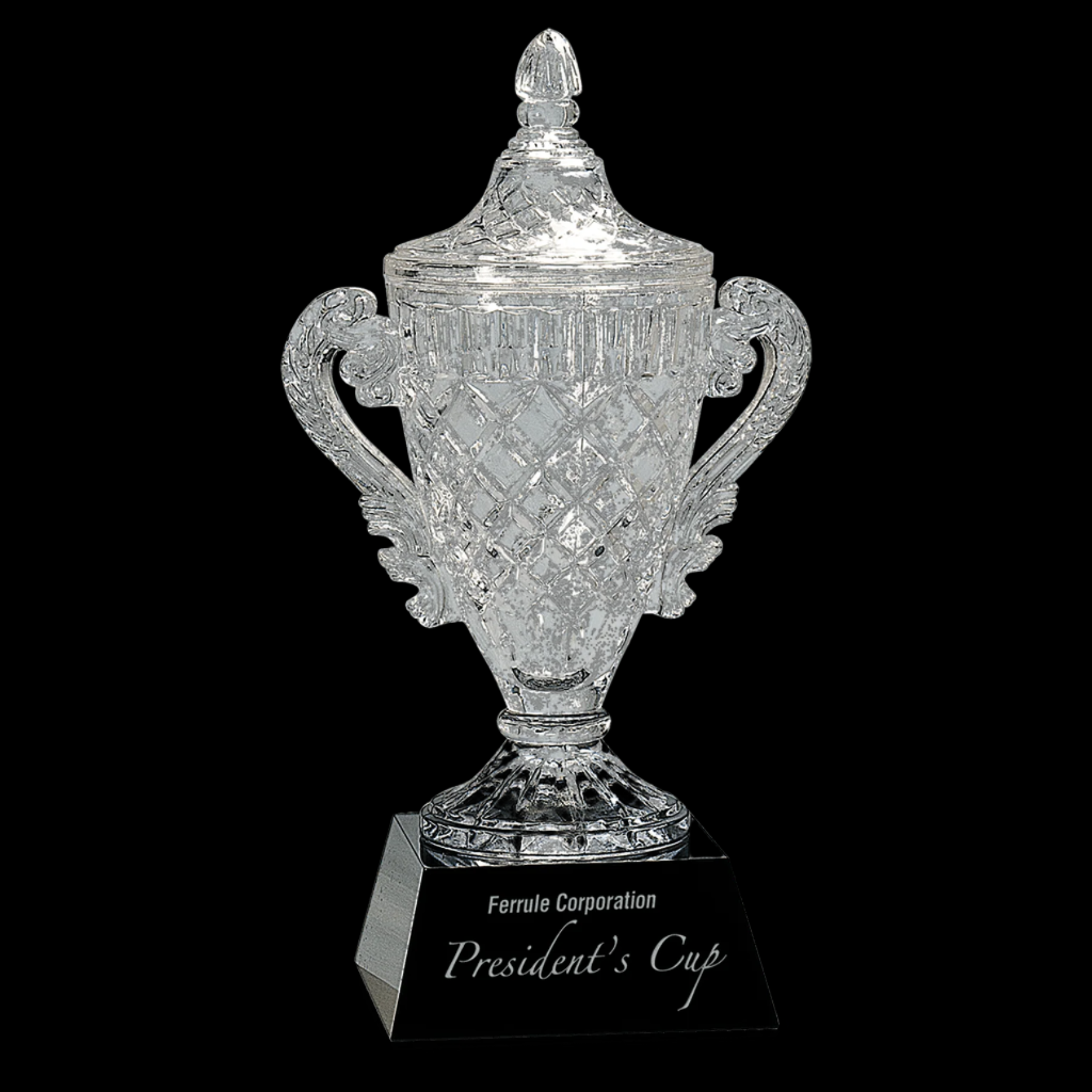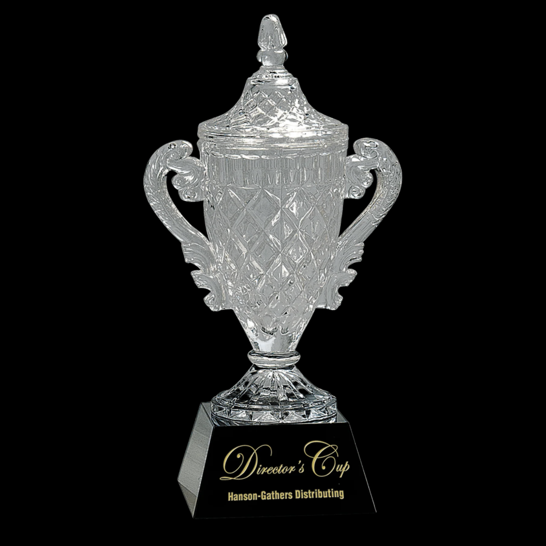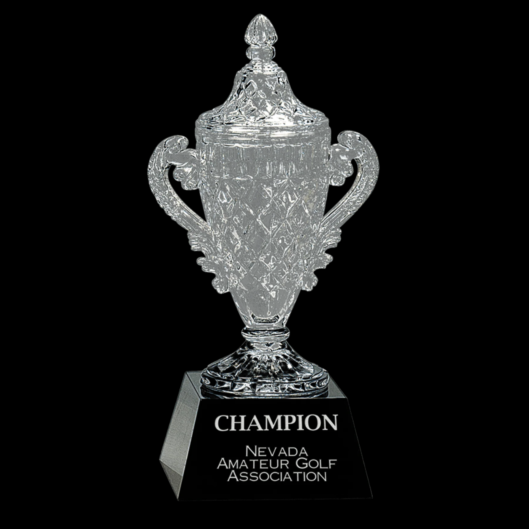 Our Ornate Crystal Cup on Black Pedestal Base is expertly handcrafted, ensuring each piece is unique with slight size variations. The clear optic crystal cup features two elegant handles and a fixed lid, all resting on a sleek black crystal base. This sophisticated design is perfect for display or special occasions and arrives beautifully packaged in a lined gift box, making it an exceptional gift choice.