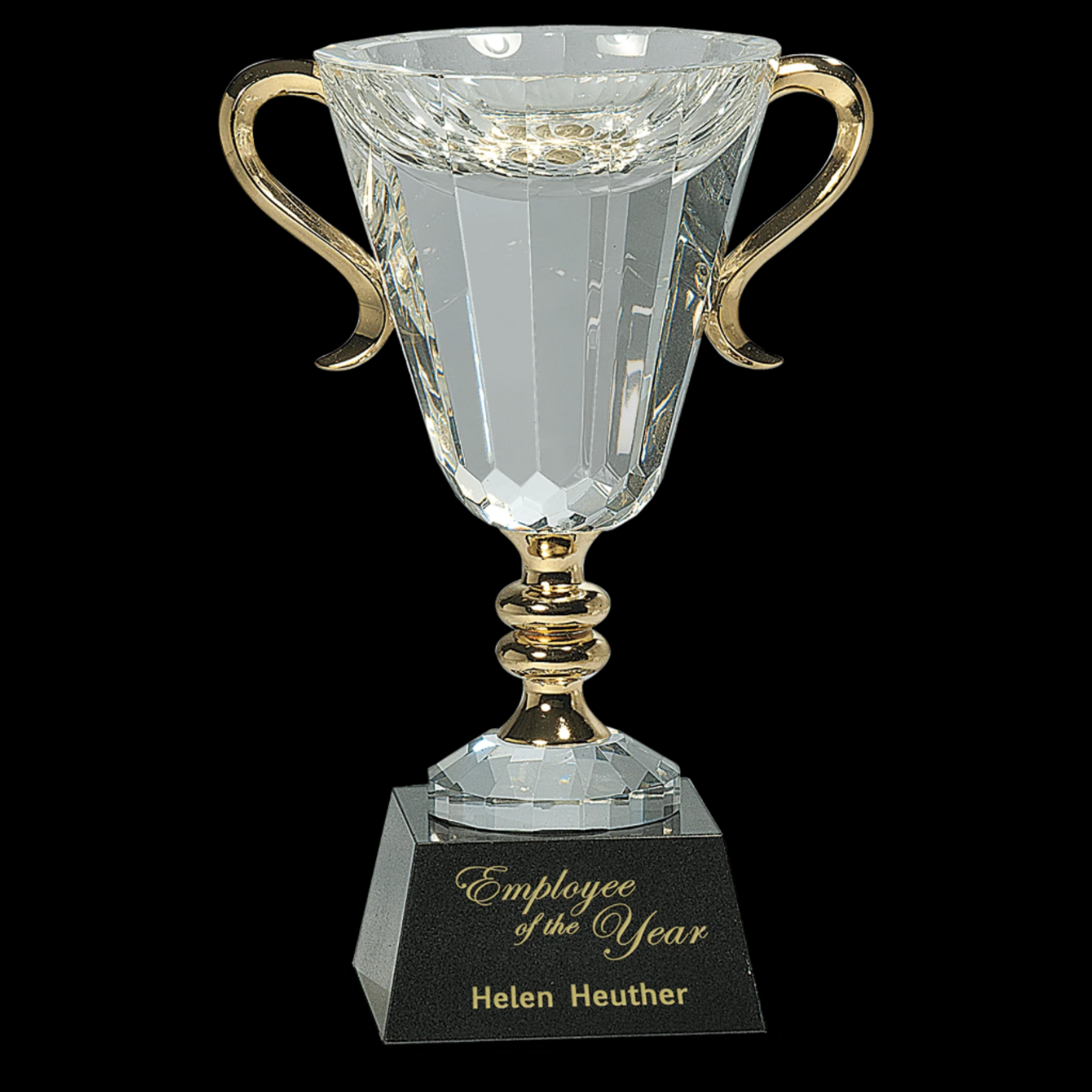 Our Crystal Cup with Gold Handles and Stem features a clear optic crystal bowl expertly handcrafted, ensuring each piece is unique with slight size variations. The elegant cup is securely mounted on a sleek black marble base, while the gold-plated handles and stem provide a refined, luxurious finish. Delivered in a lined gift box, this cup combines artistry and sophistication, making it an exceptional choice for collectors and connoisseurs alike.