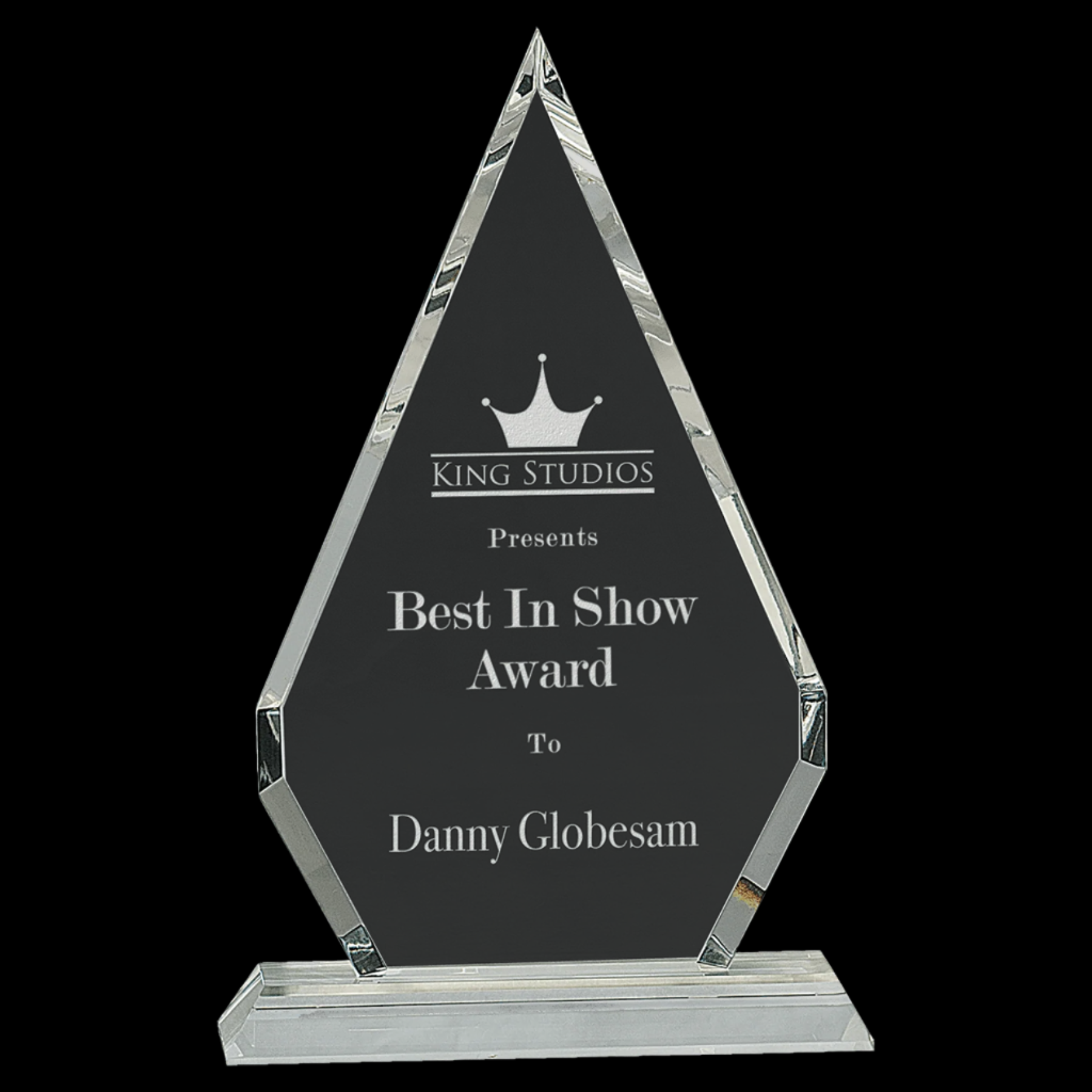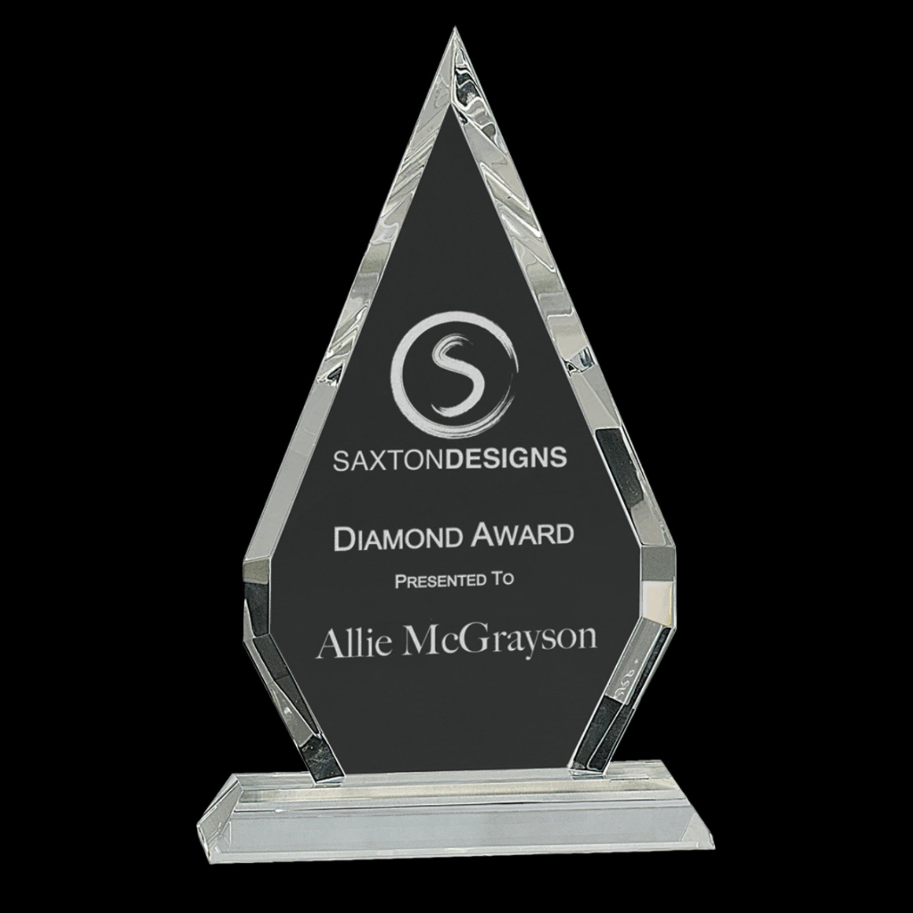 Our Crystal Diamond Award features a clear diamond optic crystal with beveled edges and clipped corners, elegantly mounted on a clear pedestal base. Each piece is meticulously handmade, ensuring unique variations in size and craftsmanship. Presented in a lined gift box, this award combines refined design with a professional presentation, making it an ideal recognition piece for distinguished achievements.