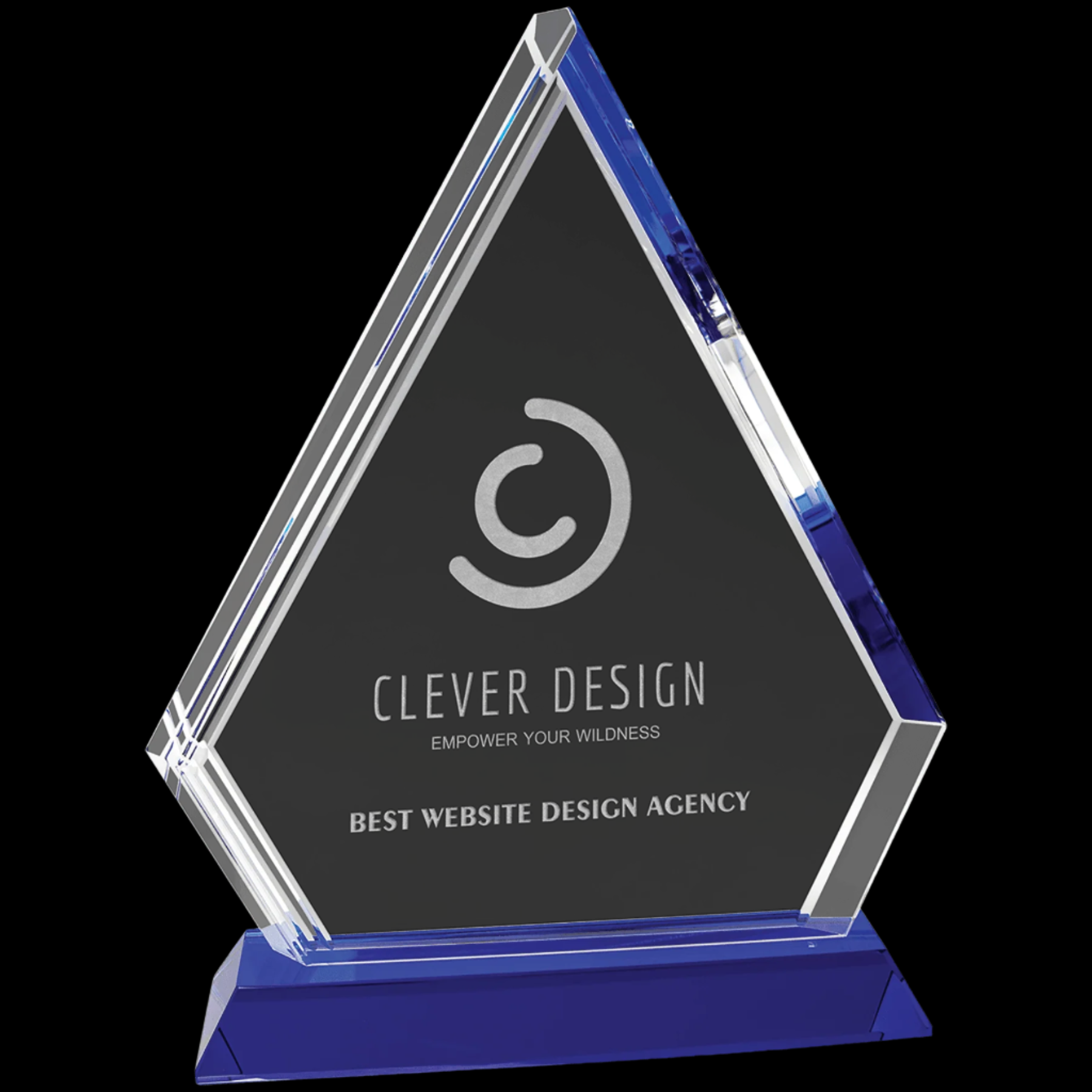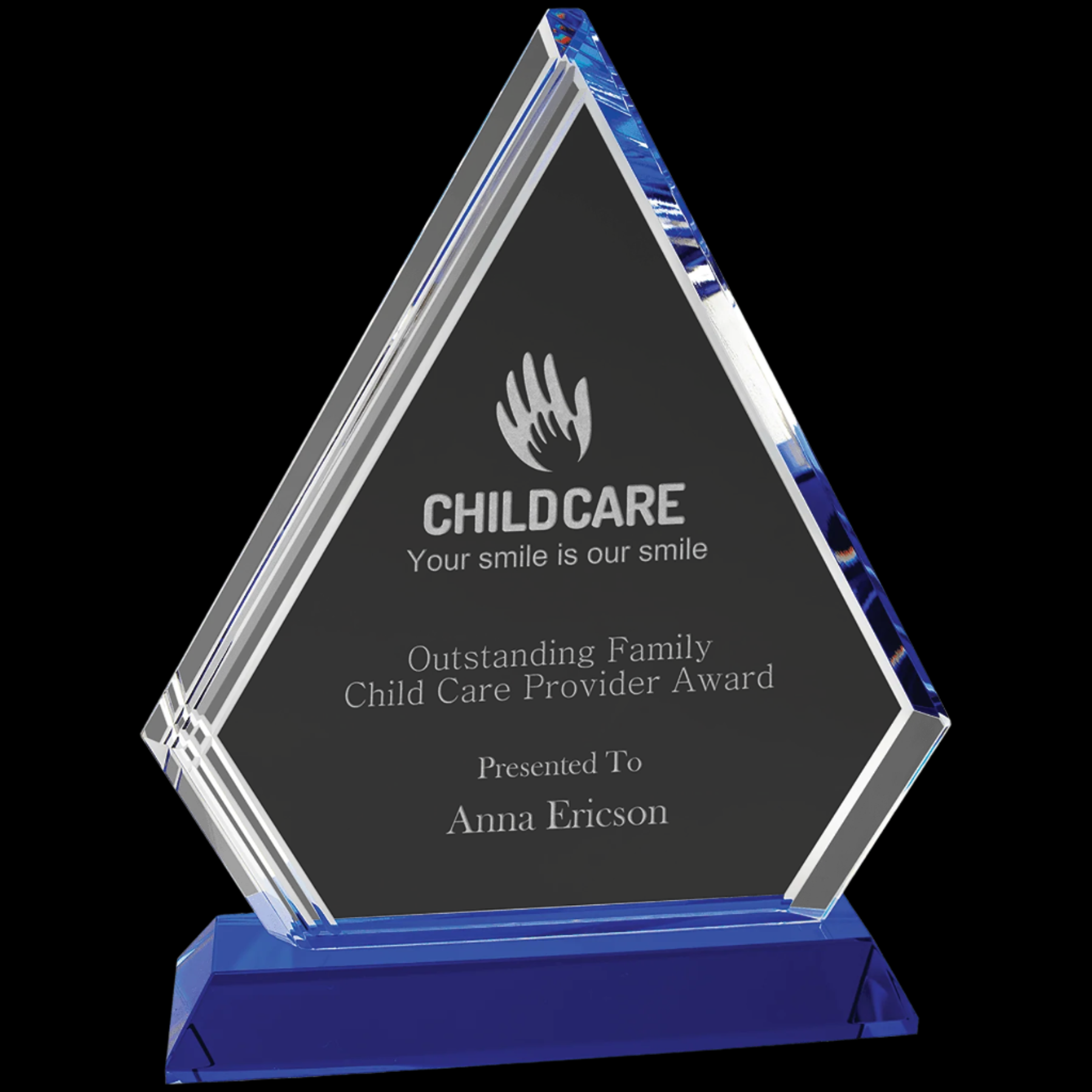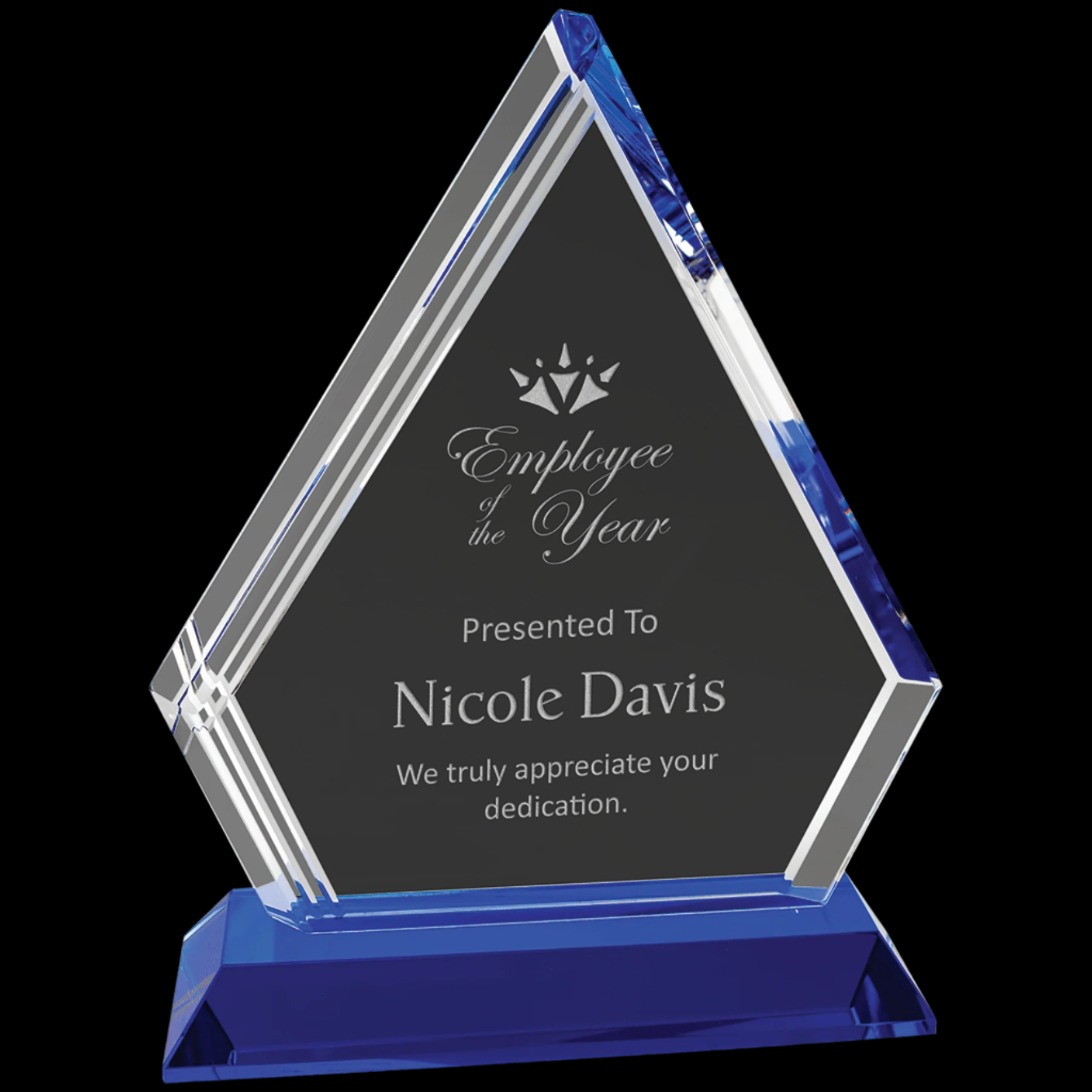 Our Crystal Diamond award is expertly handcrafted from optic crystal, ensuring each piece is uniquely sized. It features a striking blue pedestal base, which is sold separately and not attached, allowing for customizable presentation. Delivered in a lined gift box, this award combines elegance with thoughtful packaging, perfect for recognizing outstanding achievements.