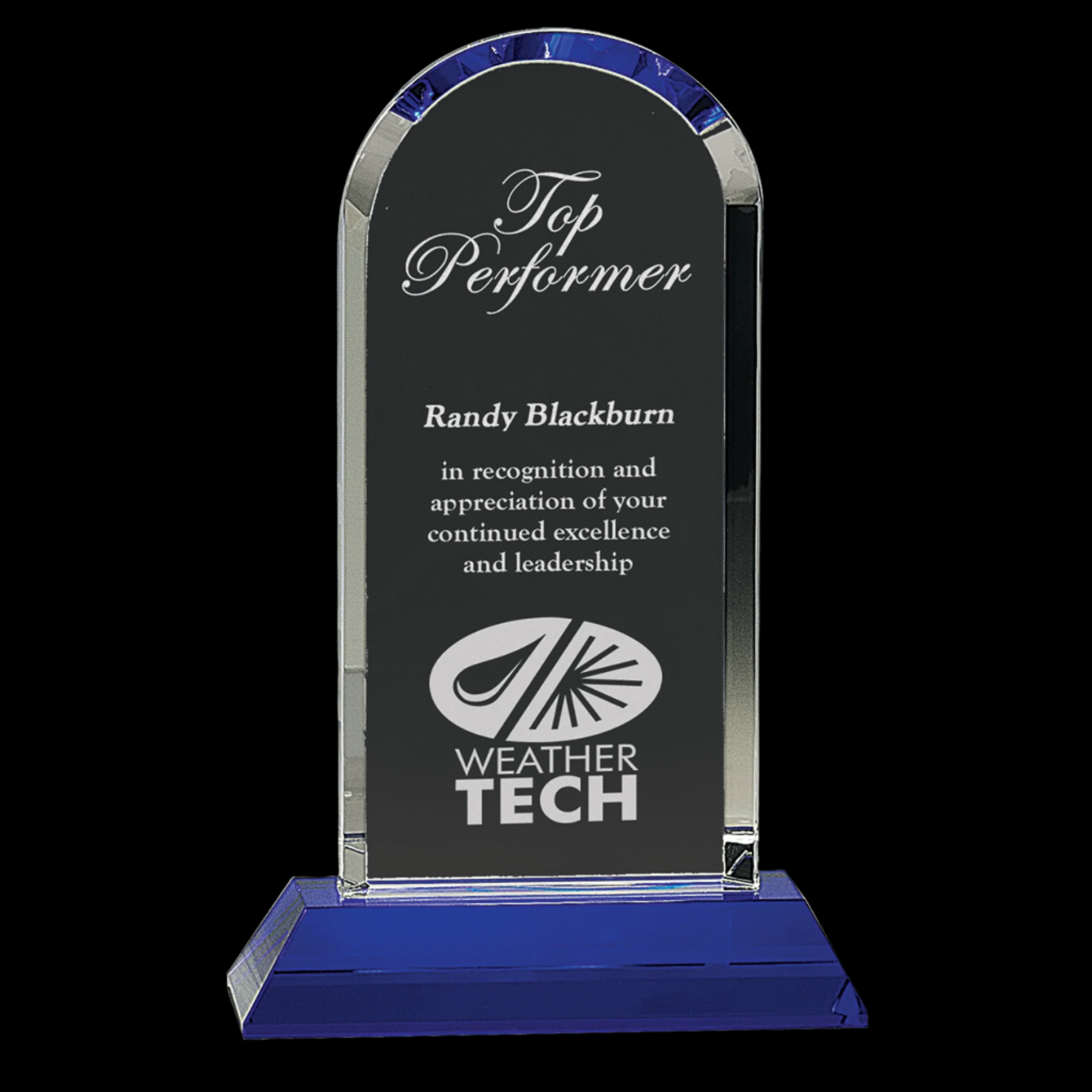 Our Crystal Awards are Handmade and May Vary Slightly in Size. Clear Optic Crystal Dome Attached to Blue Pedestal Base. Packaged in a Lined Gift Box.