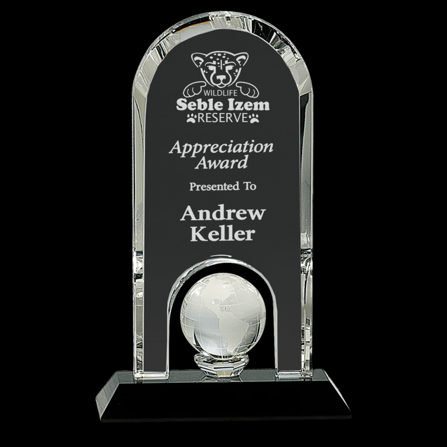 Our Globe Crystal is Handmade and May Vary Slightly in Size. Clear Optic Crystal Dome with Inset Globe Attached to Black Pedestal Base. Packaged in a Lined Gift Box.