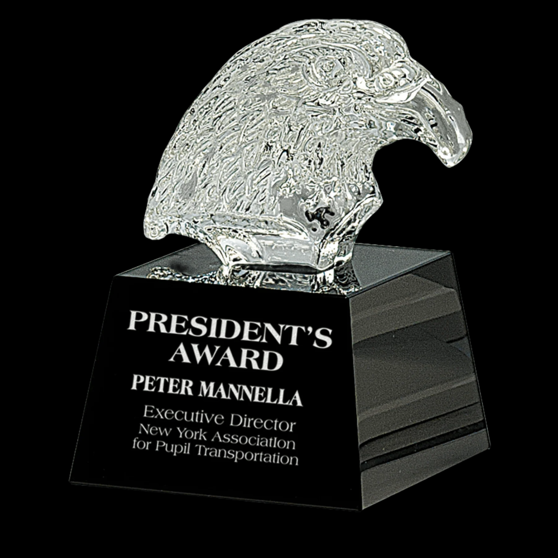 Our Crystal is Handmade and May Vary Slightly in Size. This Finely Detailed Eagle Head is Carved Into Clear Optic Crystal and Mounted on a Black Crystal Base. Packaged in a Lined Gift Box.