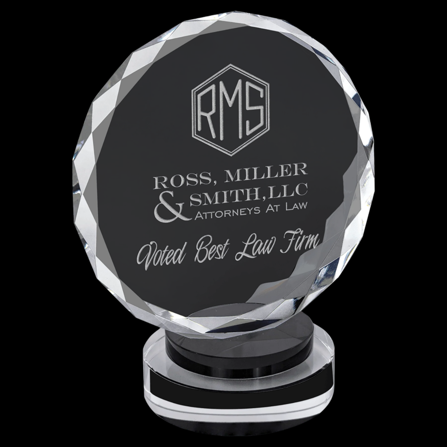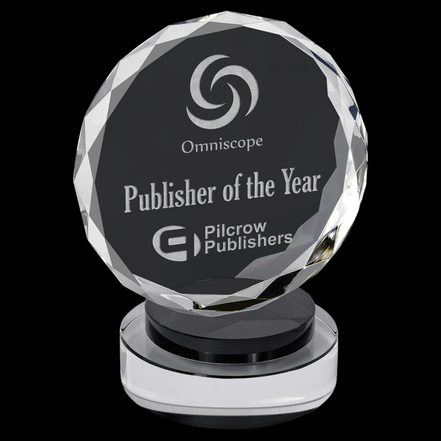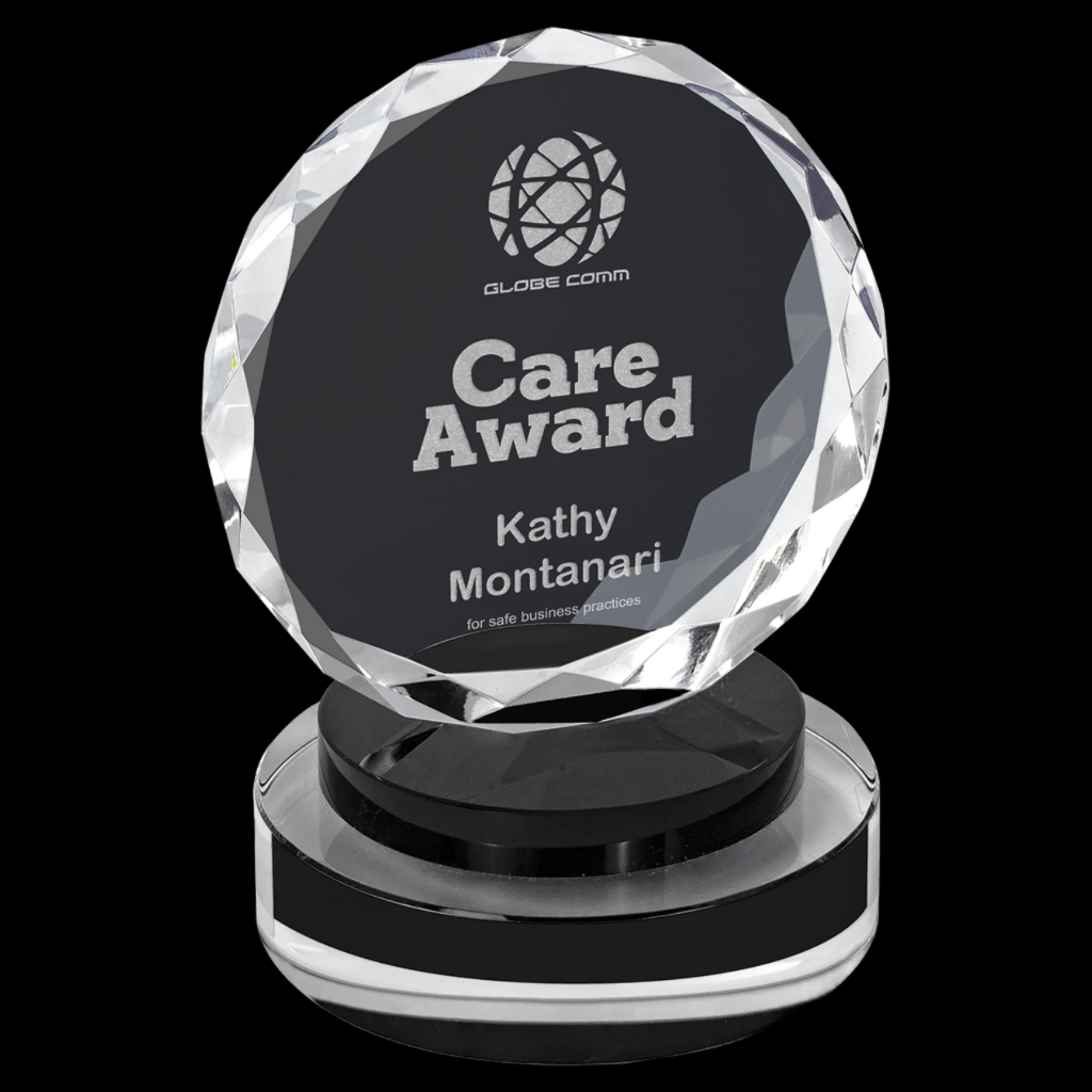 Our Round Facet Crystal Award features a handcrafted optic crystal piece mounted on a distinctive black and clear round base. Each award is double-sided, offering two unique visual perspectives. Slight size variations highlight its handmade quality. Presented in a lined gift box, it combines elegance with expert craftsmanship, making it an exceptional recognition piece.