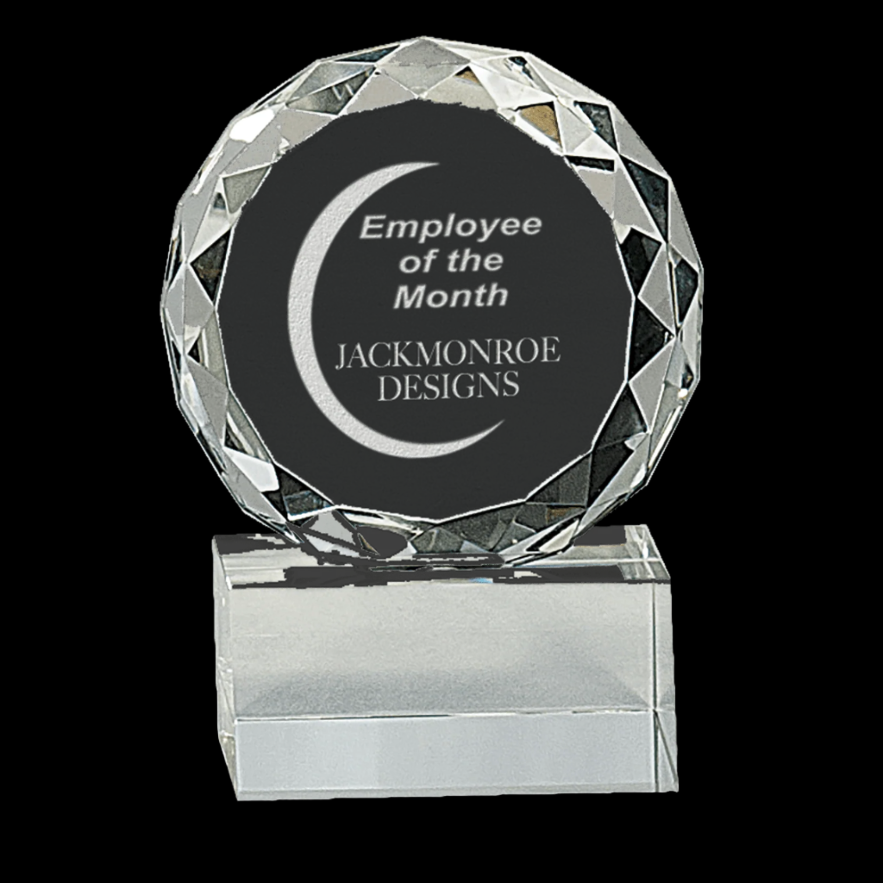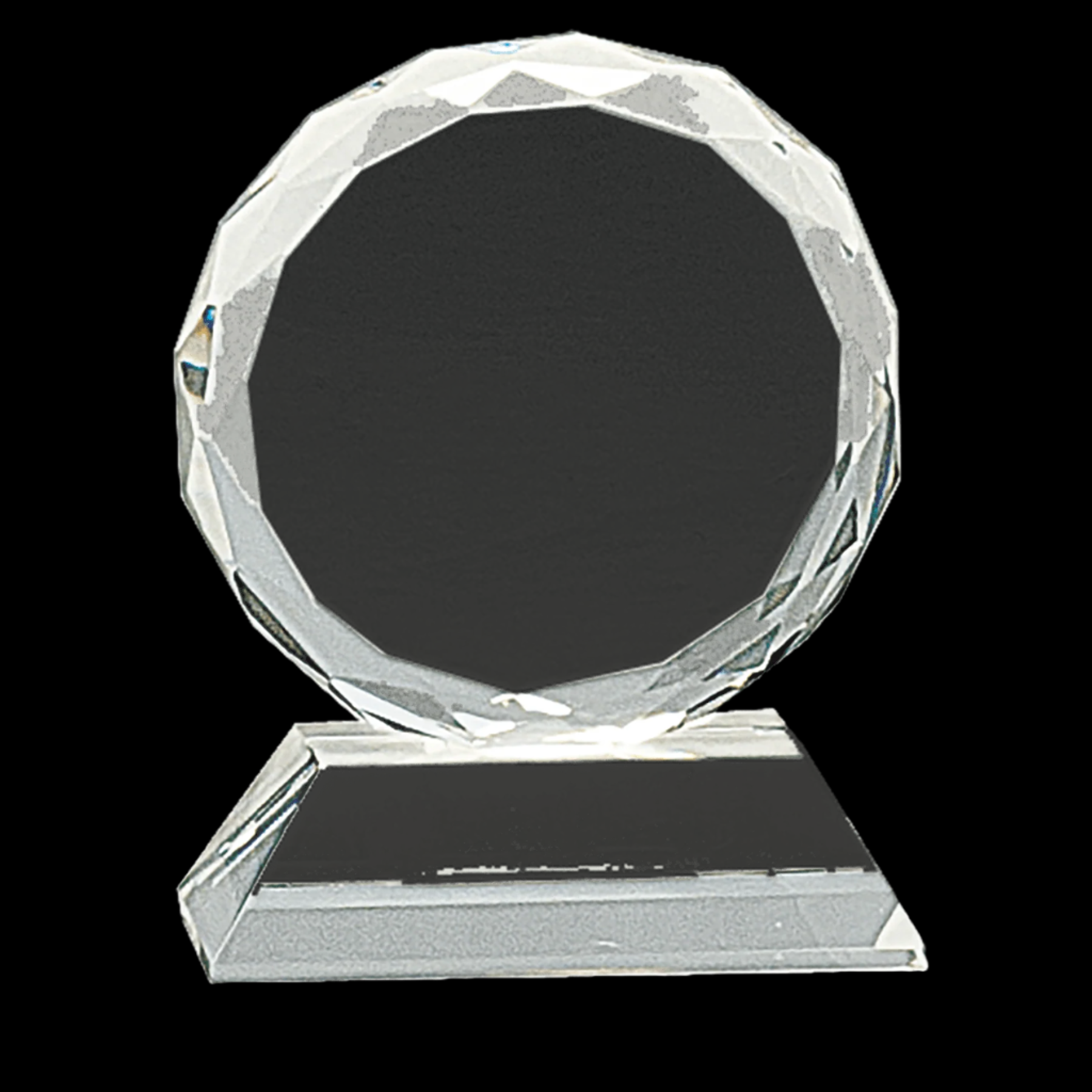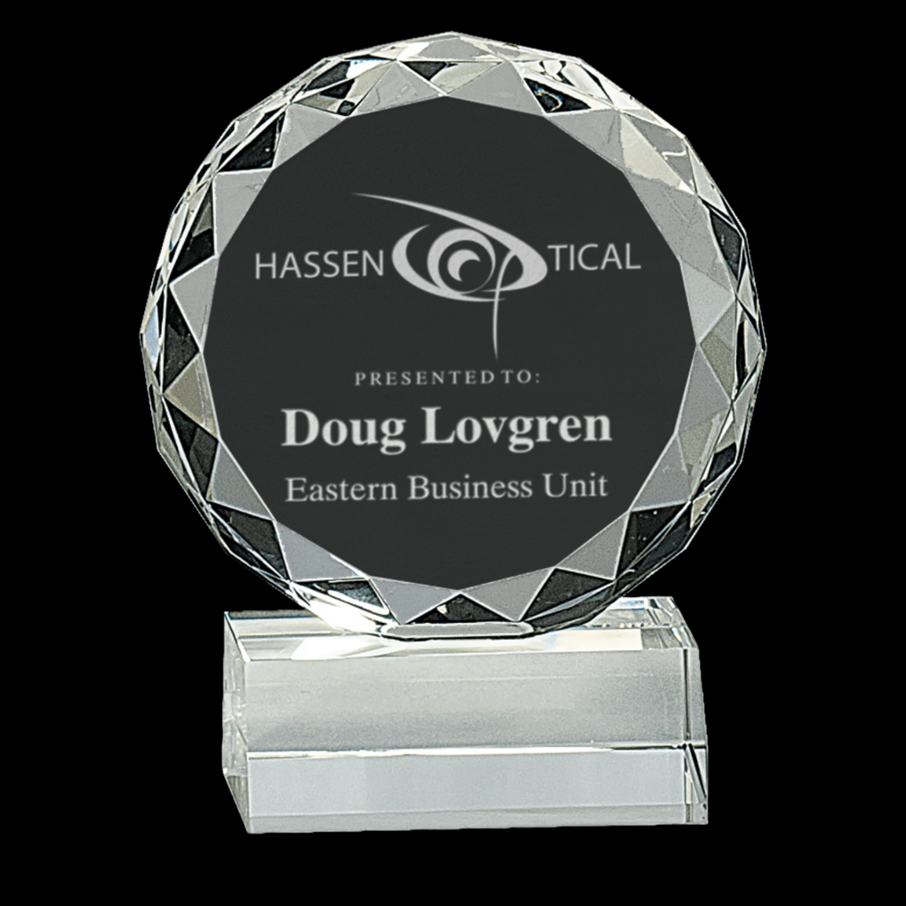 Our Round Facet Crystal on Clear Pedestal Base is expertly handcrafted, ensuring each piece is unique with slight size variations. Featuring a brilliant optic crystal facet mounted on a clear pedestal, this award combines elegance with durability. Delivered in a lined gift box, it’s ready to impress and honor achievements with timeless sophistication.