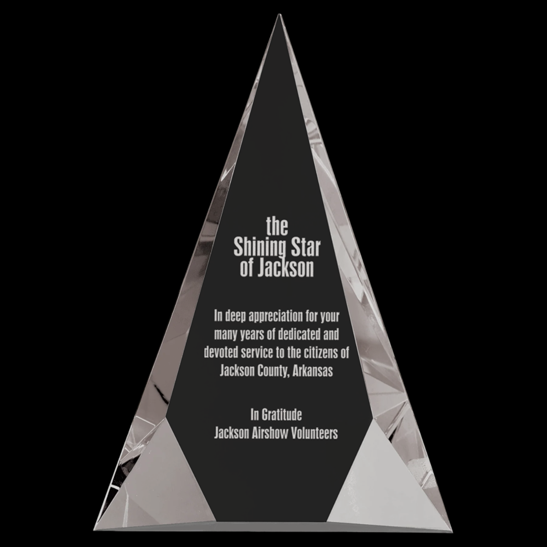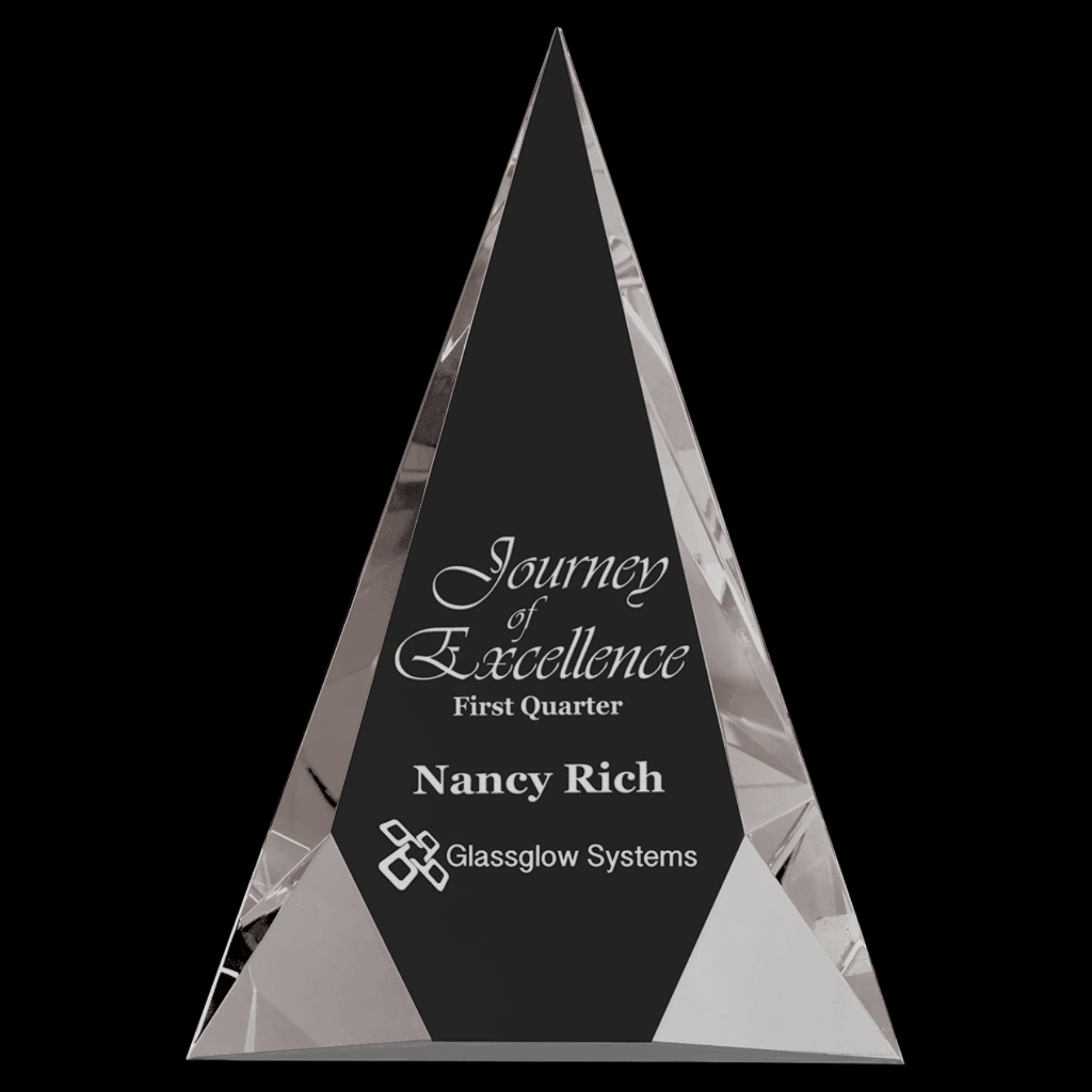 Our Crystal Facet Triangle is meticulously handmade, ensuring each piece is unique with slight size variations. Its striking geometric design stands elegantly on its own or can be mounted on a base for added presence. Delivered in a lined gift box, it’s perfect for presenting as a distinguished award or keepsake.