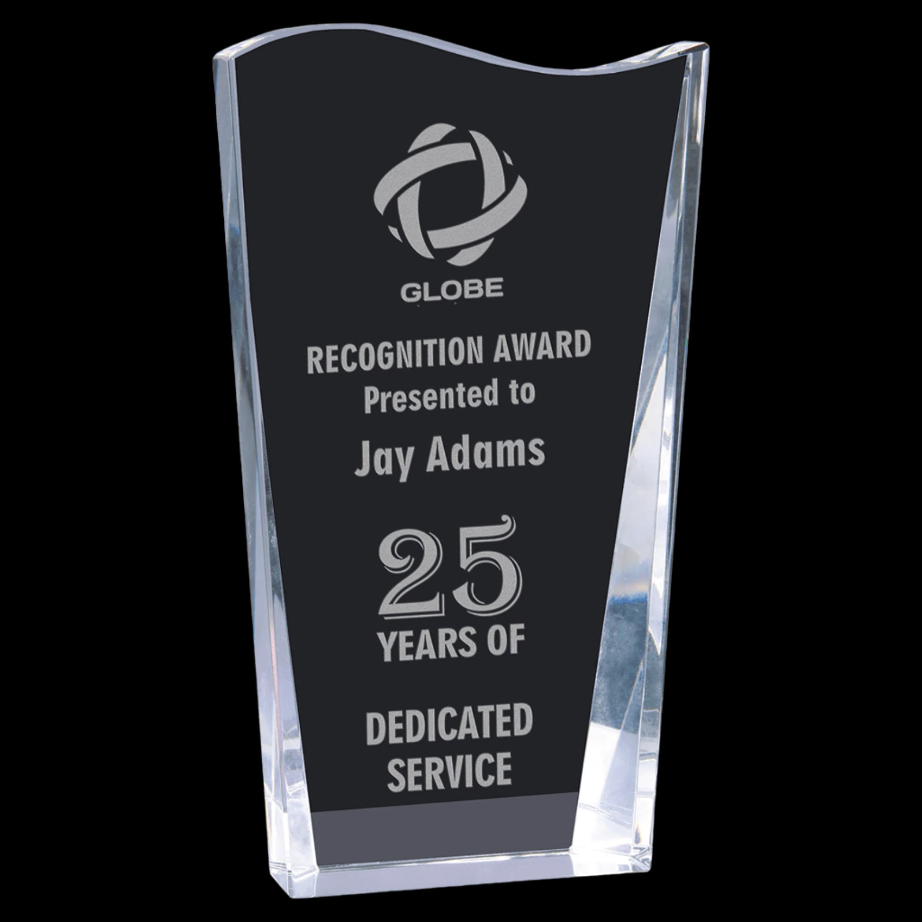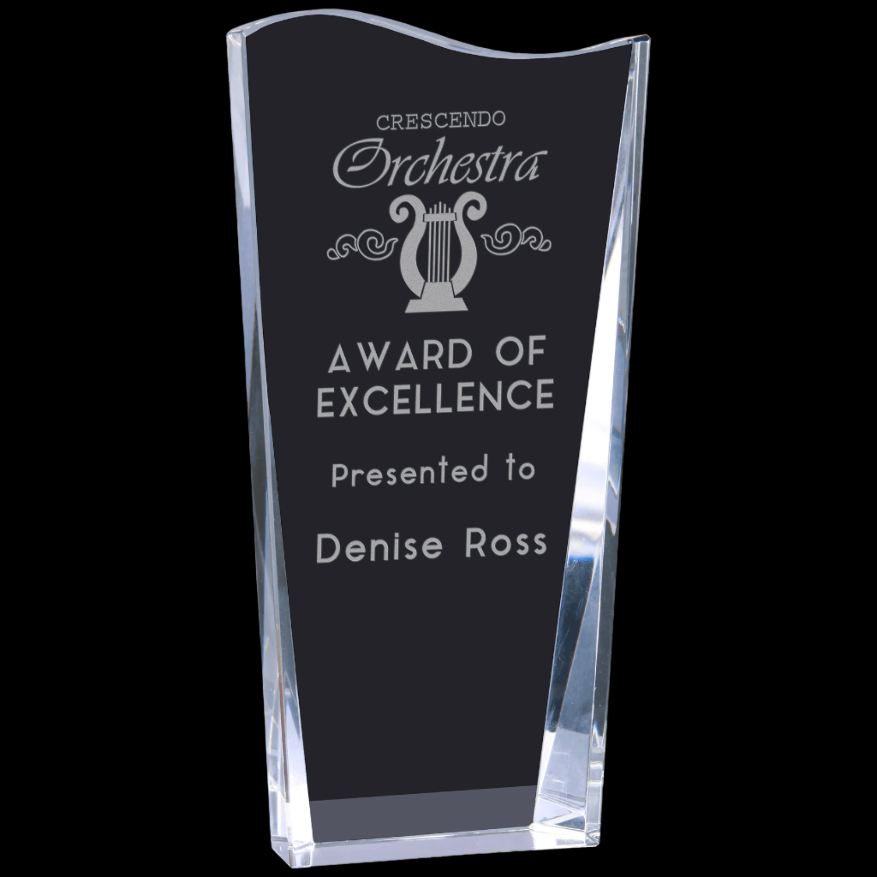 Our Crystal Facet Wave awards are meticulously handmade, ensuring each piece is unique with slight size variations. Featuring a striking crystal facet wave design, these awards stand elegantly on their own or can be mounted on a base for added presence. The double-sided craftsmanship allows for distinctive designs on each face, enhancing their visual impact. Each award is carefully packaged in a lined gift box, making it an exceptional choice for honoring achievements with sophistication and style.