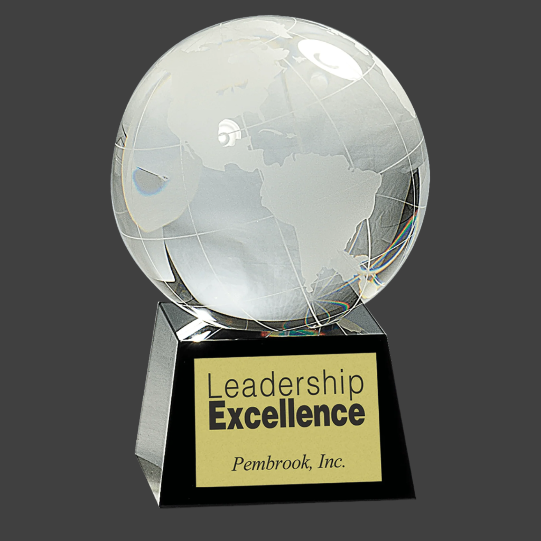 Our handcrafted Globe Crystal features frosted continents delicately etched on a clear optic crystal sphere. Each globe may vary slightly in size, reflecting its unique handmade nature. It rests securely in a recessed area on a sleek black crystal base, though the globe itself is not permanently attached. Presented in a lined gift box, this elegant piece combines artistry and precision, making it a distinguished addition to any collection or office.