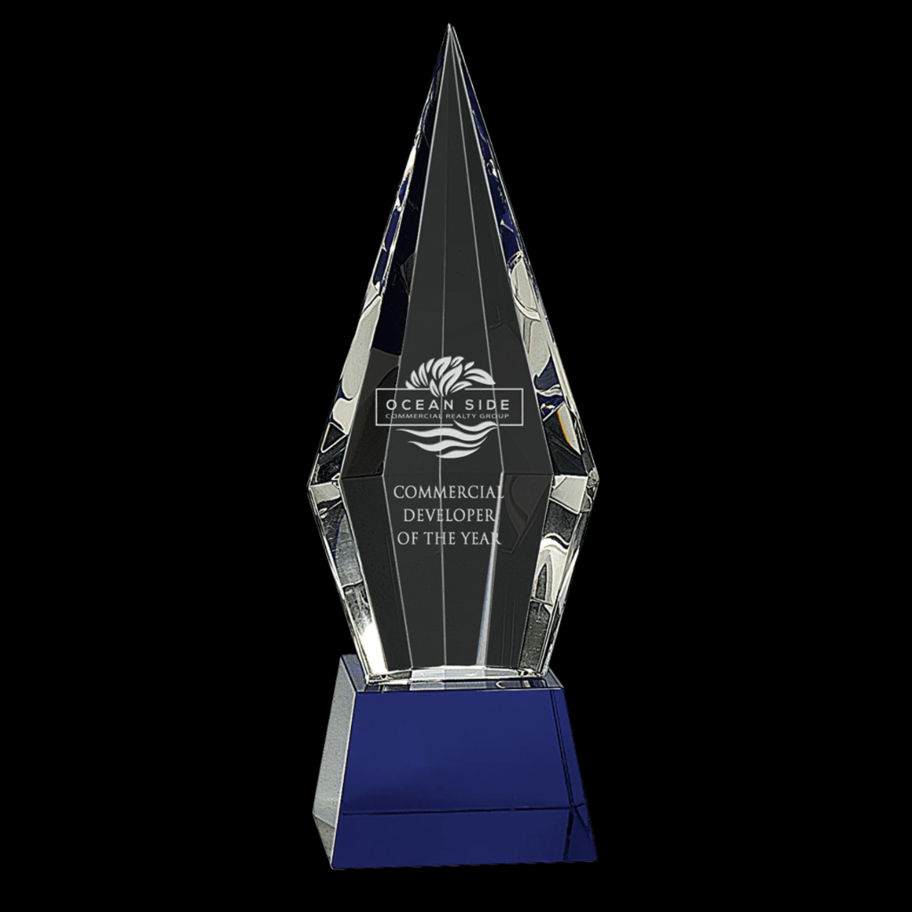 Our Obelisk Facet Crystal Awards feature a finely crafted optic crystal with a distinctive obelisk shape, mounted on a striking blue pedestal base. Each piece is handmade, ensuring unique variations in size and character. Presented in a lined gift box, these awards offer an elegant and professional way to recognize achievement.
