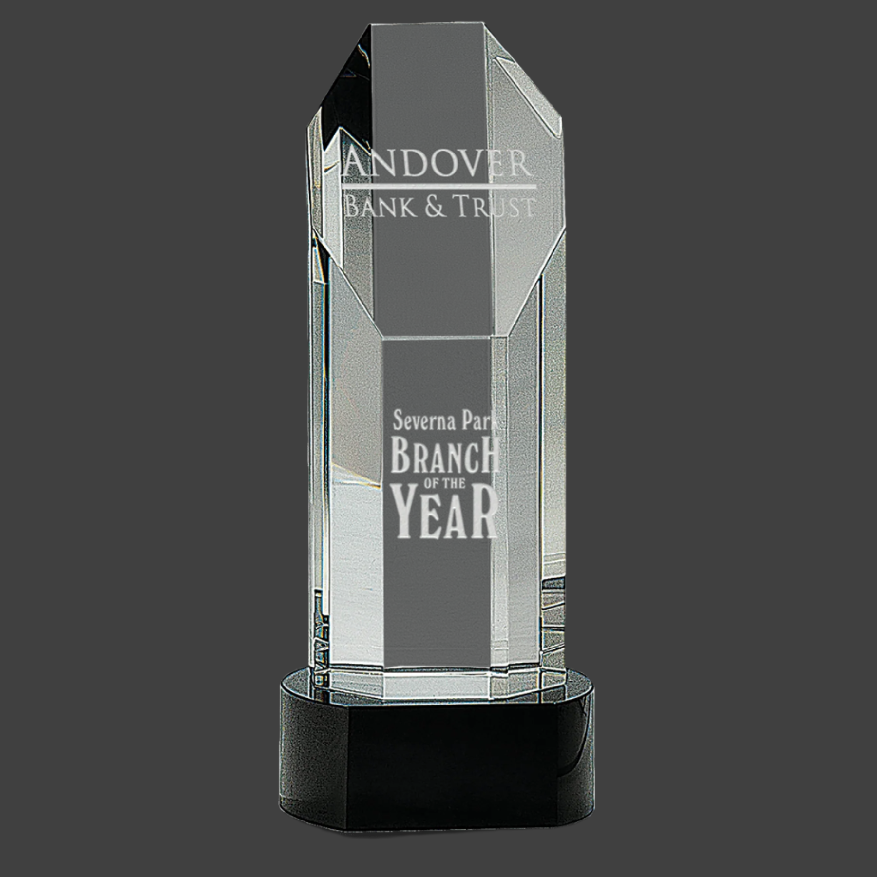 Our Octagon Slant-Top Crystal Award features a handcrafted optic crystal tower with a clear, elegant finish, mounted on a sleek black pedestal base. Each piece is unique due to its handmade nature, with slight size variations adding to its distinctiveness. Presented in a lined gift box, this award combines sophistication and quality, making it an ideal recognition piece for any professional setting.
