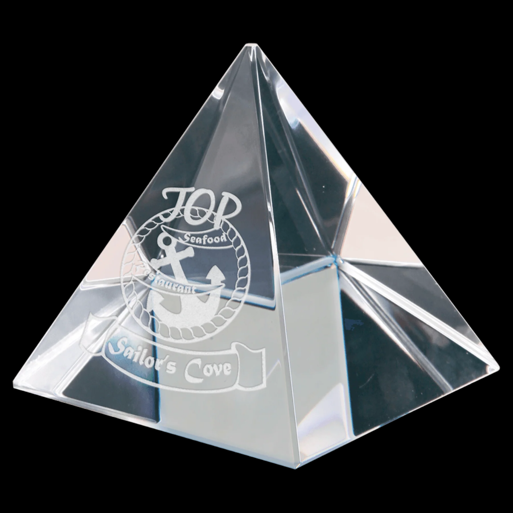 Our Crystal Pyramid awards are meticulously handmade, ensuring each piece is uniquely crafted with slight size variations. The optic crystal clear design creates a striking presence, perfect for showcasing achievements. Featuring double-sided engraving, it offers distinctive personalization options. Each award is elegantly presented in a lined gift box, making it an exceptional choice for honoring excellence.