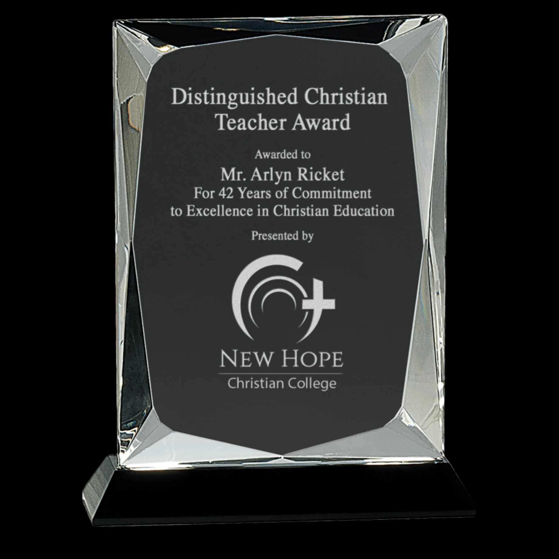 Our Clear Crystal Rectangle on Black Base is a meticulously handcrafted award, featuring a clear optic crystal rectangle elegantly mounted on a sleek black base. Each piece may vary slightly in size, reflecting its handmade quality. Presented in a lined gift box, this award combines sophistication with thoughtful packaging, making it an ideal choice for recognizing excellence.