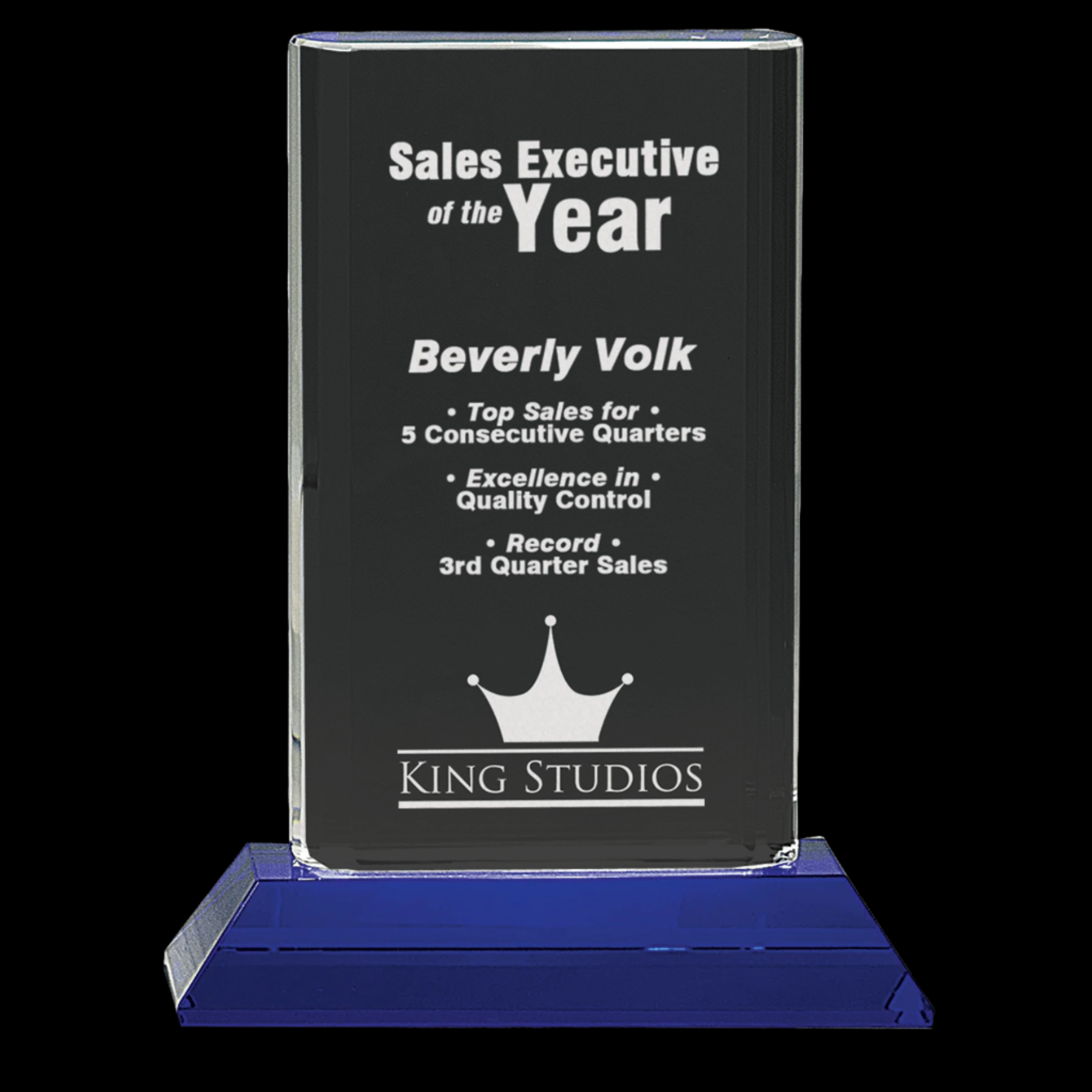 Our 7.75" Clear Crystal Rectangle on Blue Base is expertly handcrafted, ensuring each piece is unique with slight size variations. The clear optic crystal rectangle elegantly rests on a vibrant blue base, creating a striking visual contrast. Delivered in a lined gift box, this award is ready to impress and honor achievements with sophistication.
