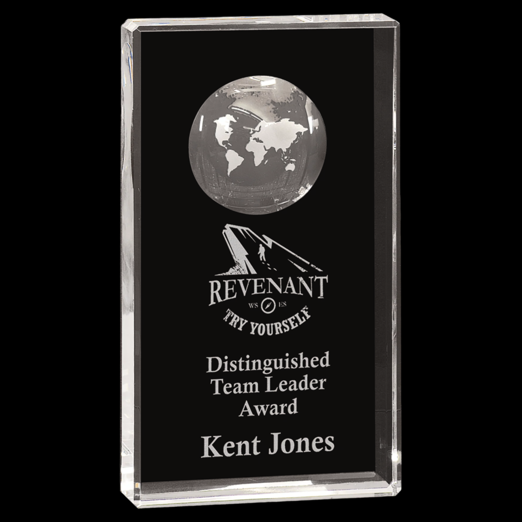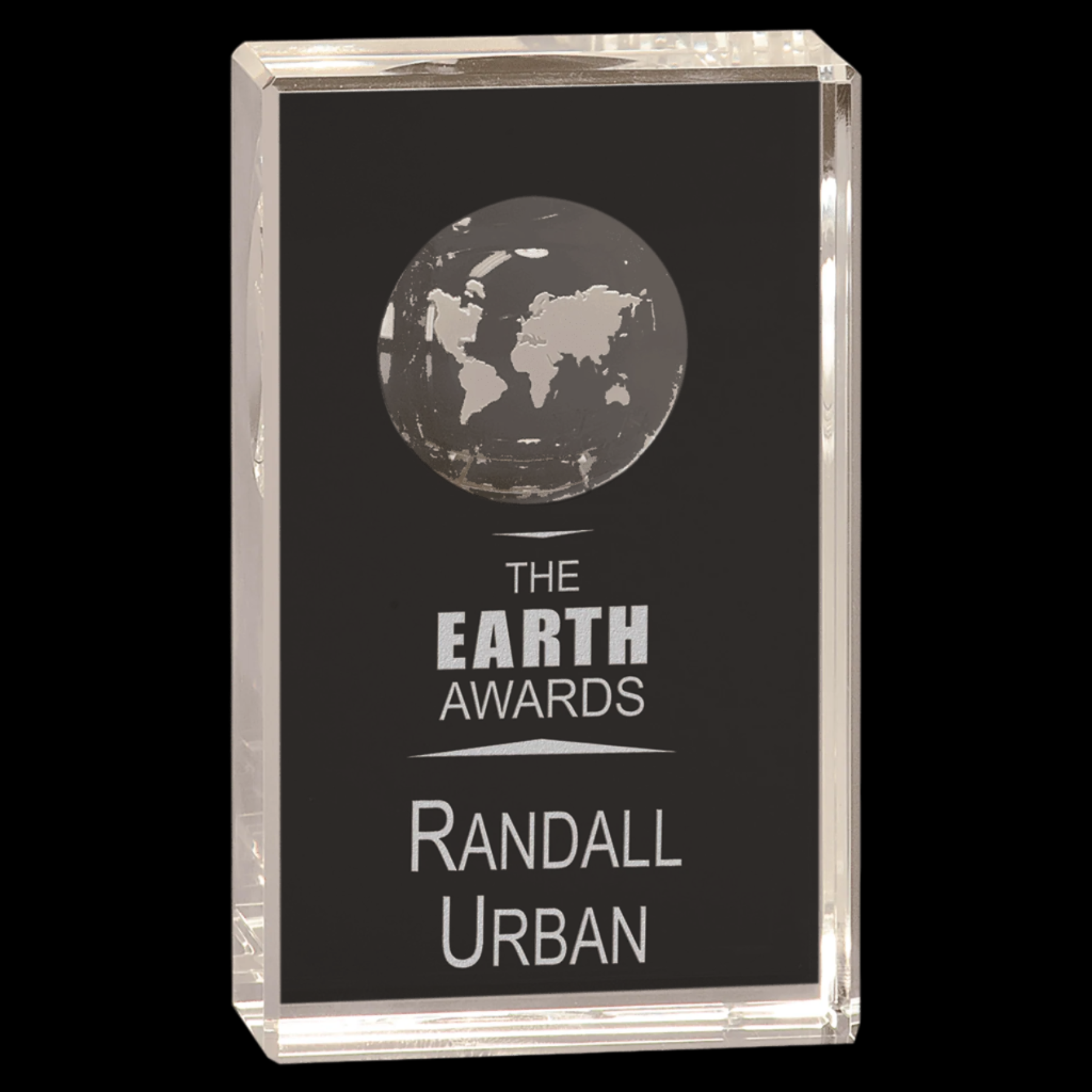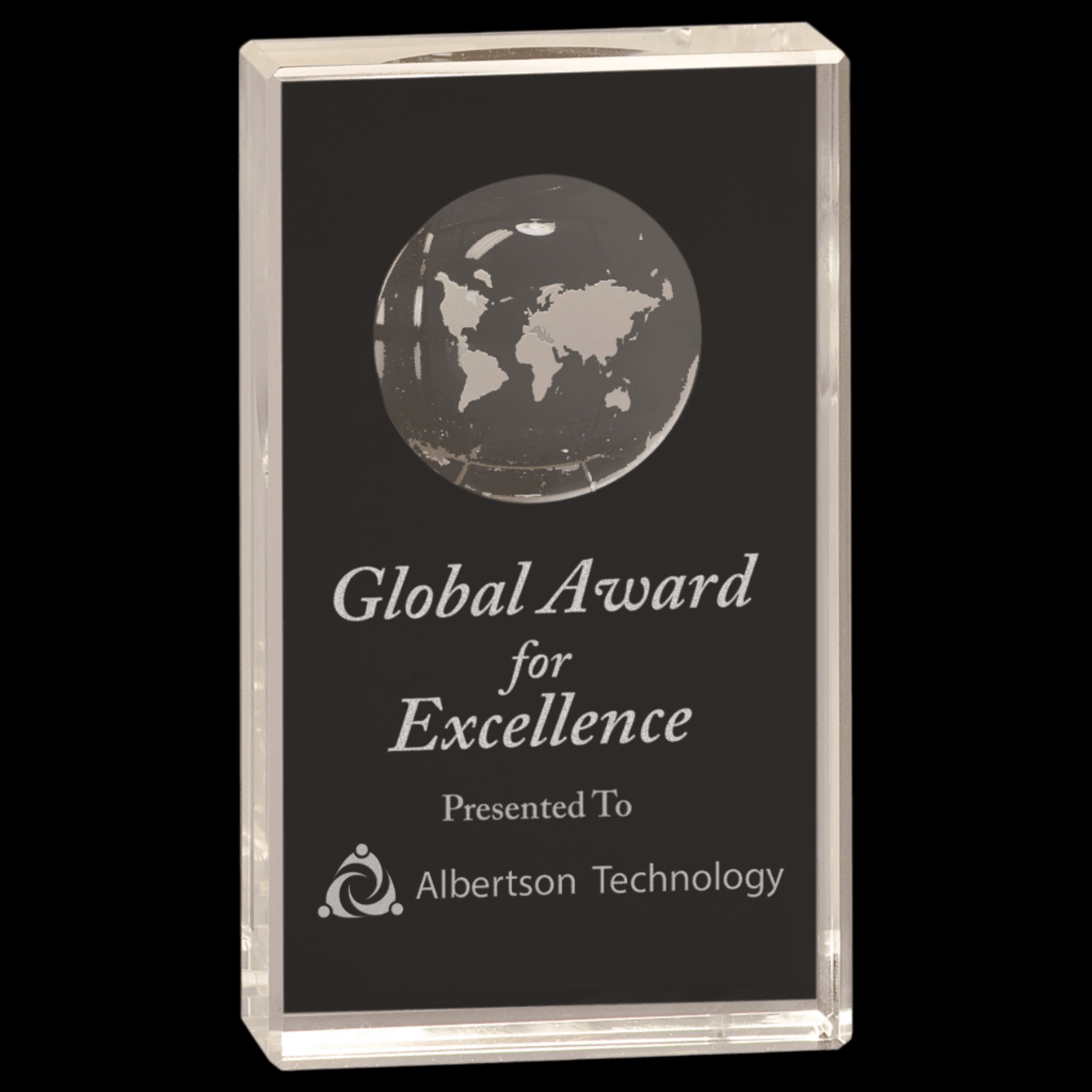 Our Clear Crystal Rectangle with Globe Etching features a meticulously handcrafted design, ensuring each piece is unique with slight size variations. The etched globe is precisely indented into the back of the clear optic crystal, creating a striking three-dimensional effect. Presented in a lined gift box, this elegant piece is perfect for professional recognition or sophisticated décor.