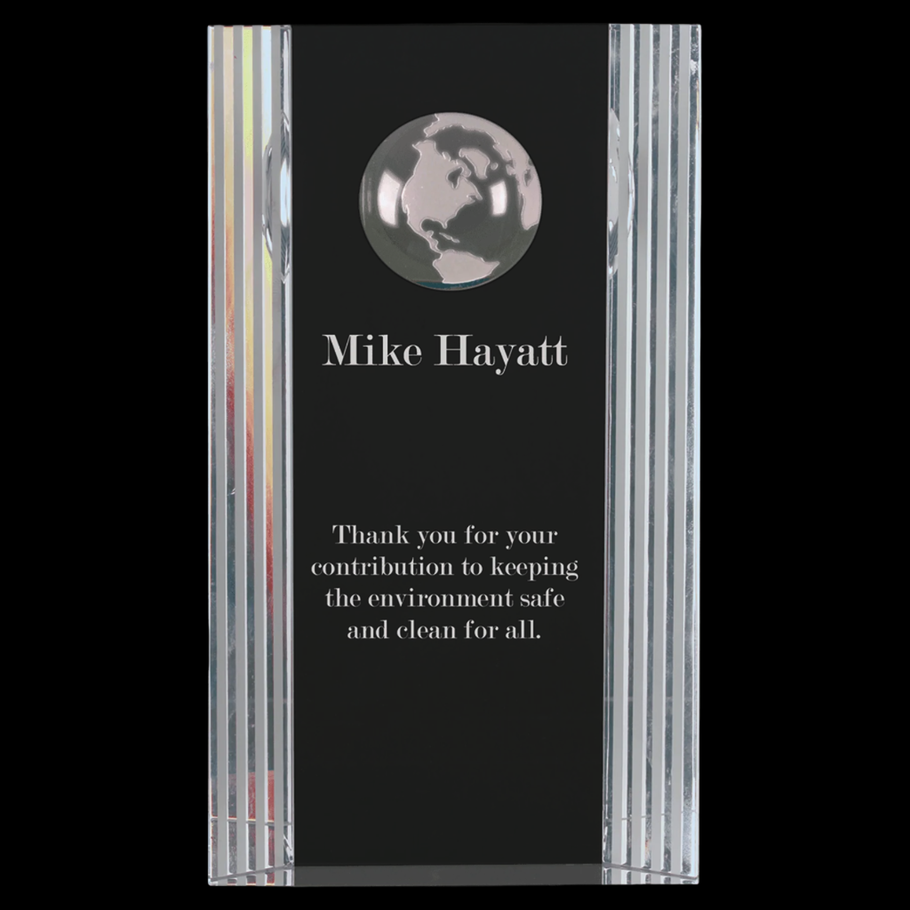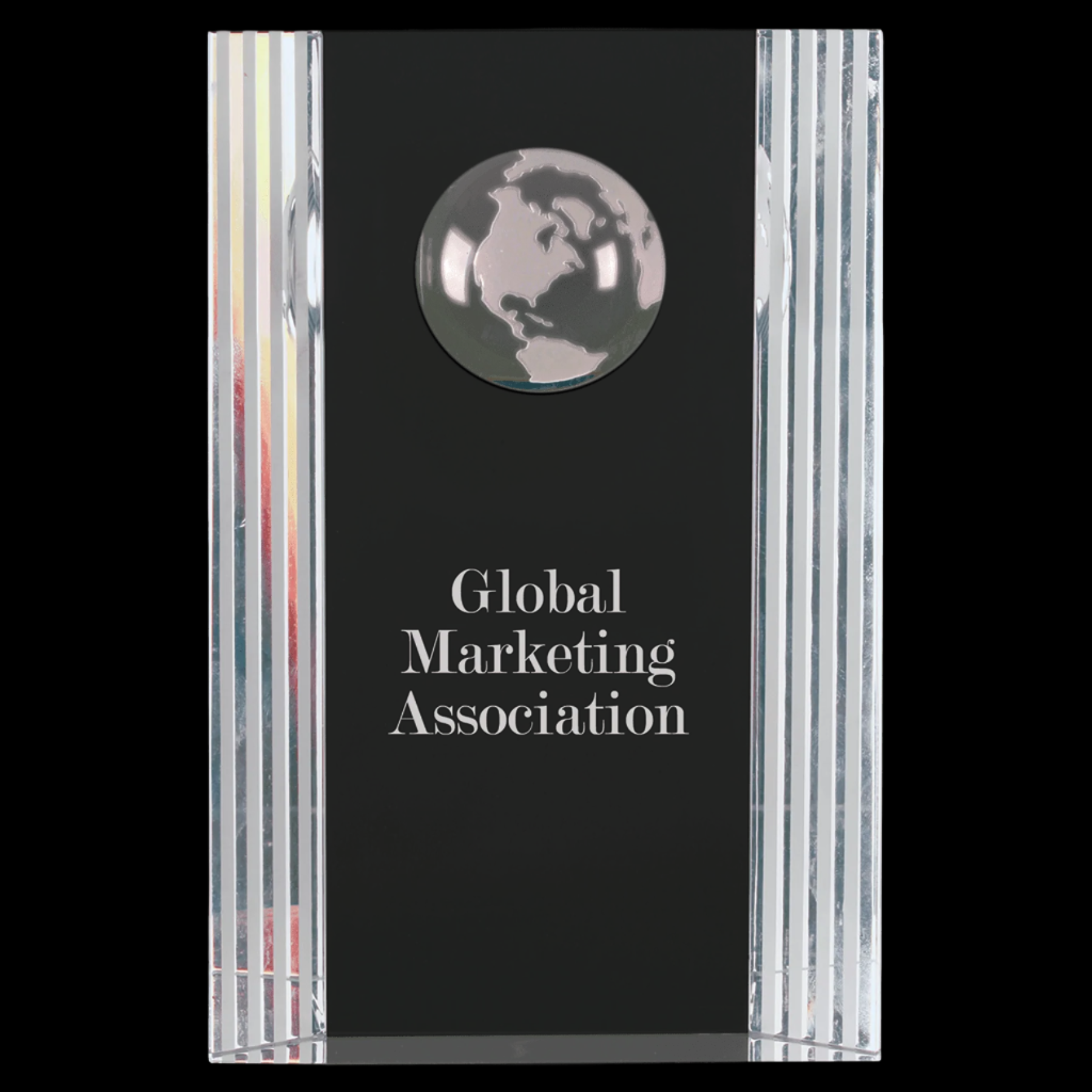 Our Clear Crystal Rectangle features a finely etched globe and elegant decorative lines, crafted from high-quality optic crystal. Each piece is handmade, resulting in slight variations in size that highlight its unique character. Presented in a lined gift box, this sophisticated design makes an exceptional gift or display piece.