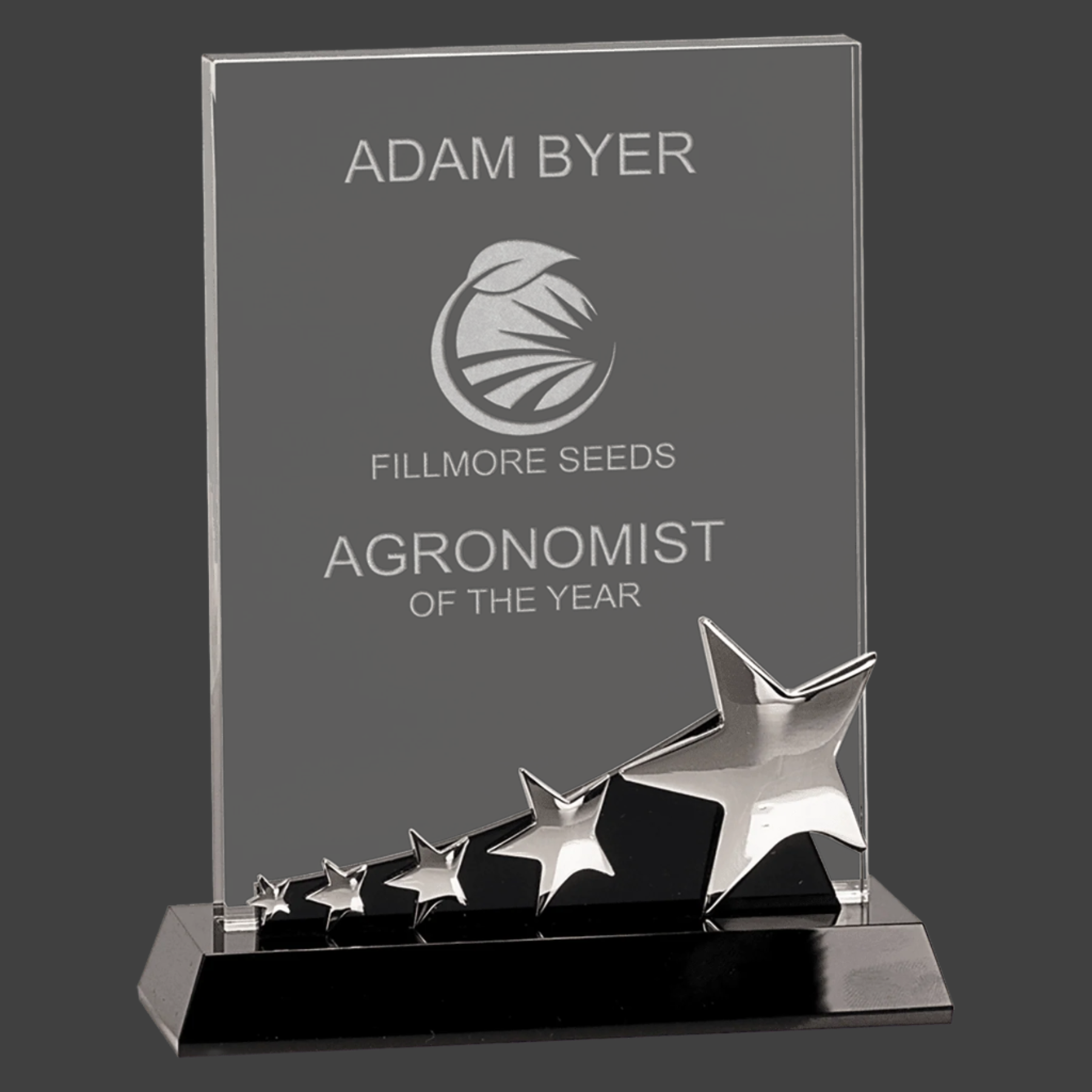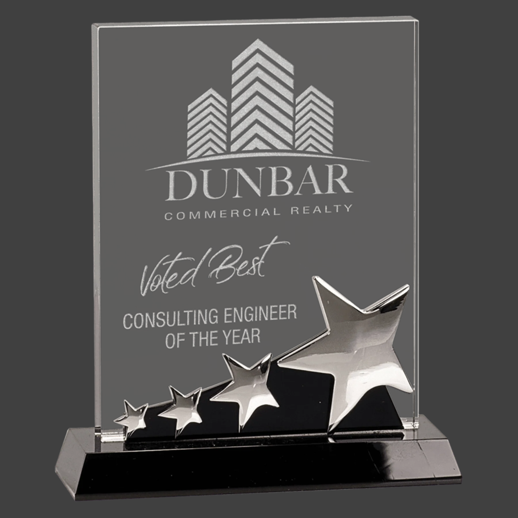 Our Rectangle Crystal features expertly handcrafted optic crystal adorned with delicate silver stars, each piece unique in size. Mounted on a sleek black pedestal base, it offers a striking display of elegance. Presented in a lined gift box, this piece is ideal for distinguished awards or memorable keepsakes.