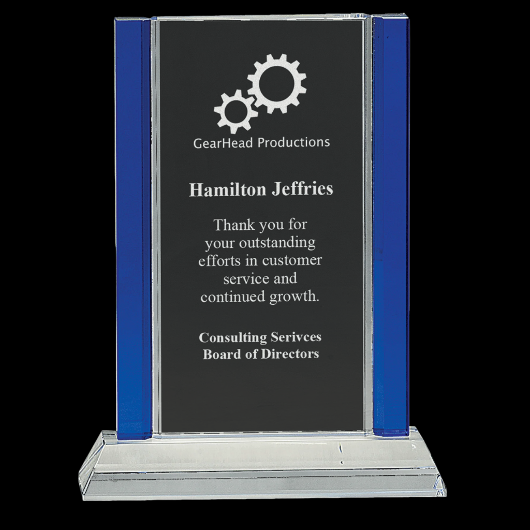 Our Crystal Awards are Handmade and May Vary Slightly in Size. Clear Optic Crystal Rectangle with Decorative Blue Edges Attached to Clear Base. Packaged in a Lined Gift Box.