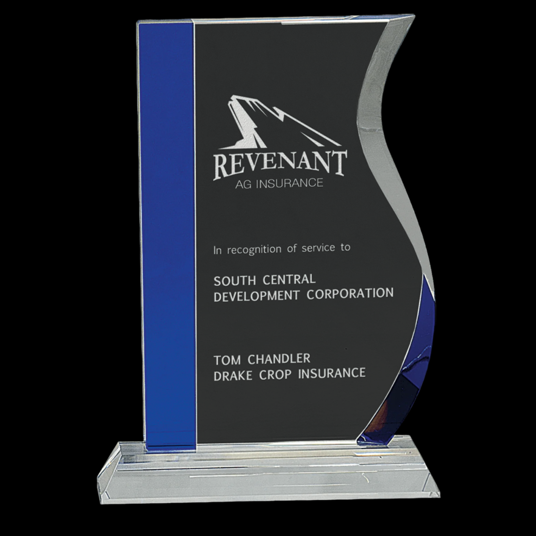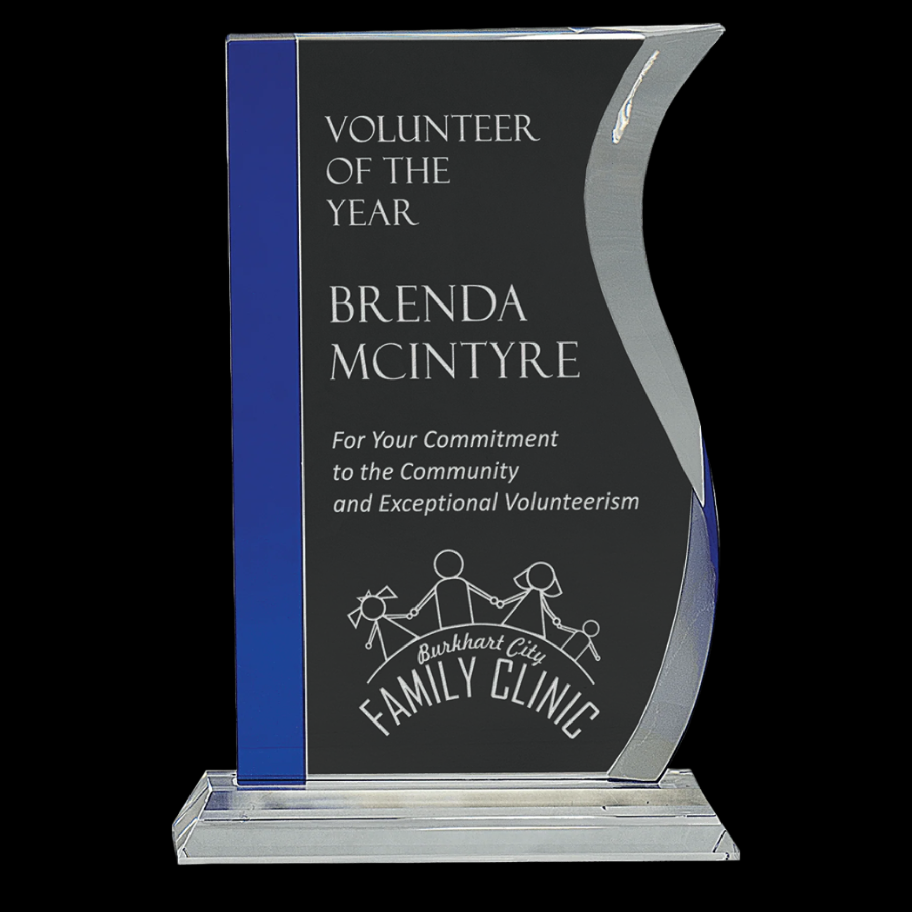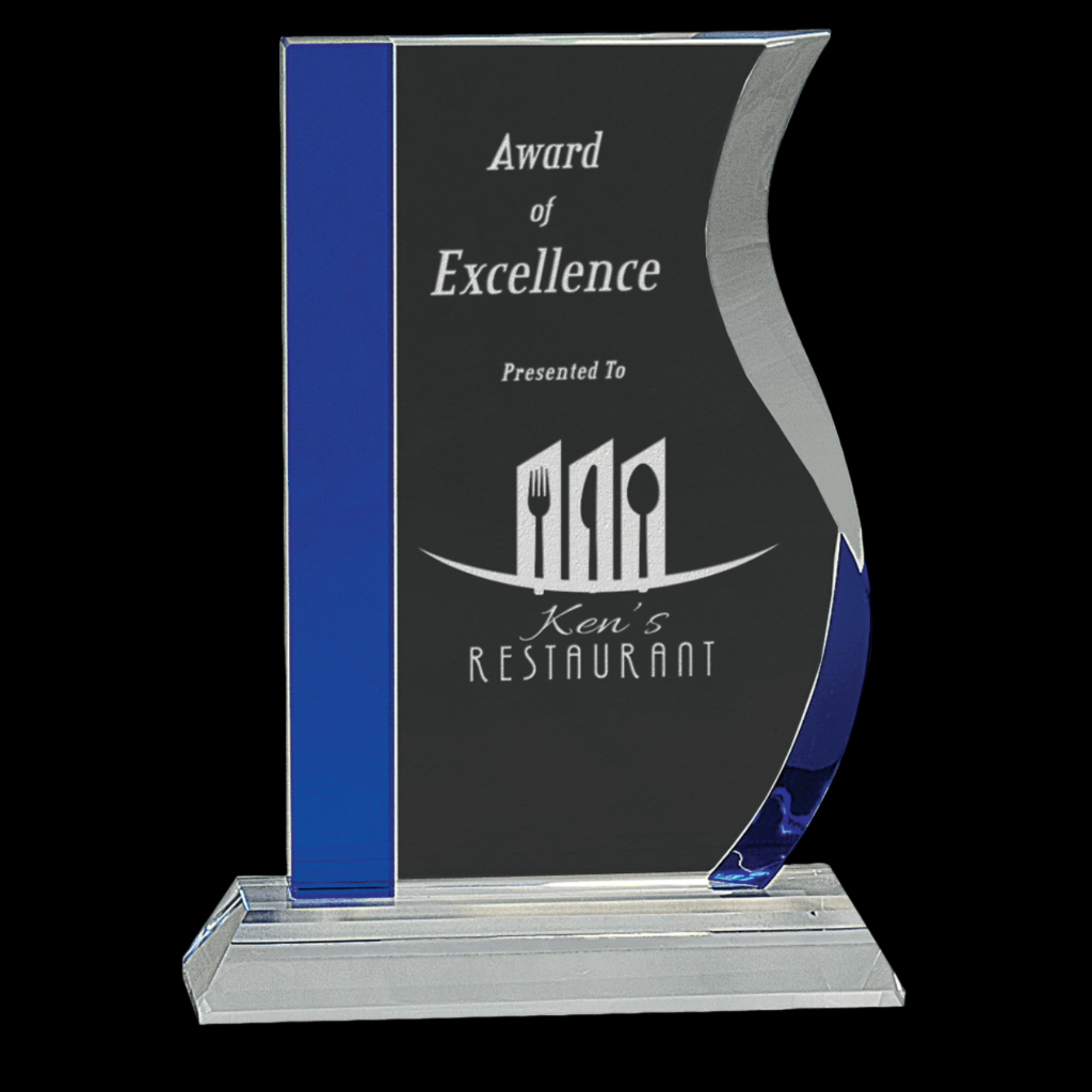 Our Crystal Awards are Handmade and May Vary Slightly in Size. Clear Optic Crystal Wave with Decorative Blue Edge Attached to Clear Base. Packaged in a Lined Gift Box.