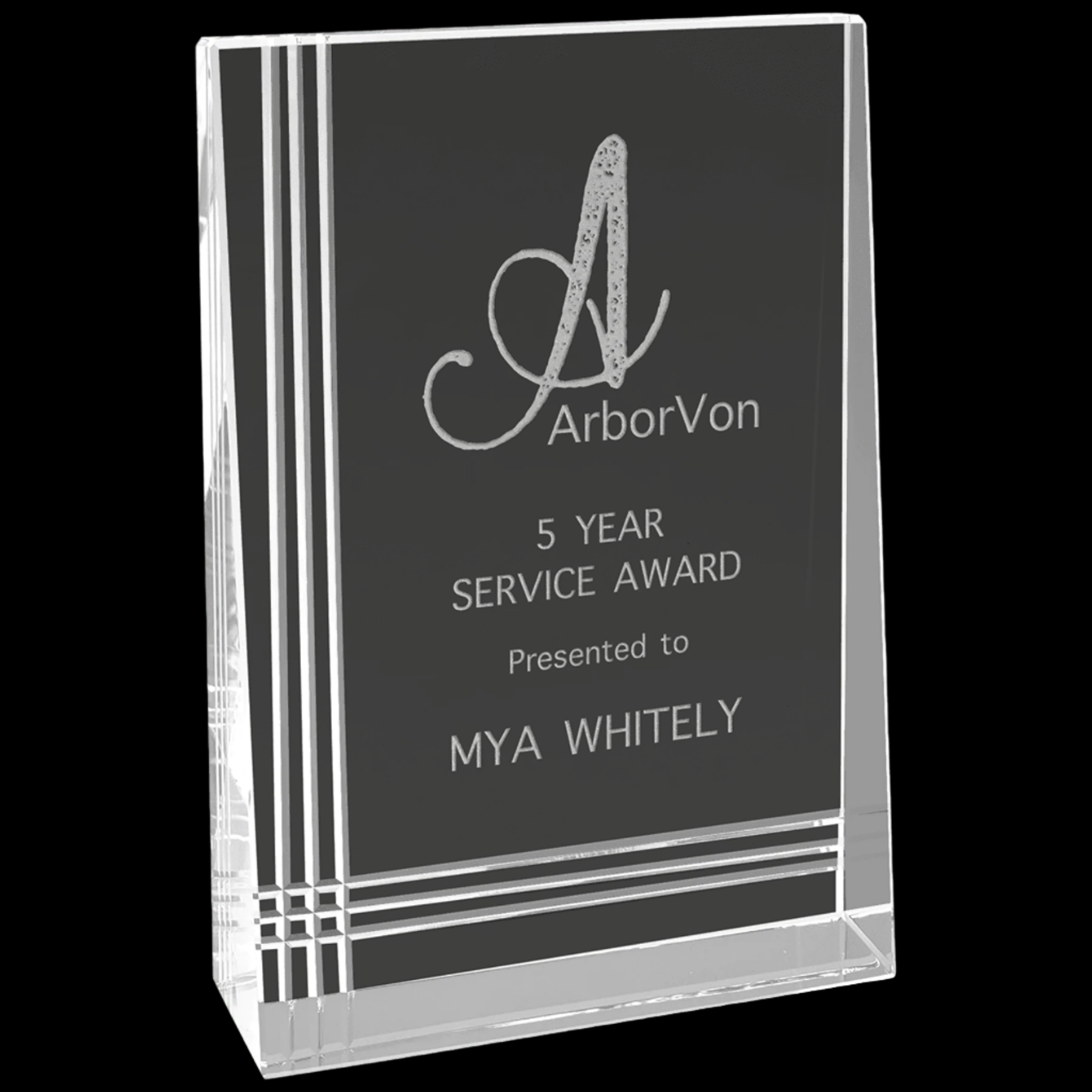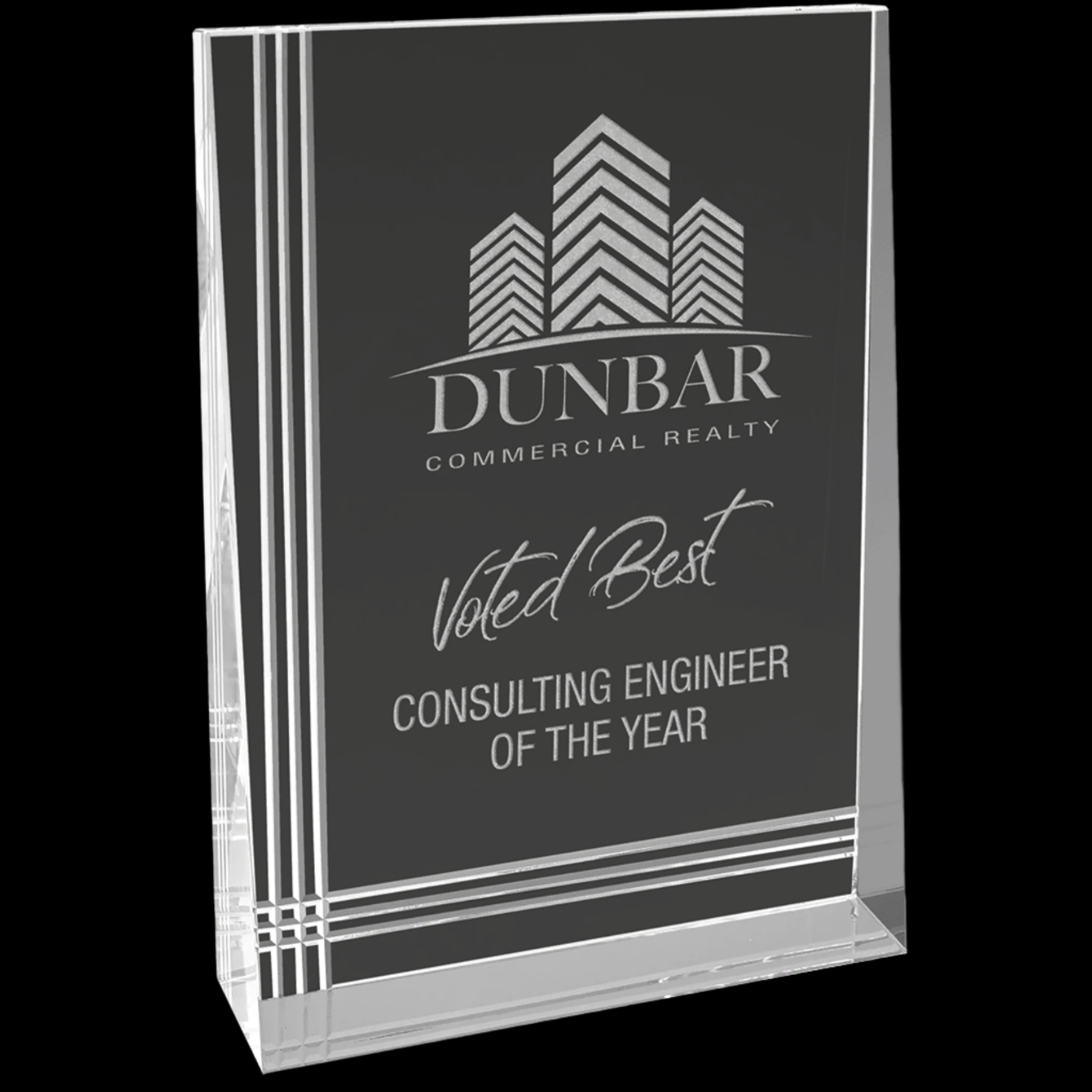 Our Crystal Wedge is expertly handcrafted, ensuring each piece is unique with slight size variations. Featuring an optic crystal design with elegant decorative lines, it can be displayed alone or mounted on a base for added presence. Each award is carefully packaged in a lined gift box, making it an ideal choice for distinguished recognition.