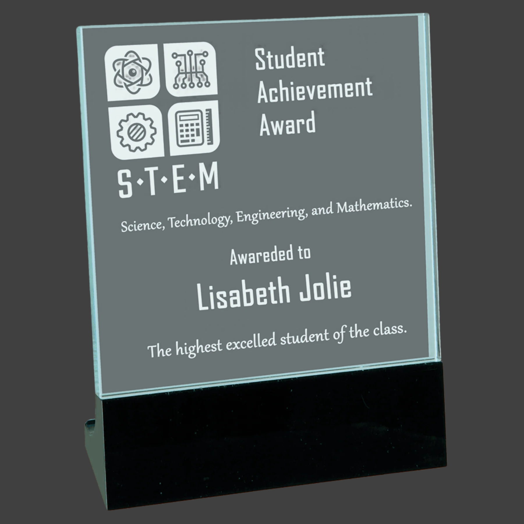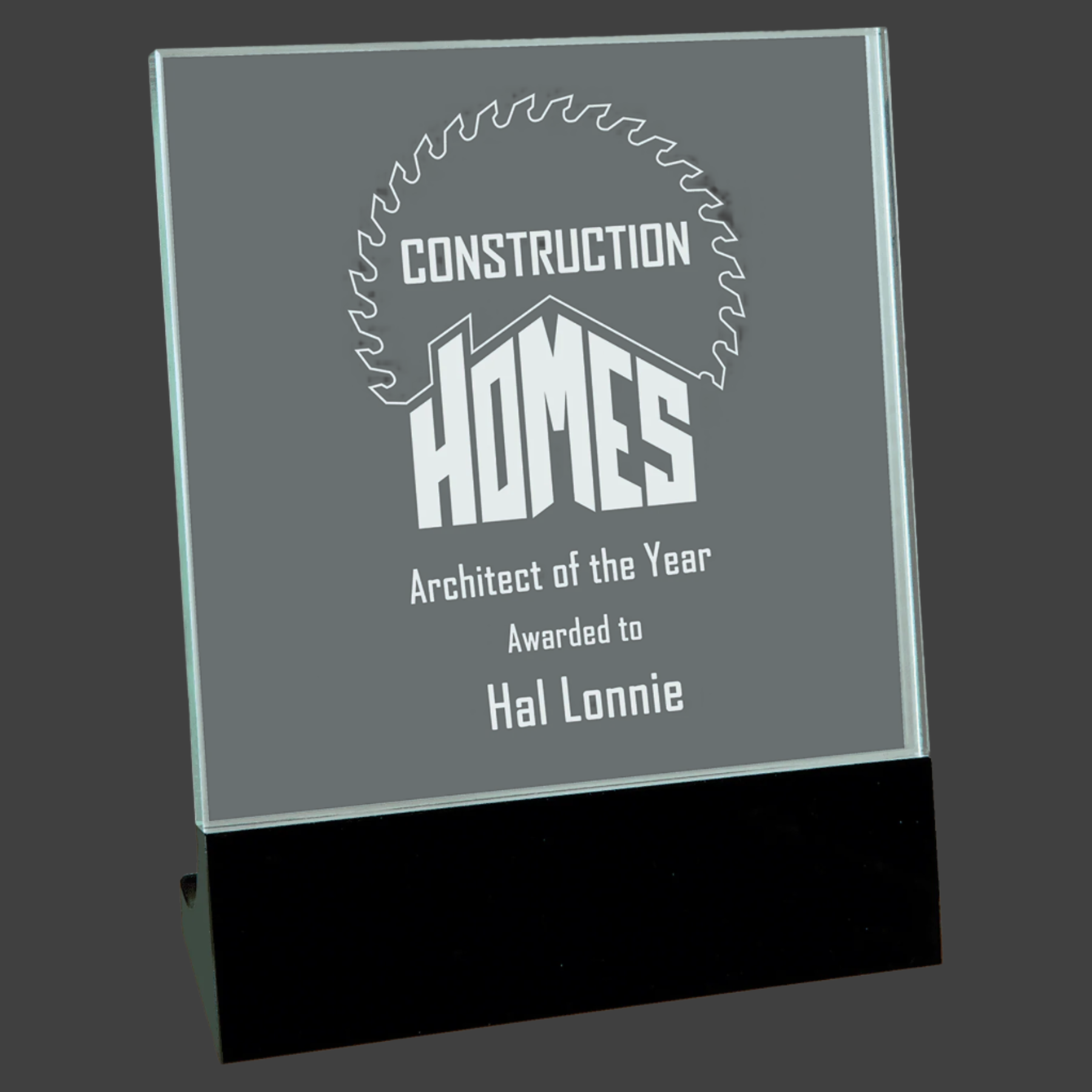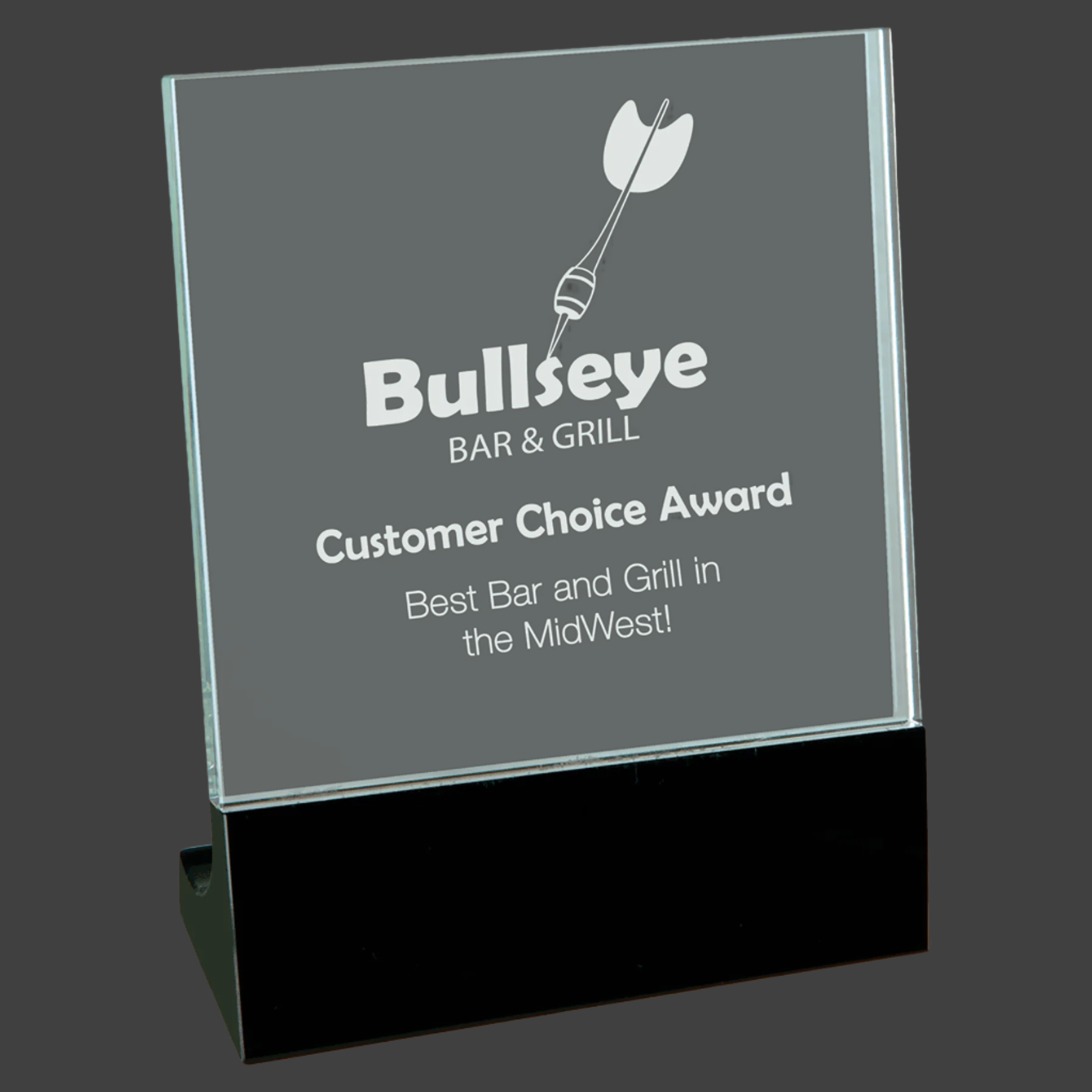 Glass Stand-Ups feature a sturdy black crystal base paired with .375" thick glass, ensuring durability and a sleek appearance. Available in three sizes, these stand-ups offer versatile options for display or presentation needs, combining strength with elegant design.